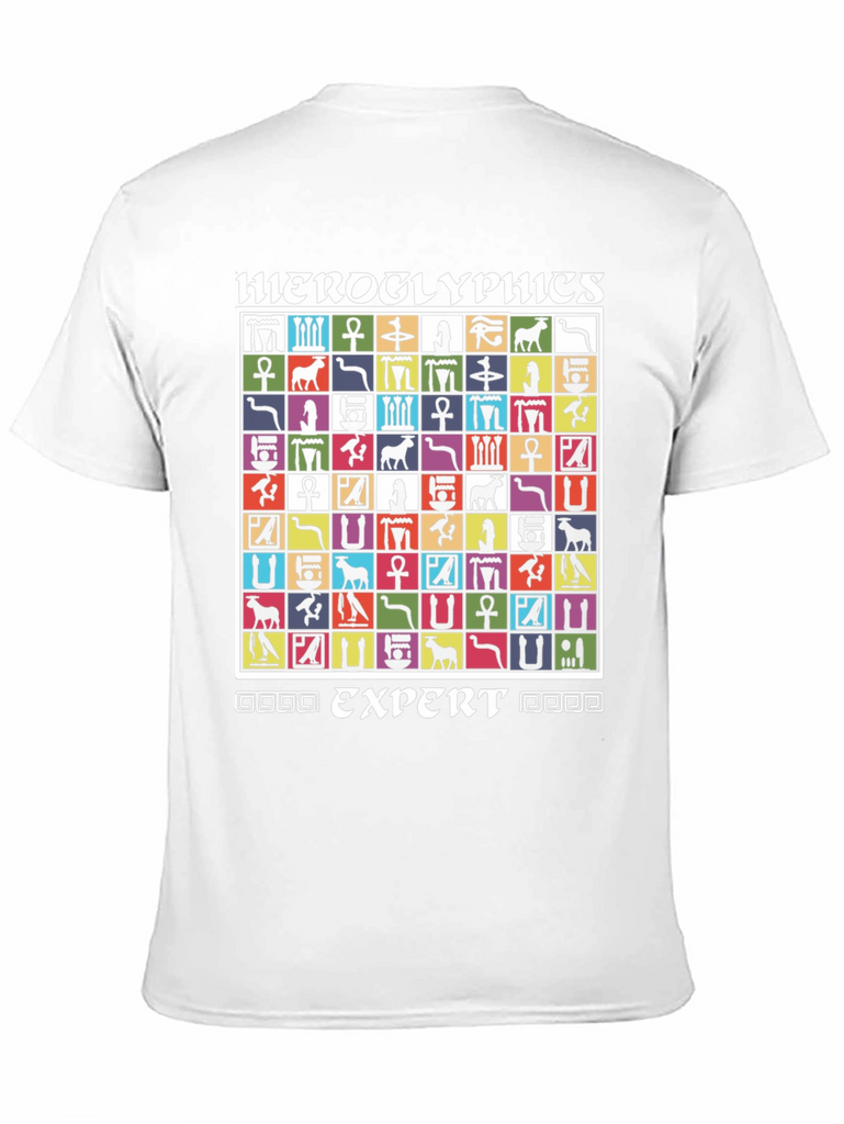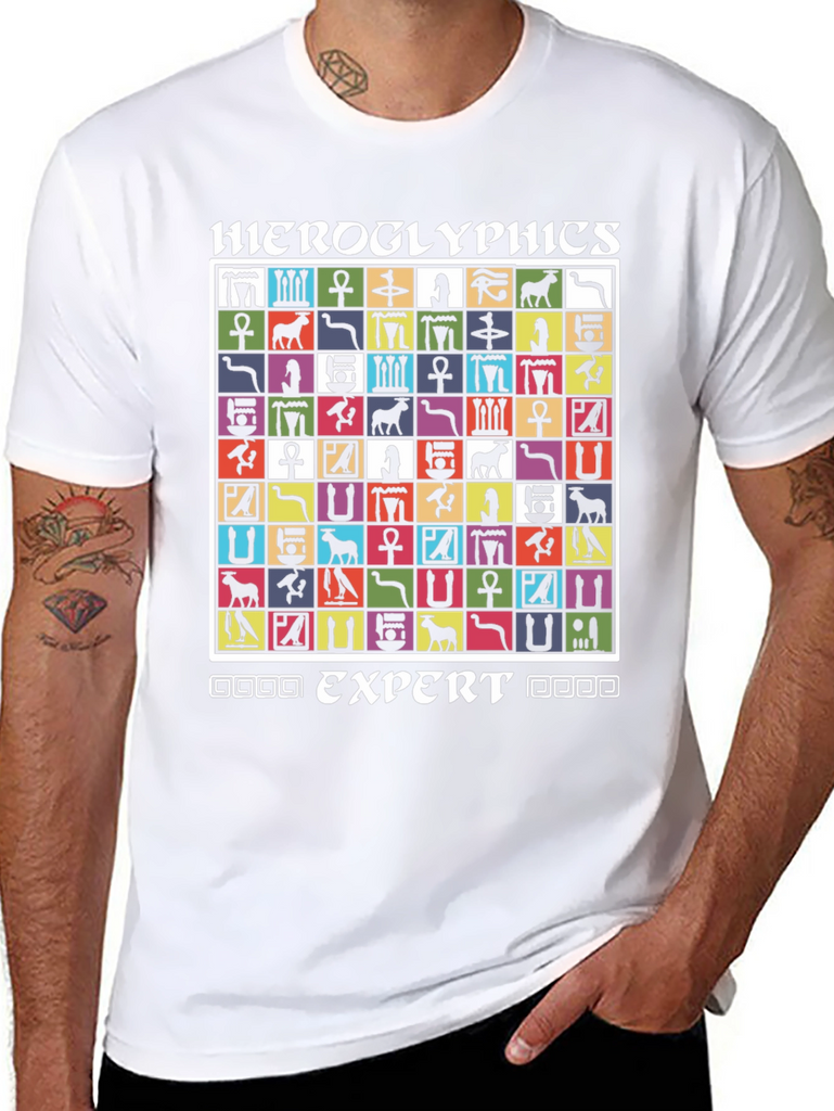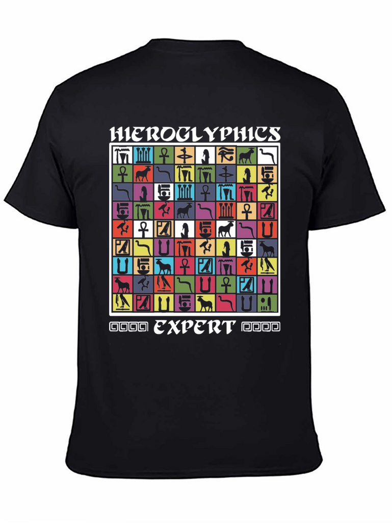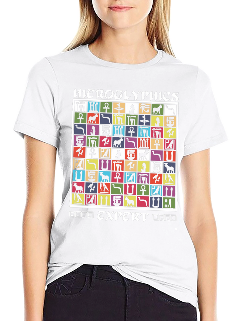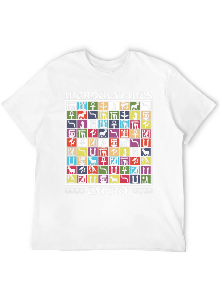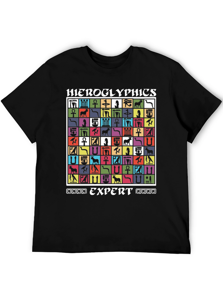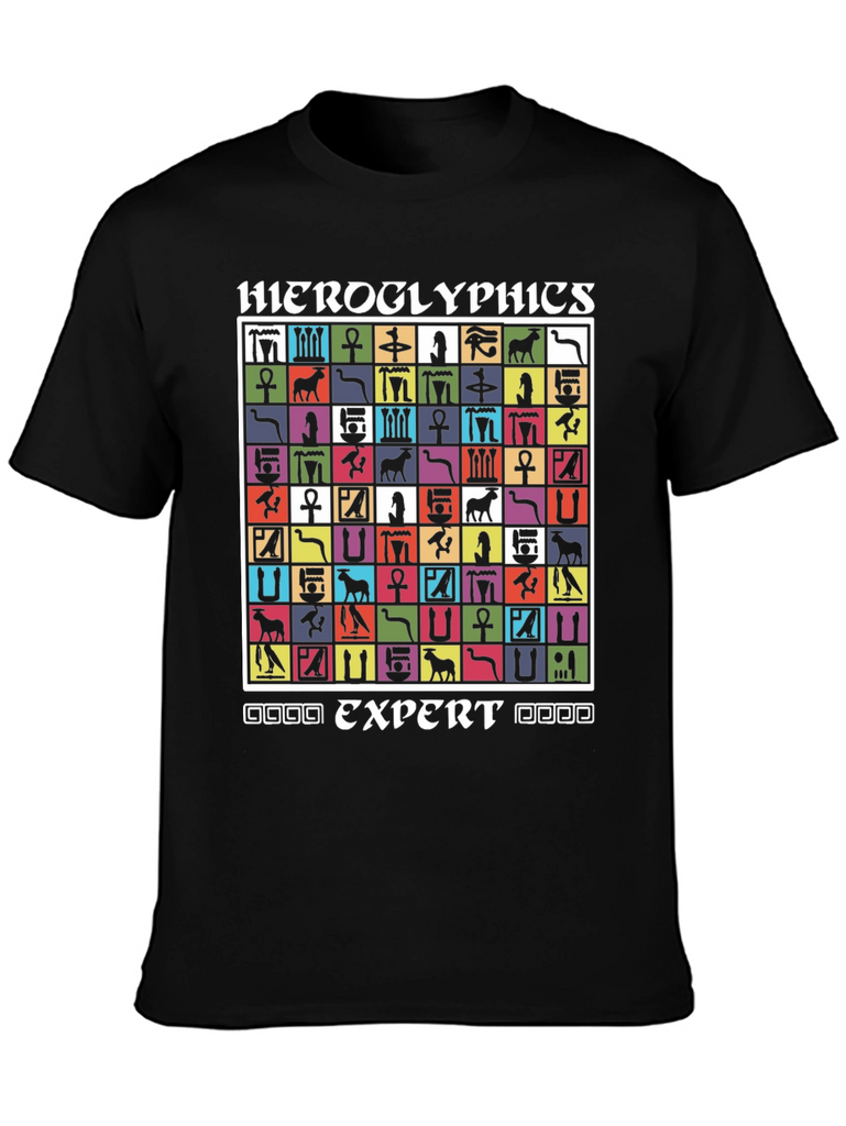 Show off your knowledge of ancient Egypt with this Hieroglyphics Expert T-shirt. This eye-catching tee features a colorful grid of Egyptian hieroglyphs. Made of a comfortable, breathable fabric. Perfect for history buffs, archaeologists, or anyone with an appreciation for ancient cultures. Wear it casually or dress it up for a unique and conversation-starting look. Let everyone know you are a Hieroglyphics Expert with this eye-catching shirt. A great gift for that student or history lover.