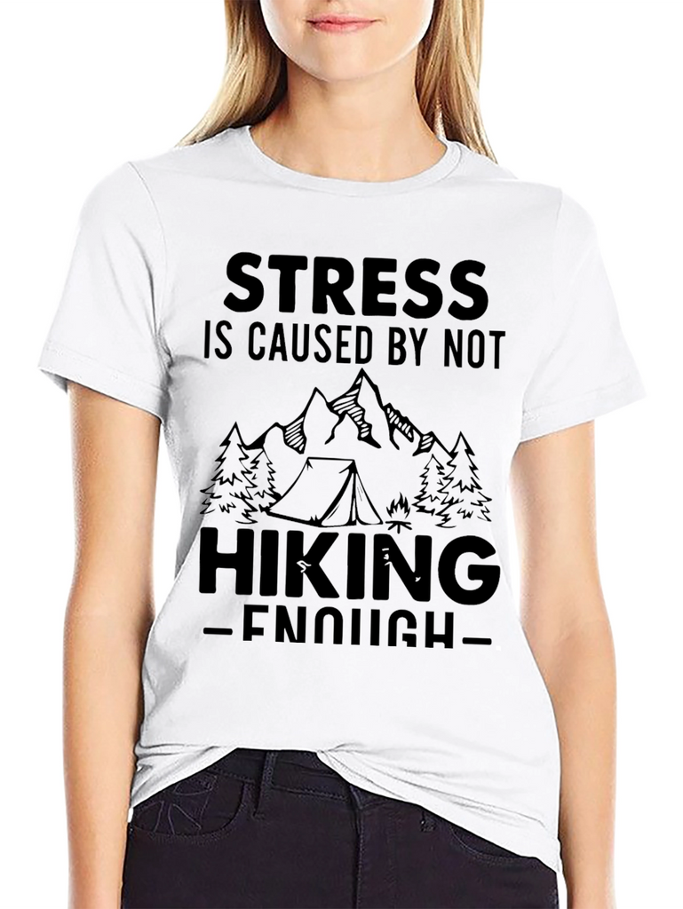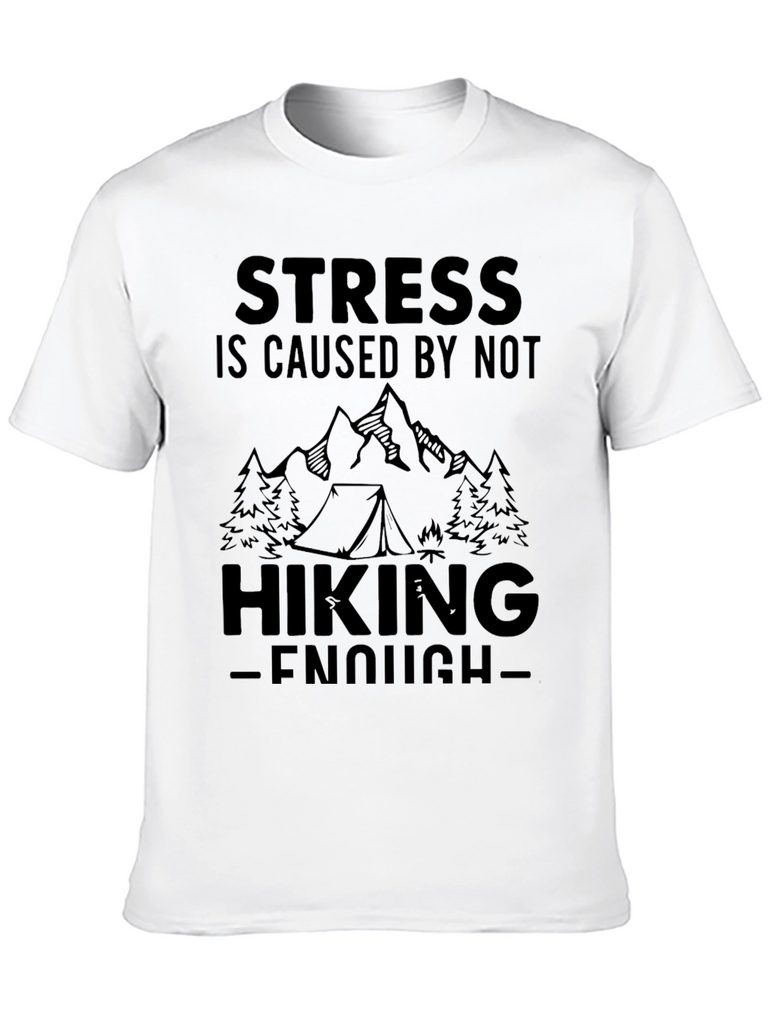 This black t-shirt features a bold, graphic print perfect for hiking enthusiasts. The design proclaims "STRESS IS CAUSED BY NOT HIKING ENOUGH" above and below a mountain and forest landscape with a tent, creating a humorous and relatable message for outdoor lovers. Made from a comfortable material, this tee is ideal for casual wear, outdoor adventures, or simply expressing your passion for hiking. Wear it on the trails, around town, or as a conversation starter at your next camping trip. Show off your love for the great outdoors with this unique and stylish t-shirt.