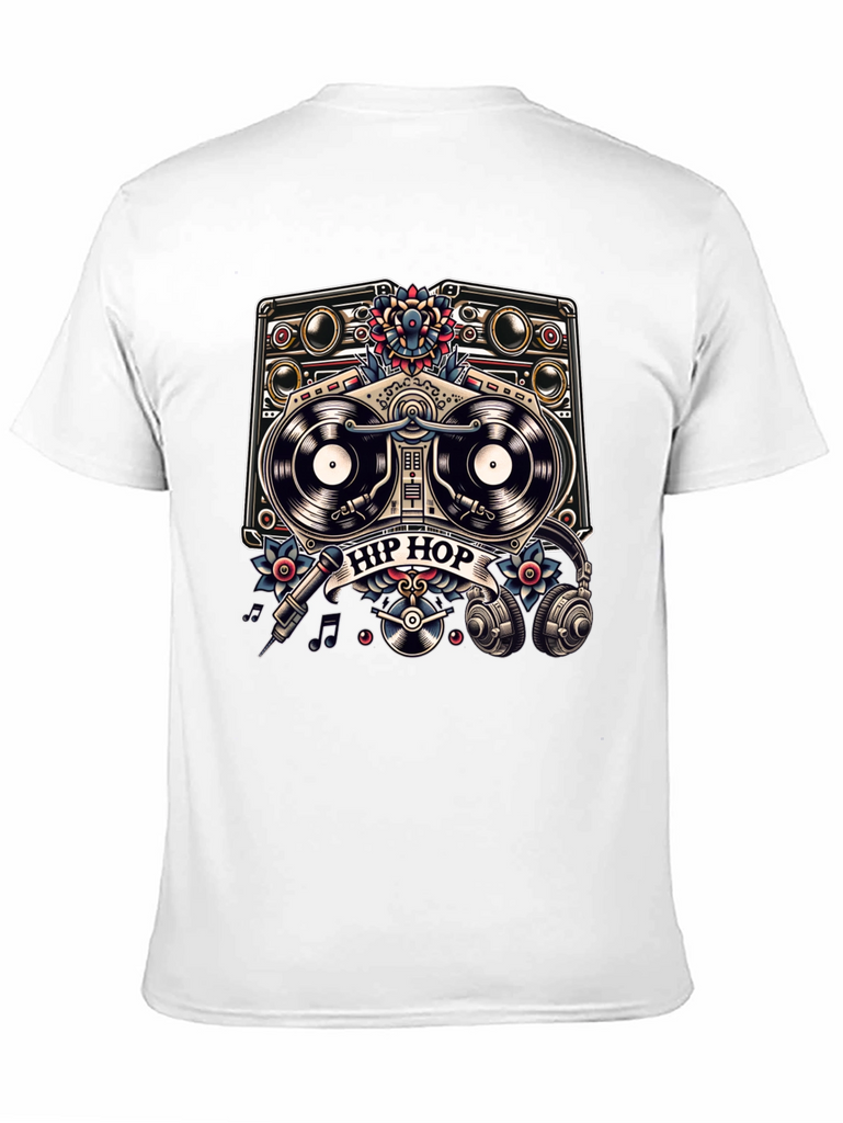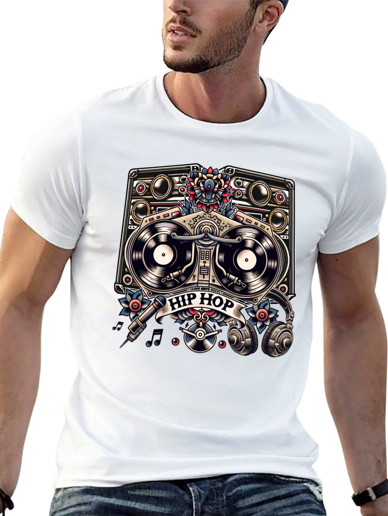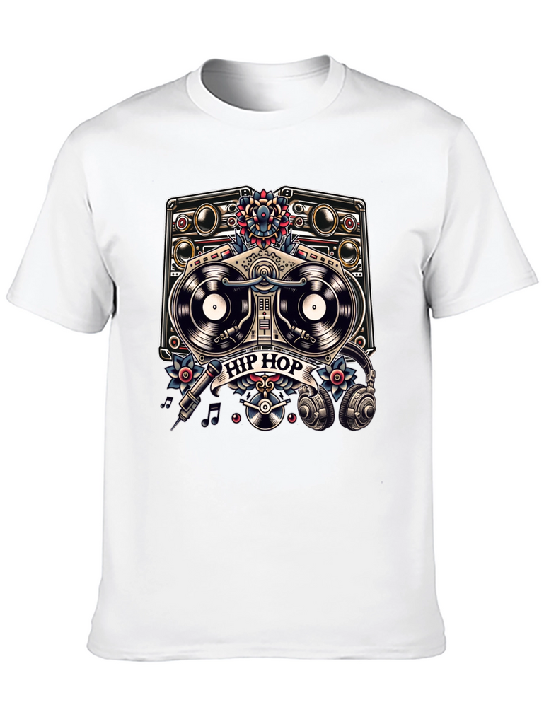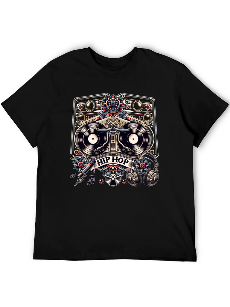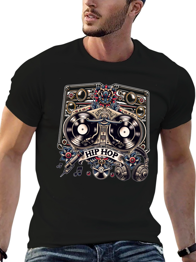 Rock a retro vibe with this eye-catching black t-shirt. This garment features a vibrant graphic design centered on the chest. The unique illustration incorporates elements of vintage boomboxes, turntables, headphones, musical notes, and the words "Hip Hop." The design is a bold, colorful statement piece. It makes a stylish choice for music lovers and anyone who appreciates old-school hip hop culture. Made from a soft, comfortable fabric, it's perfect for everyday wear. Elevate your casual style with this standout tee!