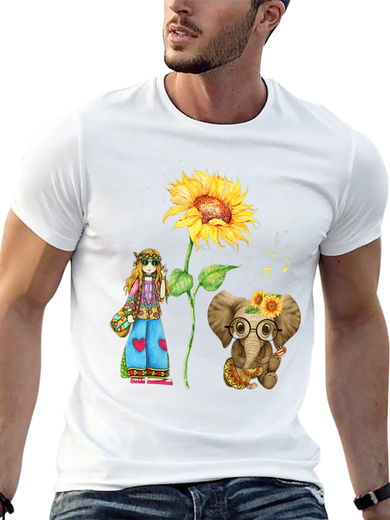 Embrace a touch of whimsy with this unique graphic tee. The black shirt features a vibrant illustration of a tall sunflower, a playful hippie girl with flowers in her hair, and an adorable elephant wearing glasses and playing a guitar. The design is colorful and eye-catching. Made from a soft, comfortable fabric, this tee is perfect for everyday wear. Show off your free spirit and love for nature with this charming and expressive shirt. A perfect addition to any casual wardrobe.