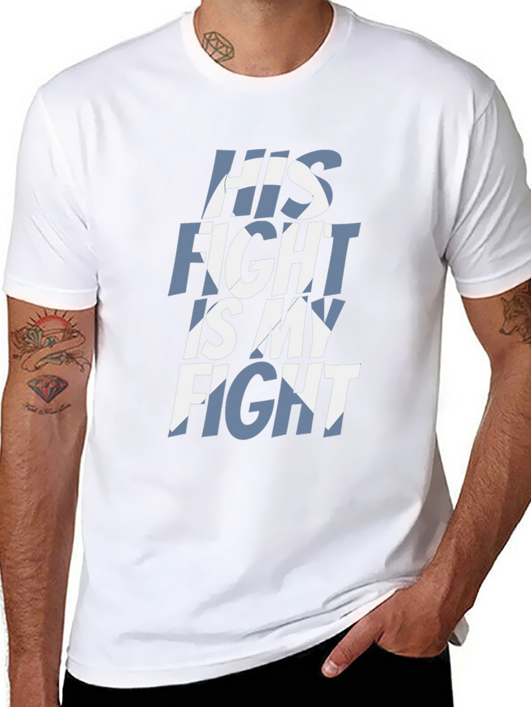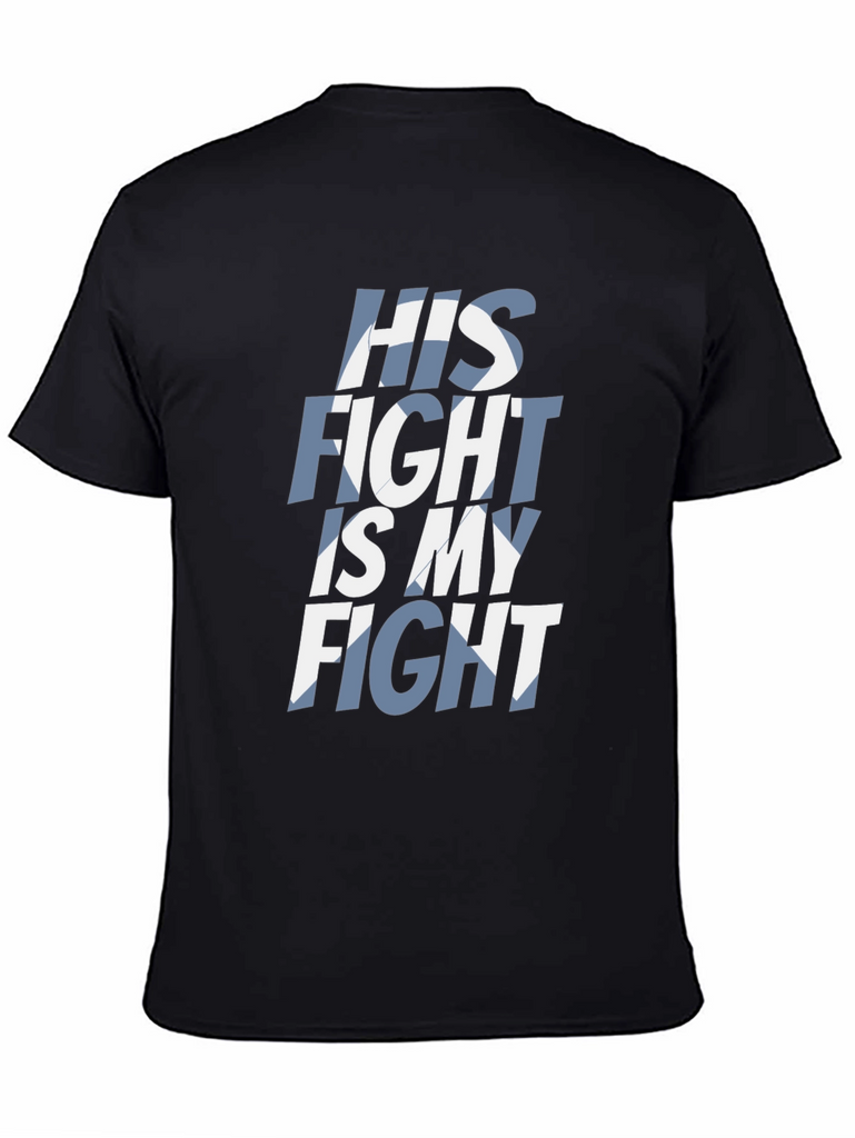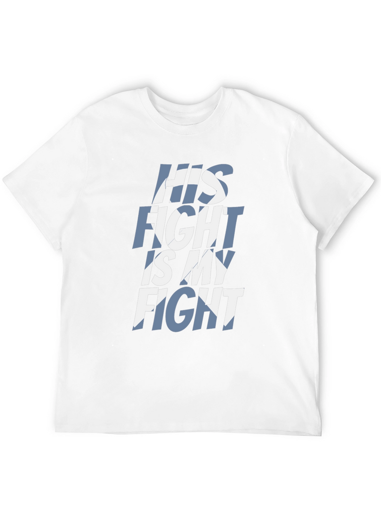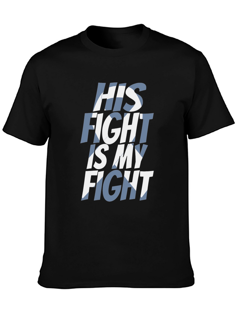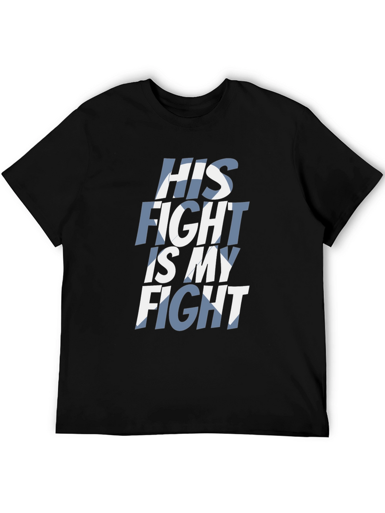 Show your support with this bold graphic tee. Made from a comfortable, breathable fabric, this black t-shirt features the powerful statement "His Fight Is My Fight" in a layered blue and white design. The classic fit and short sleeves make it ideal for everyday wear, rallies, or showing solidarity. A striking way to stand with loved ones and raise awareness.