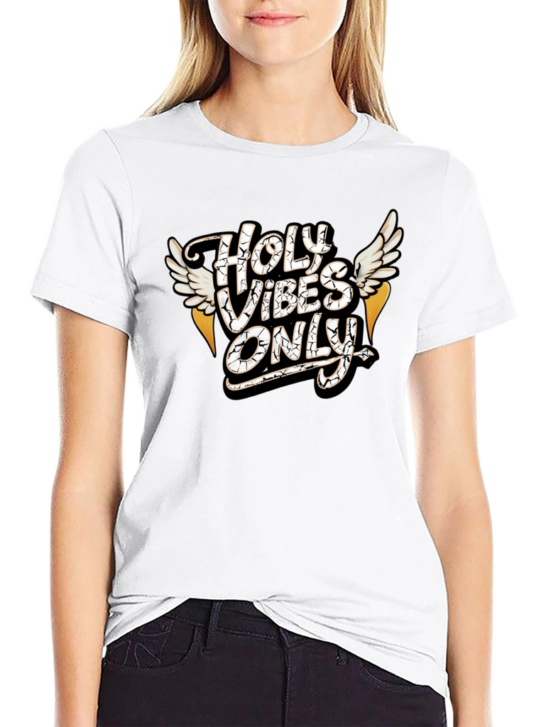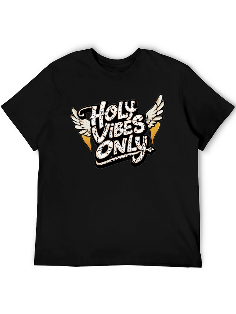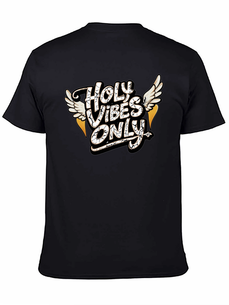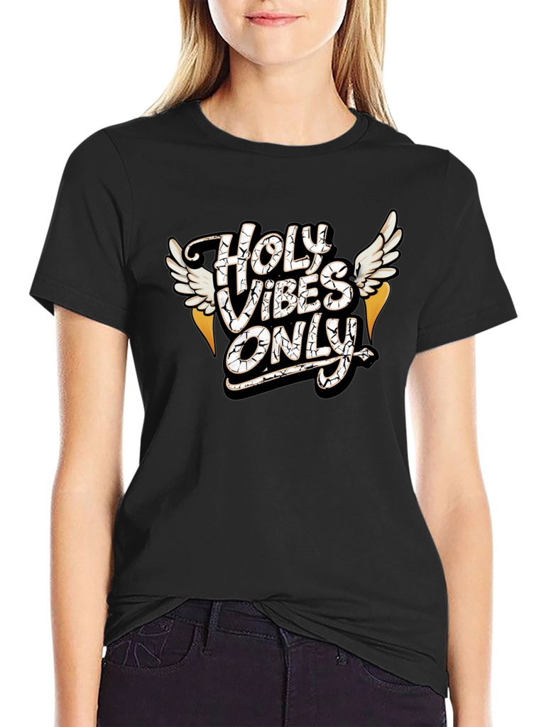 Elevate your wardrobe with this stylish black t-shirt featuring a unique "Holy Vibes Only" graphic. The design incorporates angel wings, adding a touch of ethereal flair. Crafted from a comfortable, breathable fabric, this tee is perfect for everyday wear. Its eye-catching design makes it ideal for casual outings, social gatherings, or simply expressing your positive outlook. Pair it with jeans, shorts, or a skirt for a versatile and trendy look. Show off your faith with this bold statement piece.
