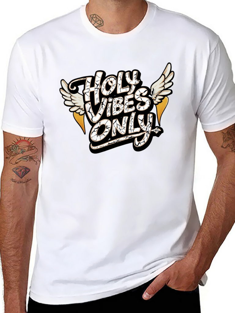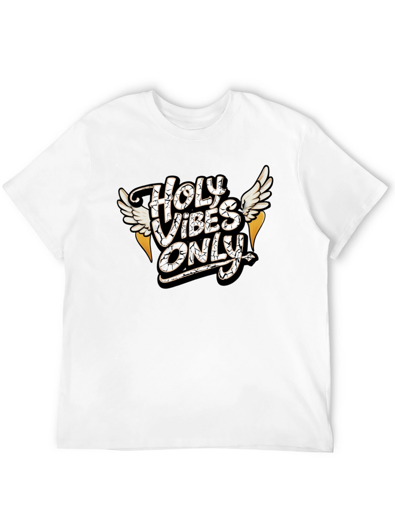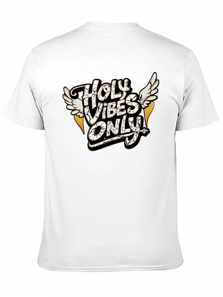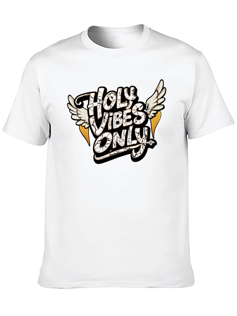 Elevate your wardrobe with this stylish black t-shirt featuring a unique "Holy Vibes Only" graphic. The design incorporates angel wings, adding a touch of ethereal flair. Crafted from a comfortable, breathable fabric, this tee is perfect for everyday wear. Its eye-catching design makes it ideal for casual outings, social gatherings, or simply expressing your positive outlook. Pair it with jeans, shorts, or a skirt for a versatile and trendy look. Show off your faith with this bold statement piece.