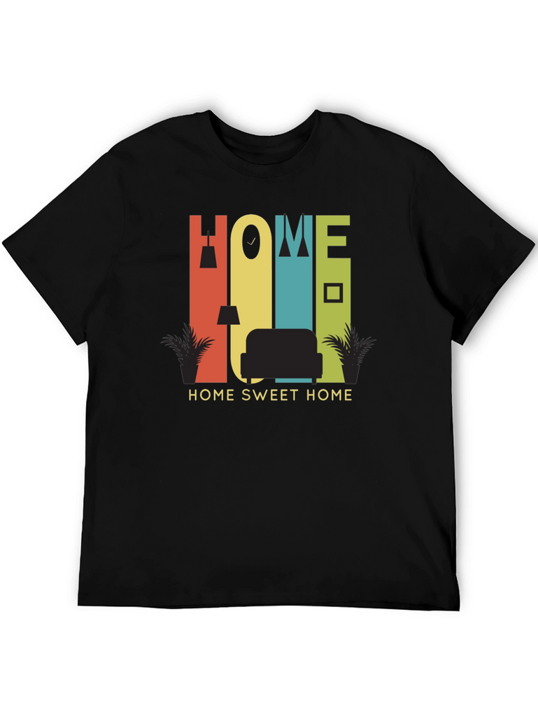 Show off your love for home with this stylish black graphic tee. It features a colorful retro-inspired design with the word 'HOME' incorporated into the image of a living room setup, complete with a sofa, lamps, plants, and a decorative frame. The phrase "Home Sweet Home" is printed below the graphic. Made from a soft, comfortable fabric, this t-shirt is perfect for lounging around the house or casual outings. Express your cozy style with this eye-catching design that's sure to spark conversation. Get yours now and let everyone know where your heart truly belongs – at home!