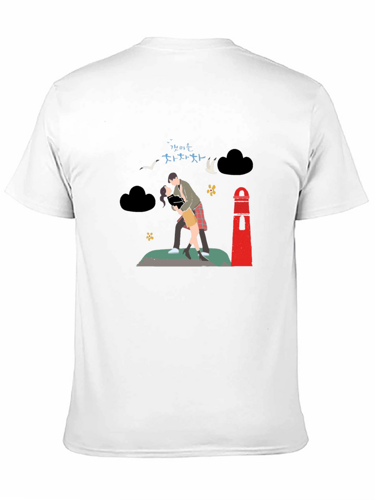 Show your love for Hometown Cha-Cha-Cha with this stylish black t-shirt. Featuring a charming illustration of the drama's beloved couple against a scenic backdrop with the lighthouse. Made from comfortable, breathable fabric, this tee is perfect for everyday wear or as a standout piece at fan gatherings. The print captures the heartwarming essence of the series, making it a must-have for fans and those who love Korean dramas. Embrace the romance and charm of Gongjin with this unique and delightful t-shirt!