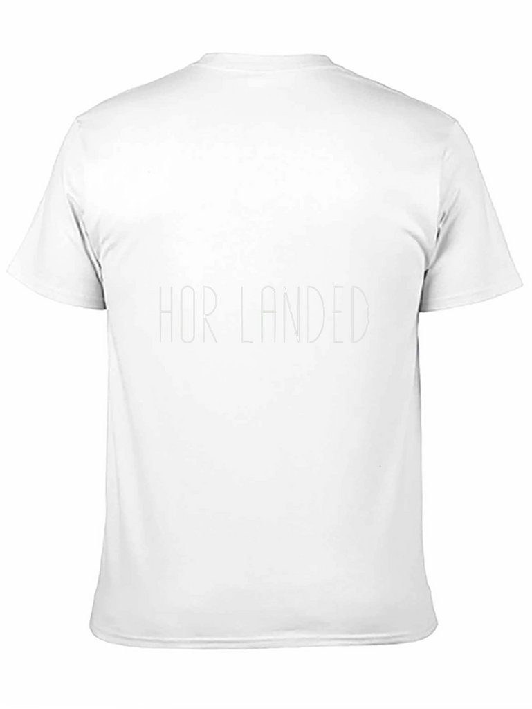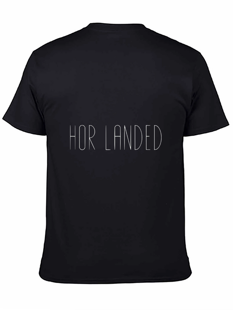 Showcase your style with this modern "Hor Landed" graphic tee. The t-shirt features a minimalist design with the text horizontally displayed across the chest. This shirt is made from a soft, comfortable fabric, and its classic crew neck and short sleeve design make it a versatile addition to any wardrobe. Dress it up with a jacket or wear it casually with jeans. Perfect for everyday wear or expressing your personal style.