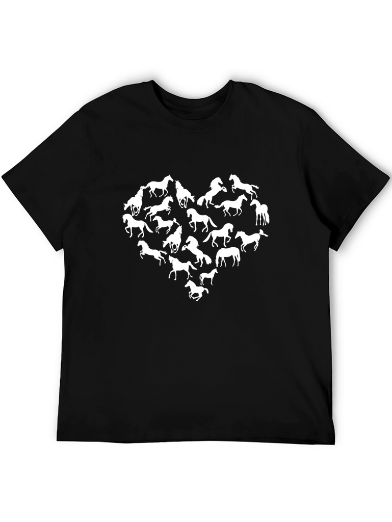 Show your love for horses with this stylish black t-shirt. The shirt features a unique heart-shaped design made up of silhouettes of various horses. Crafted from a soft, comfortable fabric, this tee is perfect for everyday wear. The crisp white graphic stands out boldly against the dark background, making it a real statement piece. Ideal for horse lovers, casual outings, or simply expressing your passion, this tee is sure to become a favorite. Dress it up or down - a great addition to any wardrobe!