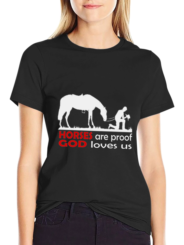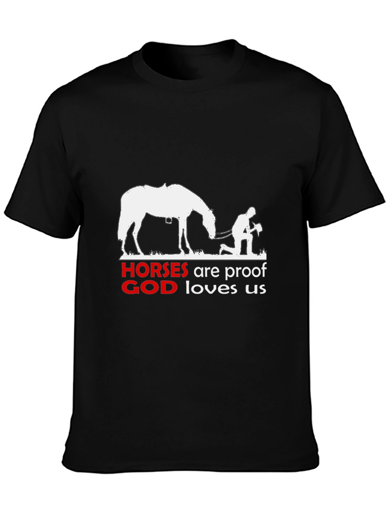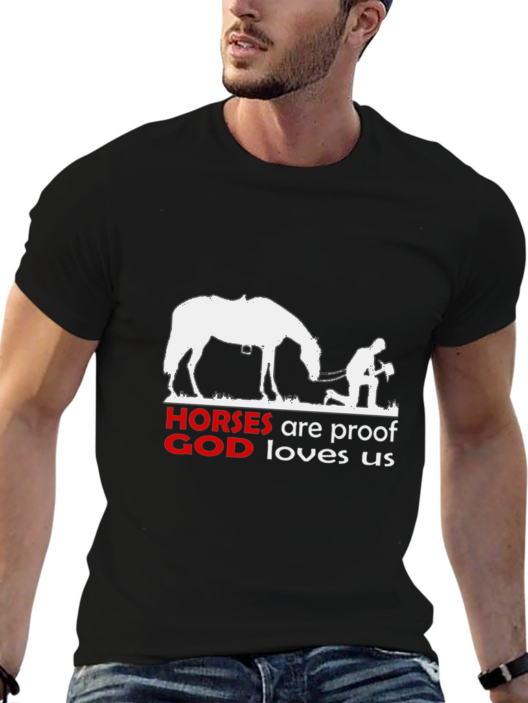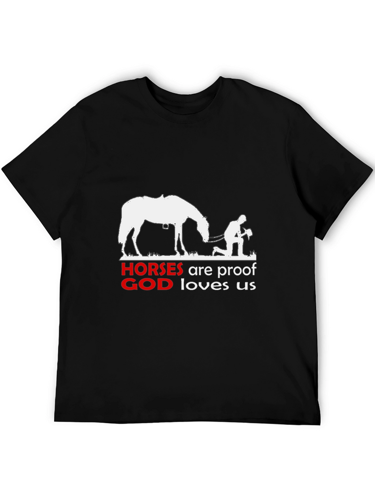 Show your love for horses and faith with this unique t-shirt. The design features a white silhouette of a horse and kneeling figure, accompanied by the text "HORSES are proof GOD loves us" in a bold red and white font. Made from a comfortable, dark-colored fabric, this tee is perfect for casual wear, equestrian events, or simply expressing your passions. The short-sleeved design makes it ideal for warmer weather. A great conversation starter and a must-have for horse lovers with a spiritual side.