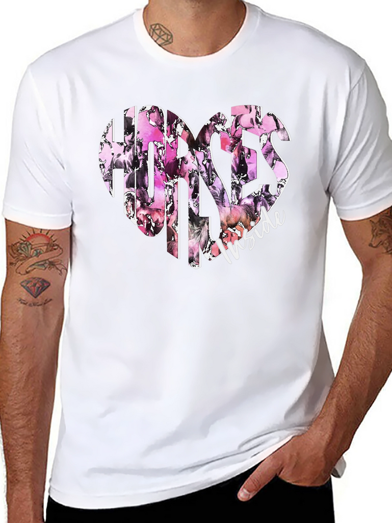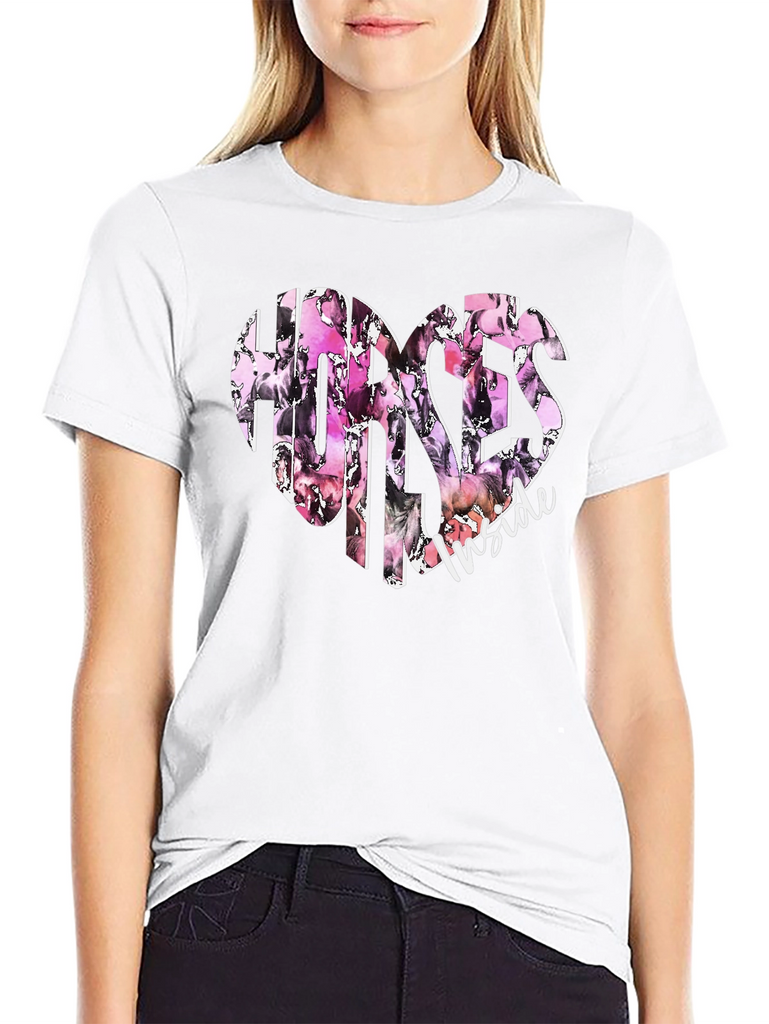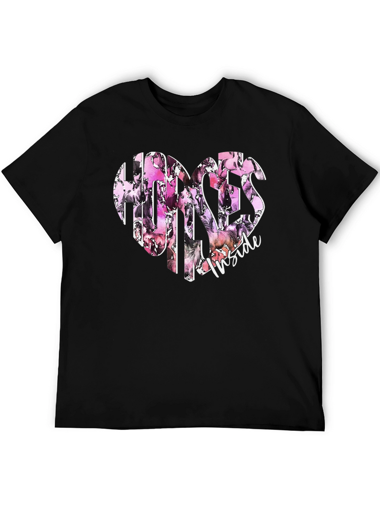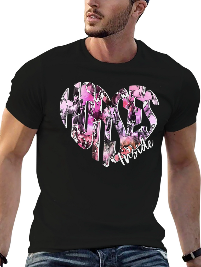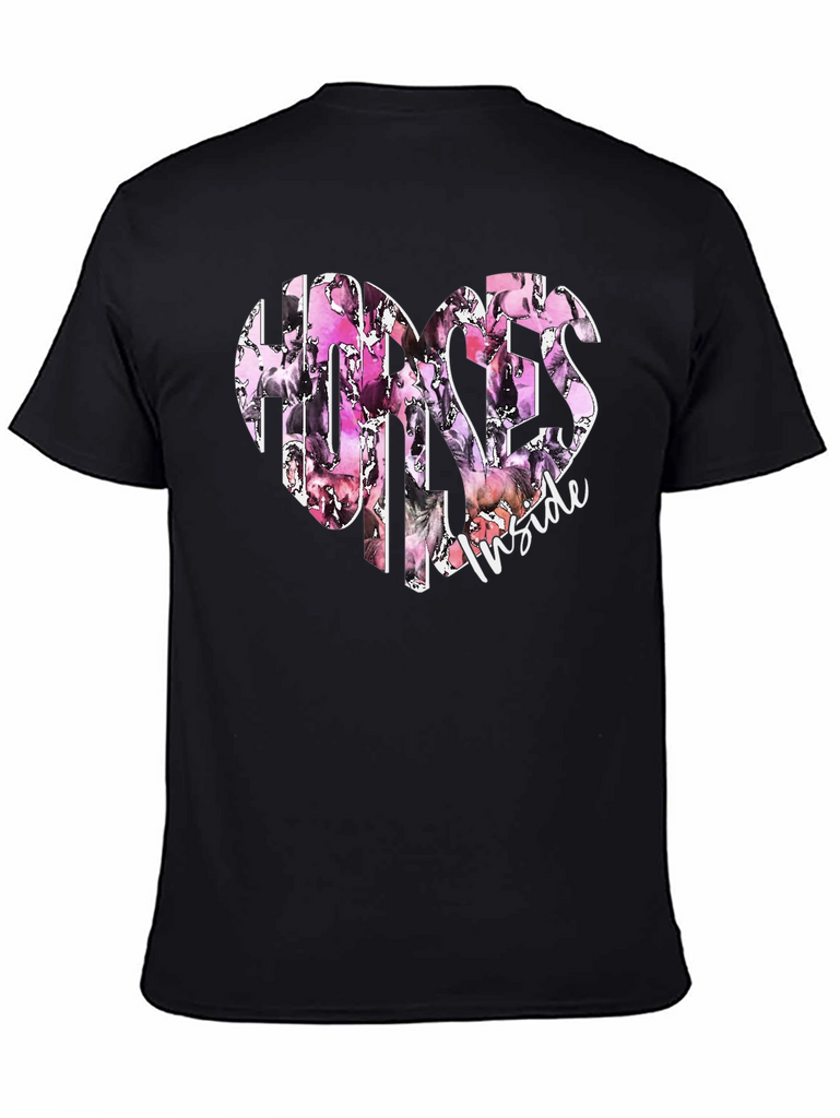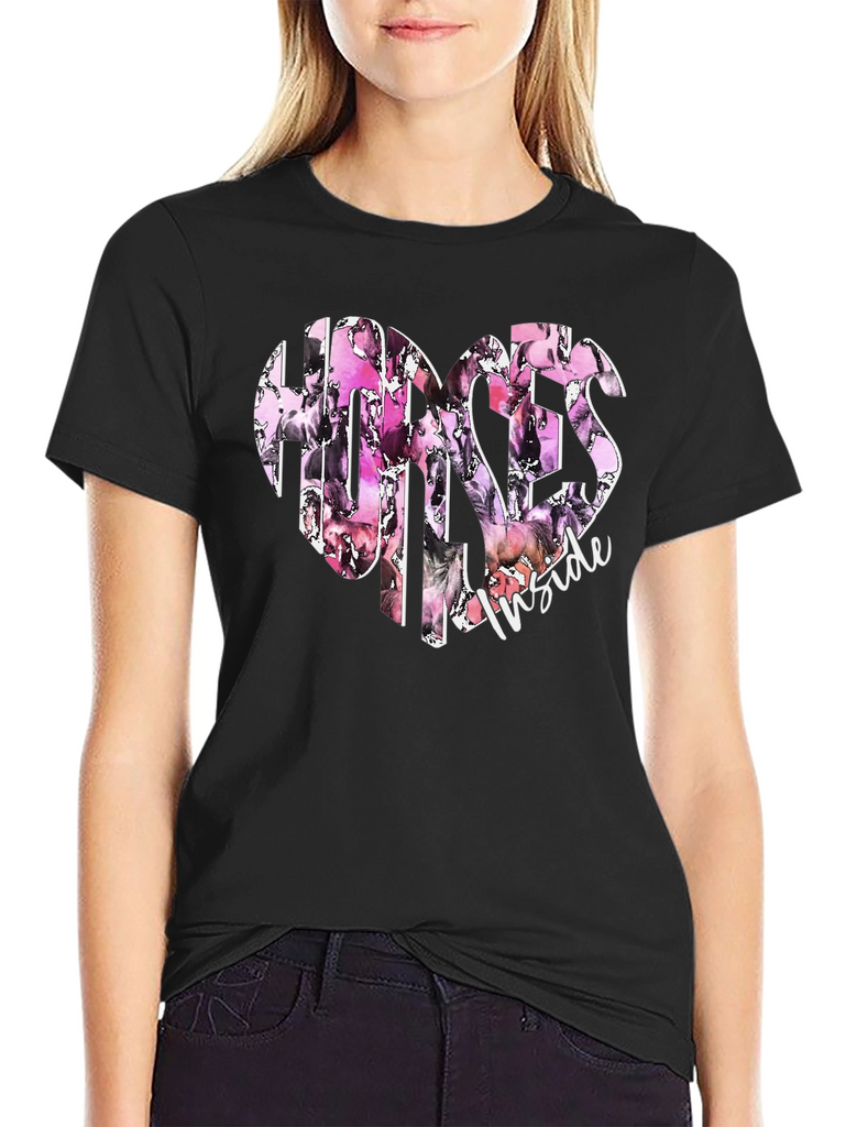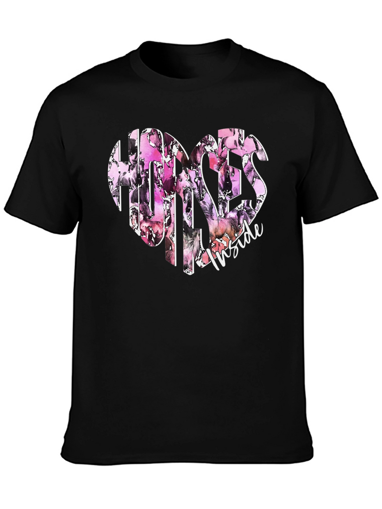 Show your love for horses with this stylish black t-shirt. The unique heart-shaped graphic is filled with a beautiful collage of horses, creating a visually appealing design. 'Horses Inside' is elegantly incorporated into the heart, adding a playful touch. Made from comfortable materials, this tee is perfect for casual wear or a day at the stables. Express your passion for these majestic animals with this eye-catching and comfortable t-shirt. Ideal for horse lovers of all ages.