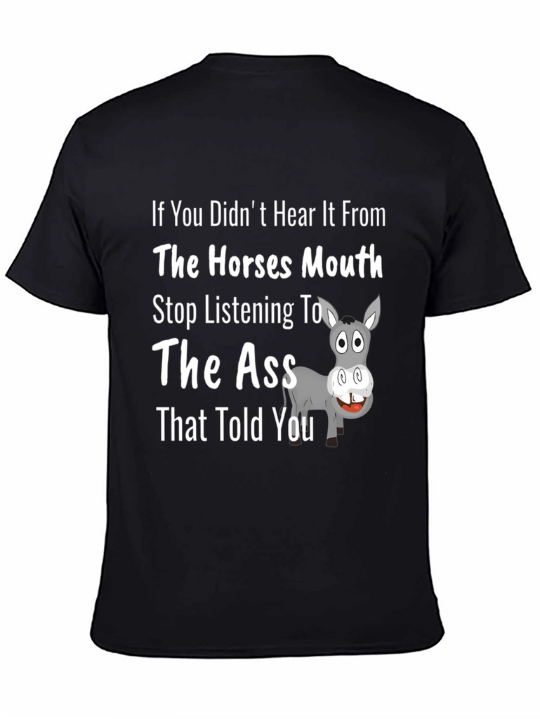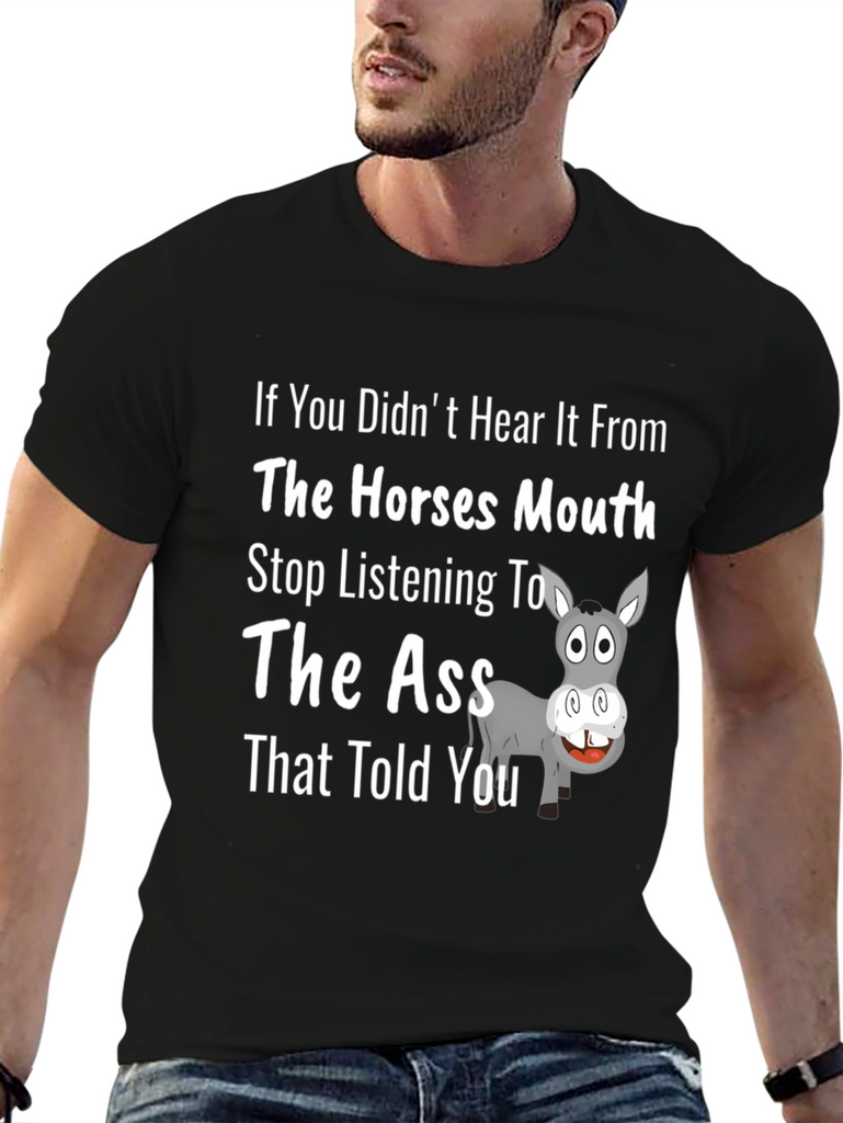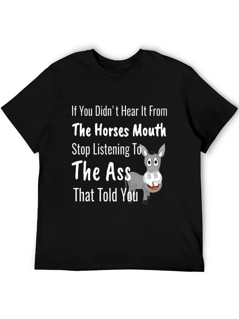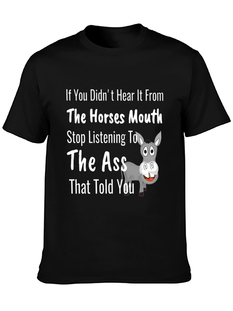 This black t-shirt features a humorous graphic print. The design includes the phrase 'If You Didn't Hear It From The Horses Mouth Stop Listening To The Ass That Told You' with a cartoon donkey. Made from soft, breathable fabric, this tee provides all-day comfort and a casual fit. Ideal for everyday wear, parties, or novelty gifts. This funny shirt is perfect for making a statement and showing off your unique sense of humor. Its amusing design is sure to spark conversations and bring a lighthearted touch to any occasion.