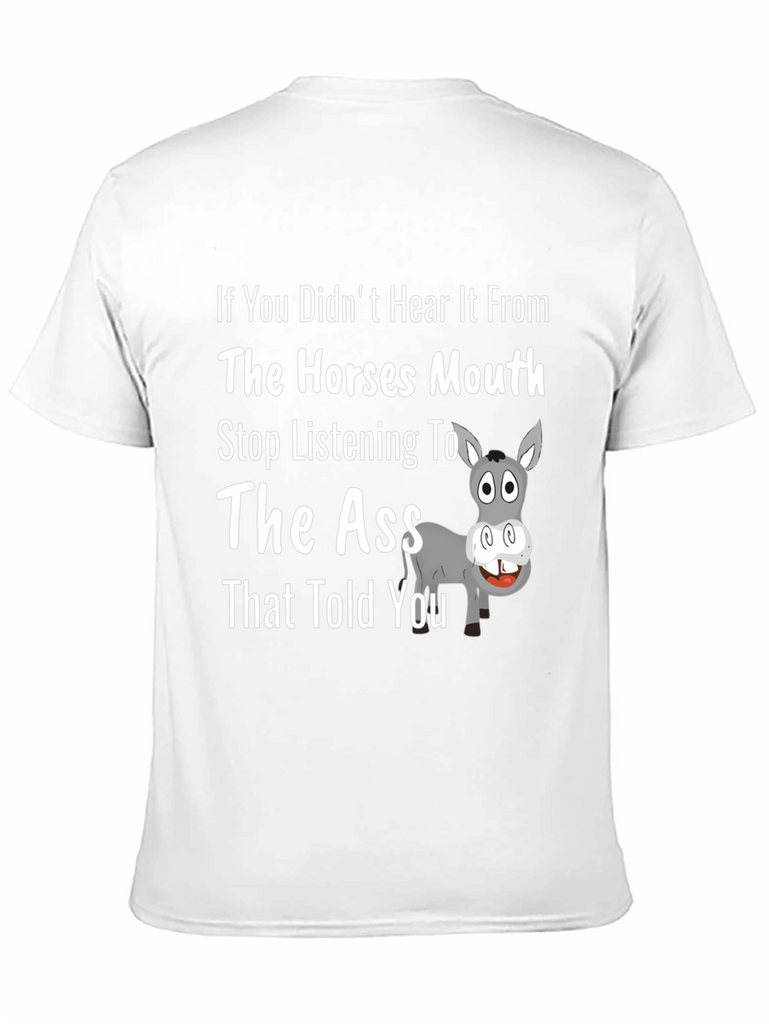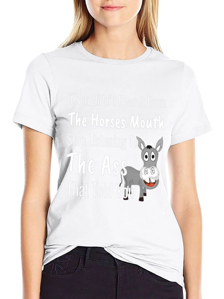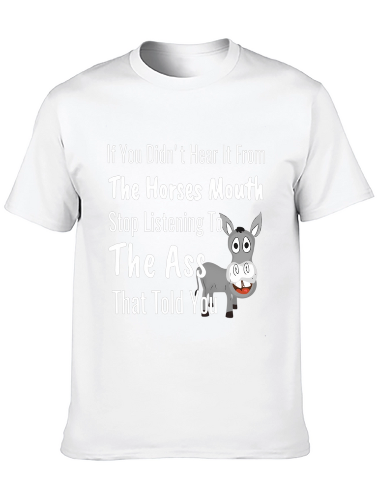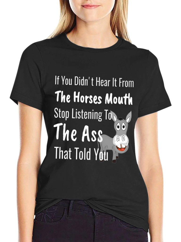 This black t-shirt features a humorous graphic print. The design includes the phrase 'If You Didn't Hear It From The Horses Mouth Stop Listening To The Ass That Told You' with a cartoon donkey. Made from soft, breathable fabric, this tee provides all-day comfort and a casual fit. Ideal for everyday wear, parties, or novelty gifts. This funny shirt is perfect for making a statement and showing off your unique sense of humor. Its amusing design is sure to spark conversations and bring a lighthearted touch to any occasion.
