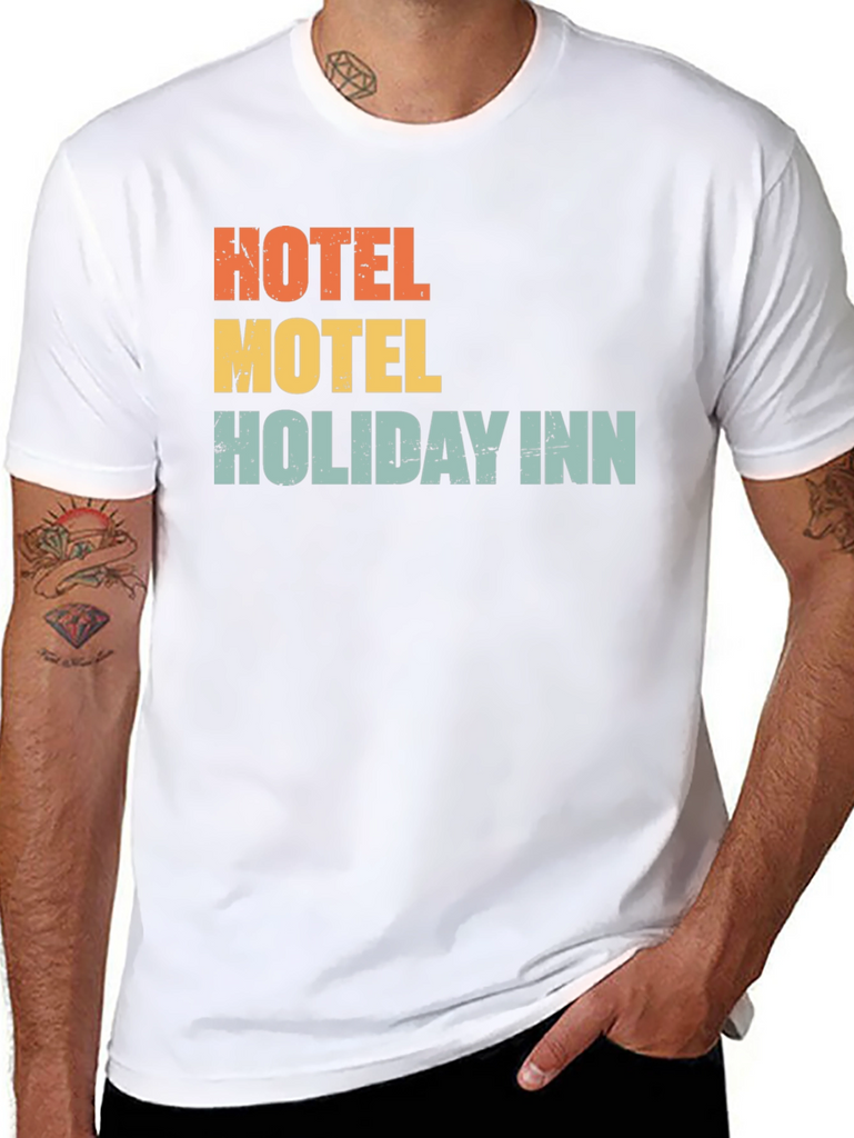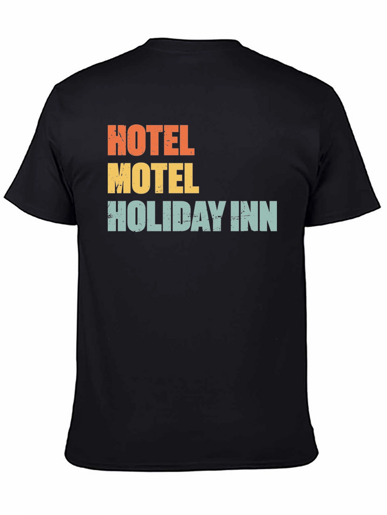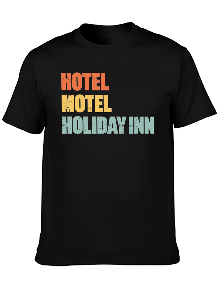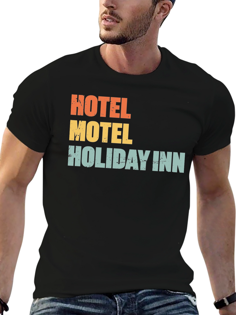Show your love for travel with this fun graphic t-shirt. The shirt features the phrases "Hotel," "Motel," and "Holiday Inn" stacked on top of each other in vintage-inspired lettering and colors. This casual tee is made from a comfortable fabric and has a classic fit. Perfect for vacations, road trips, or just everyday wear. Grab yours today!