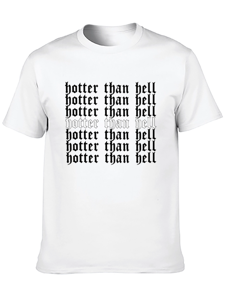 Show off your fiery side with this stylish black t-shirt featuring a bold "hotter than hell" graphic print. The repeating text design creates a unique and eye-catching visual. Made from a soft and breathable fabric, this tee offers both comfort and durability for everyday wear. The classic fit is flattering and versatile, making it perfect for casual outings, concerts, or expressing your edgy style. This statement piece is a must-have for anyone who wants to stand out from the crowd.