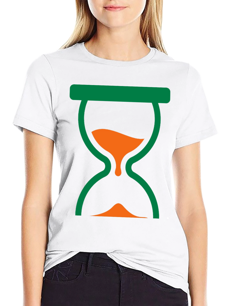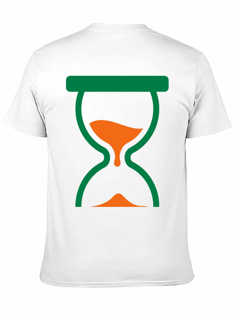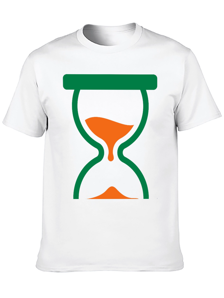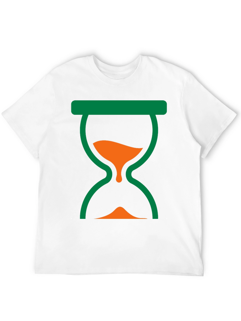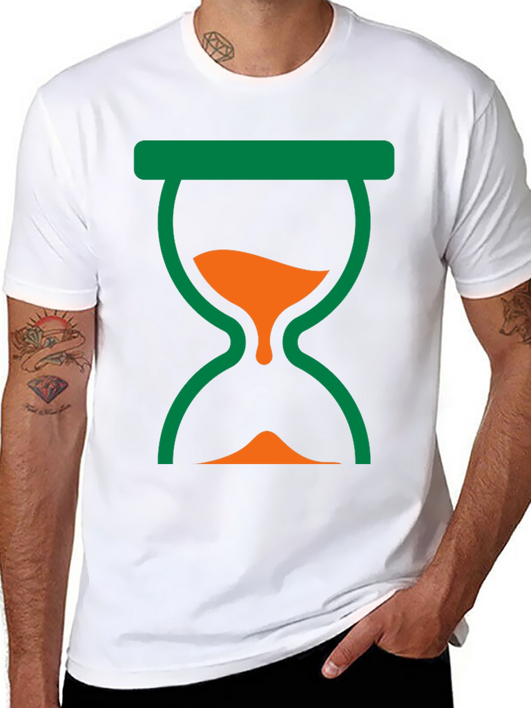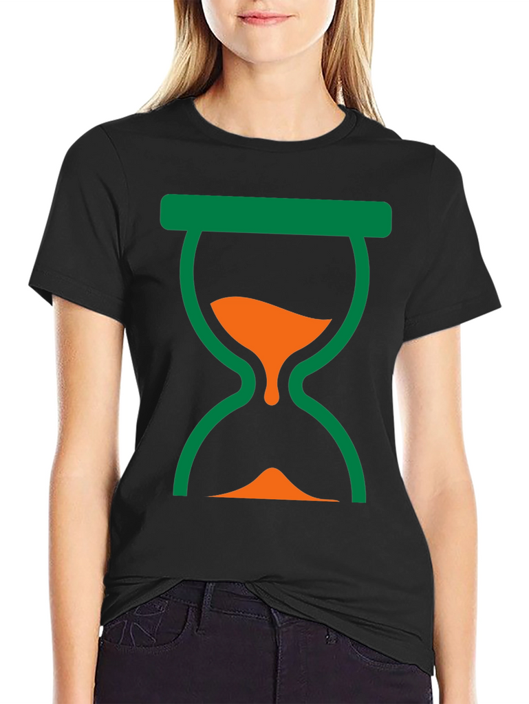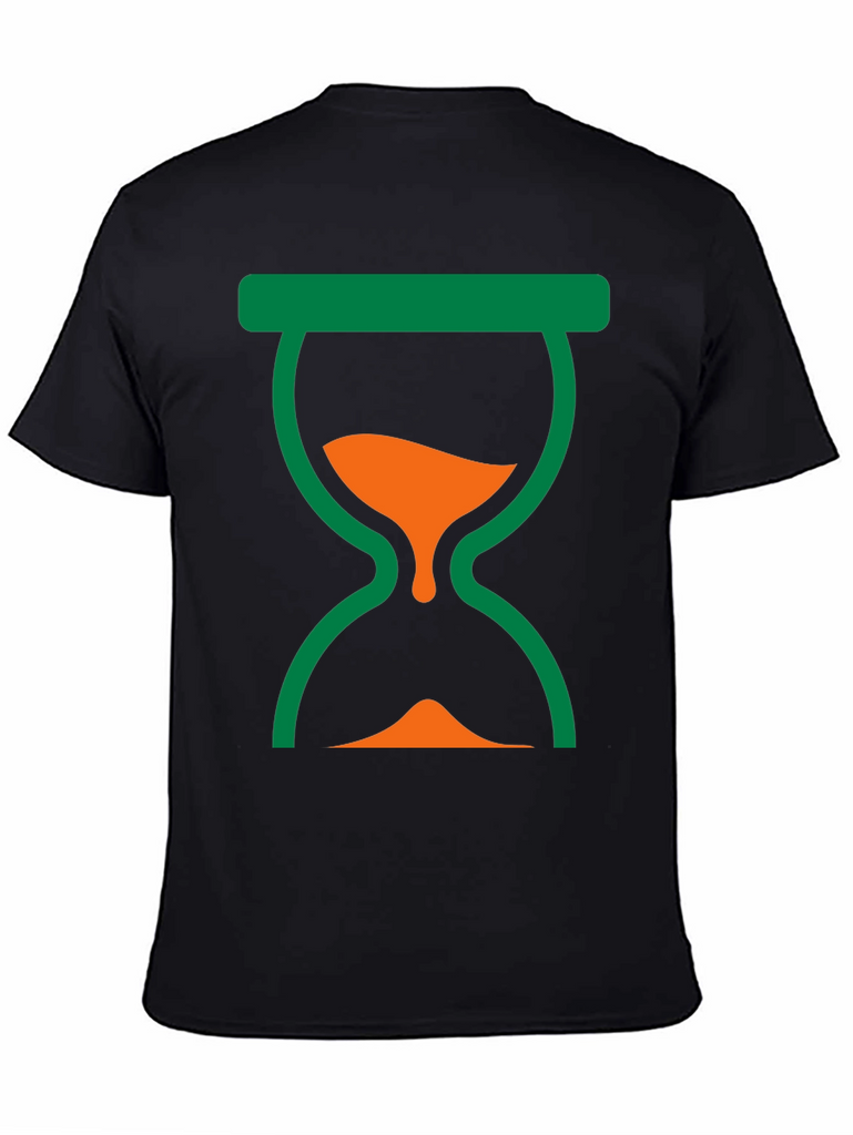 Showcase your unique style with this eye-catching black t-shirt featuring a bold hourglass graphic. The design includes a vibrant green outline of the hourglass itself, complemented by orange sand inside. Made from a comfortable-looking fabric, this tee is ideal for casual wear, making a statement while staying comfortable. Perfect for everyday wear, casual outings, or as a conversation starter. Express your personality with this distinctive and fashionable piece.