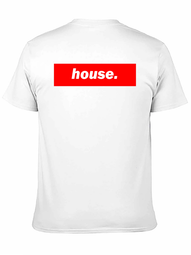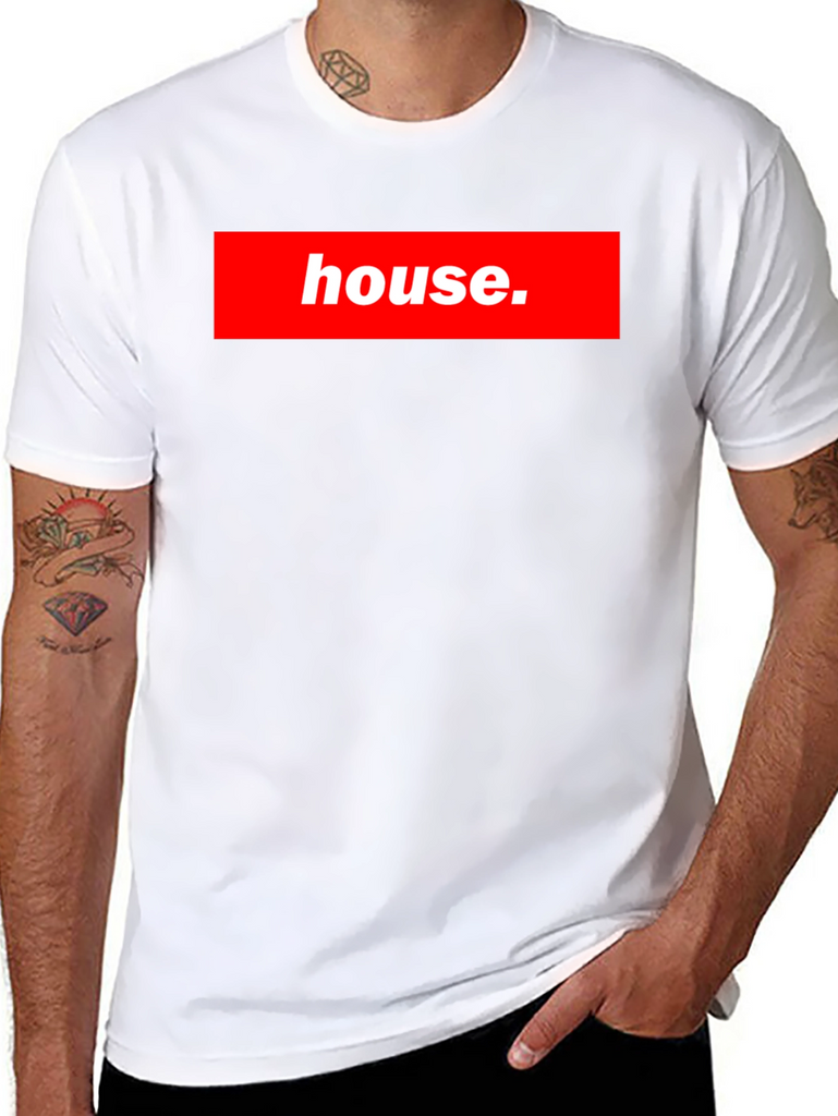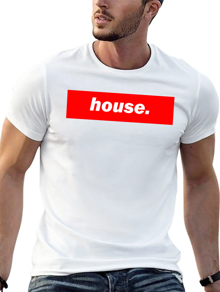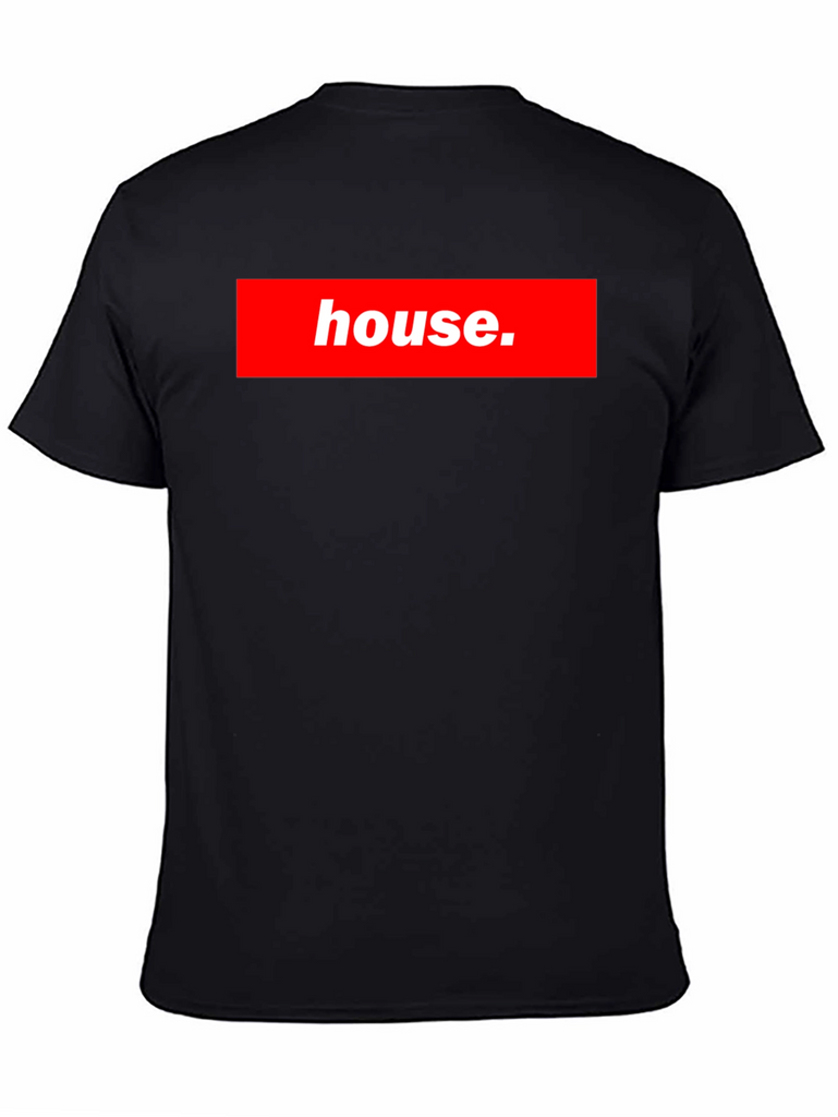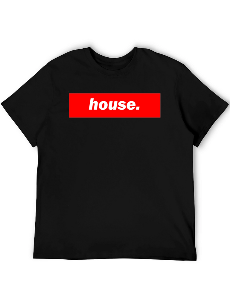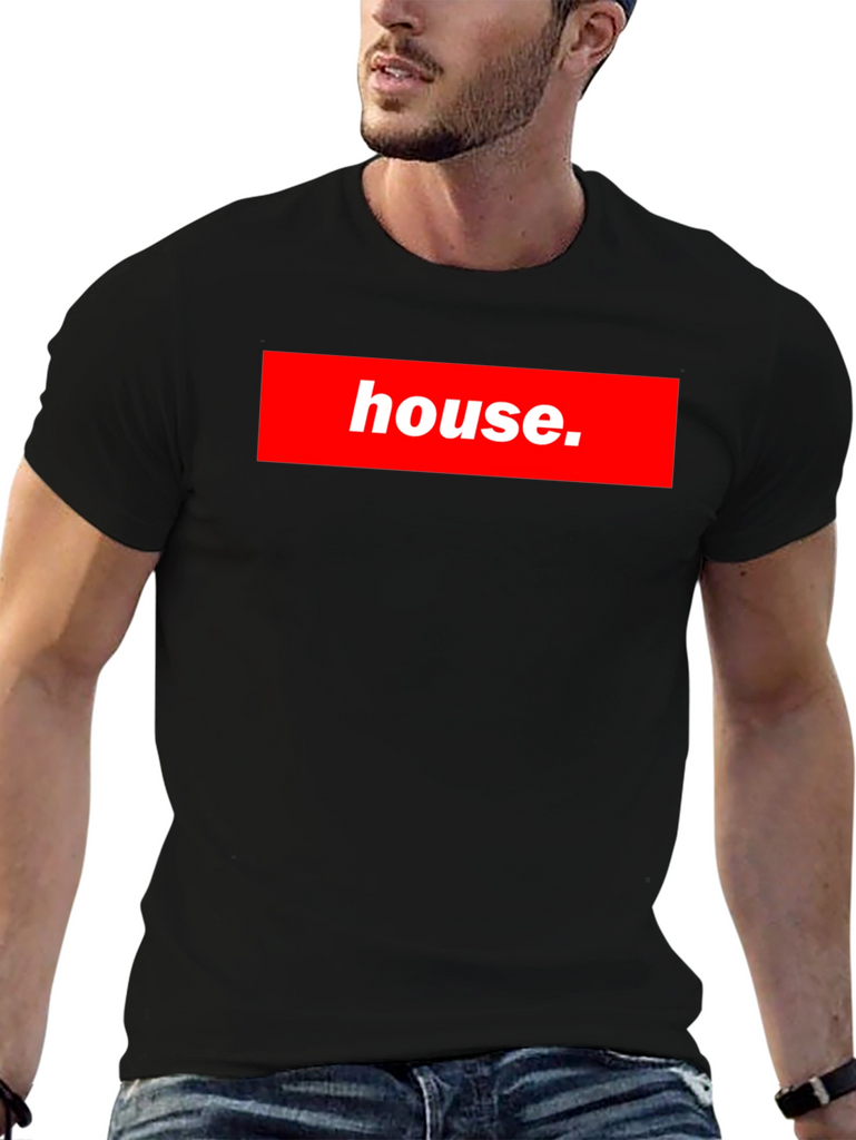 Show off your love for music with this stylish black t-shirt! Featuring a bold red box logo with the word "house.", this tee is sure to turn heads. The design mimics a popular streetwear brand, making it a fashionable choice for any casual occasion. The shirt appears to be made of a comfortable material, perfect for everyday wear. Whether you're hitting the club, hanging out with friends, or just relaxing at home, this t-shirt is a great way to express your unique style and passion for house music.