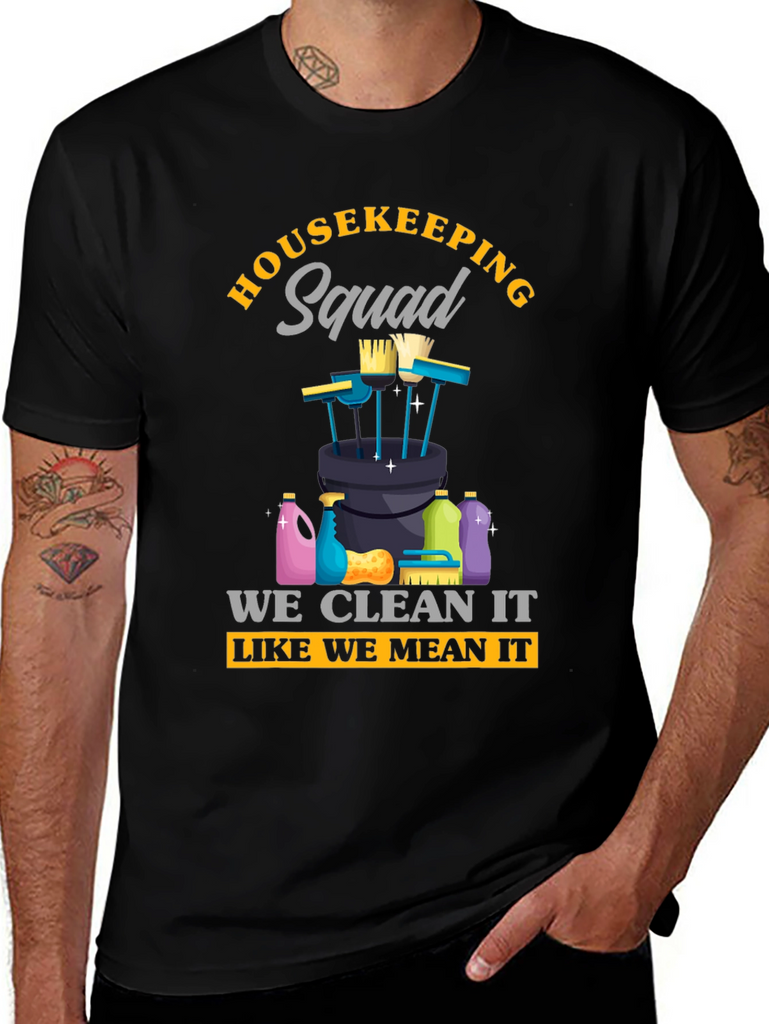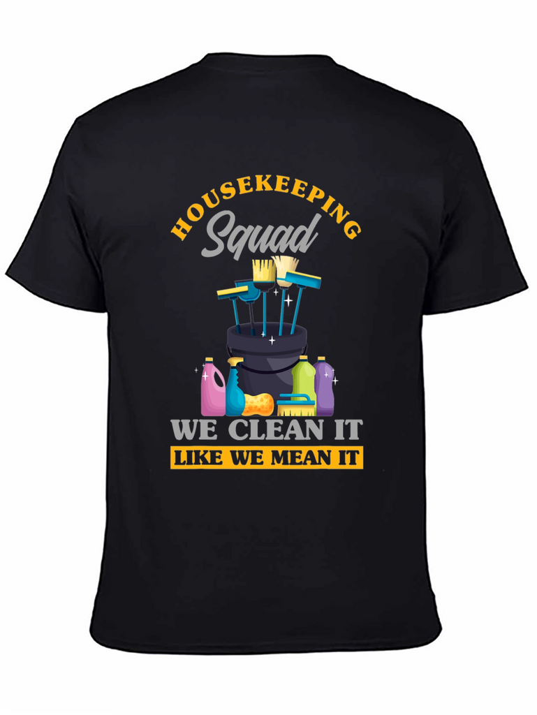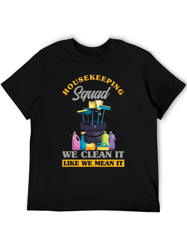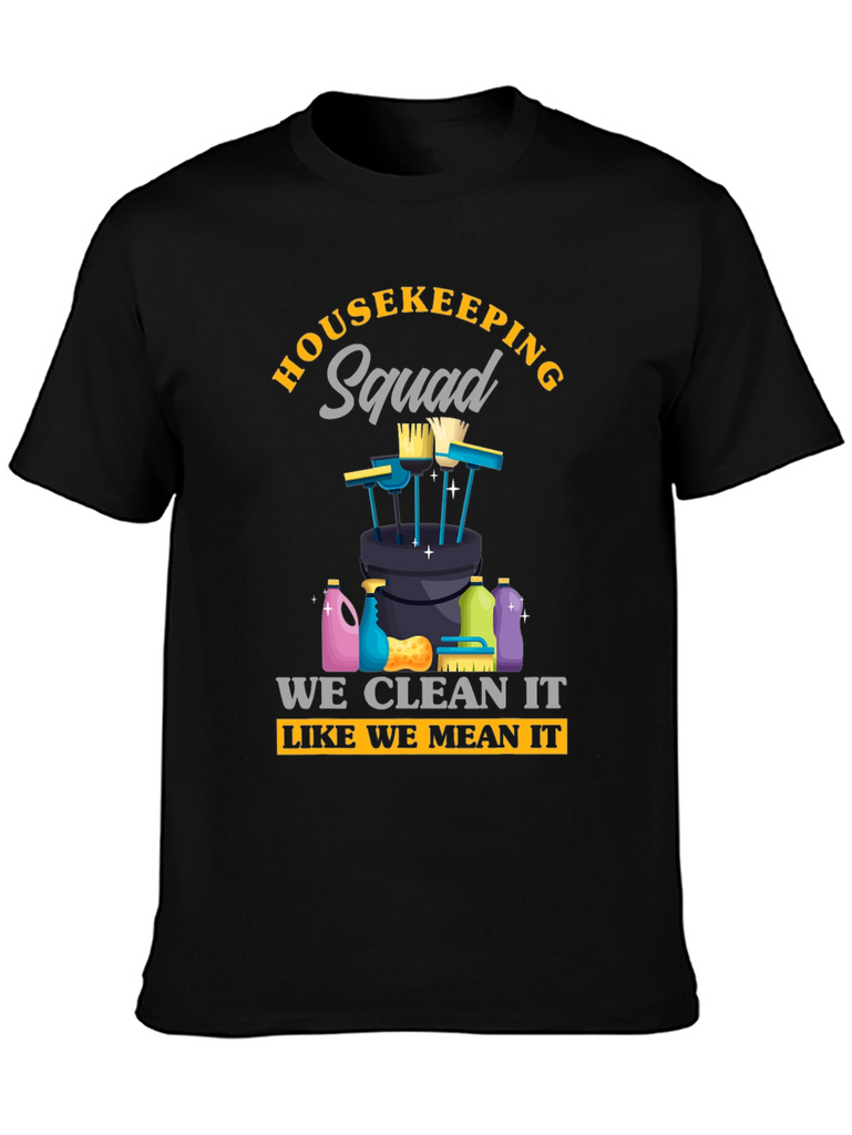 Show off your dedication to cleanliness with this fun graphic t-shirt! The black tee features a colorful design including cleaning supplies, a bucket, and the phrase 'Housekeeping Squad WE CLEAN IT LIKE WE MEAN IT.' Ideal for professional cleaners or anyone who takes pride in maintaining a tidy space. This shirt is comfortable, stylish, and perfect for wearing on the job or for casual outings. Let everyone know you're part of the Housekeeping Squad!