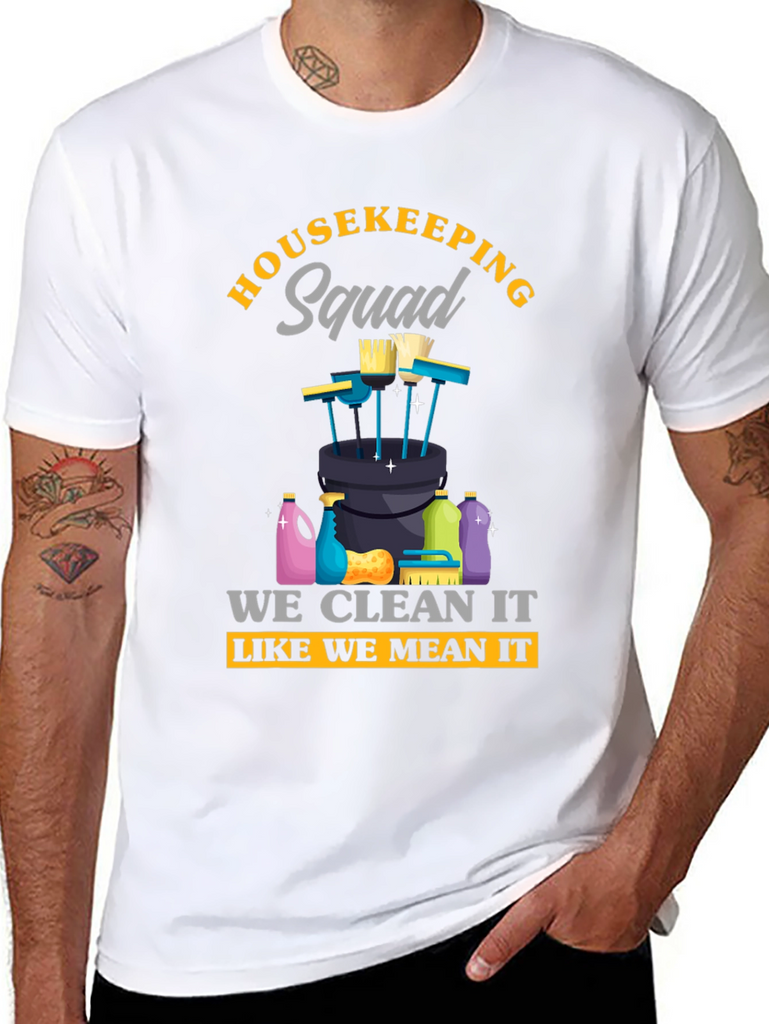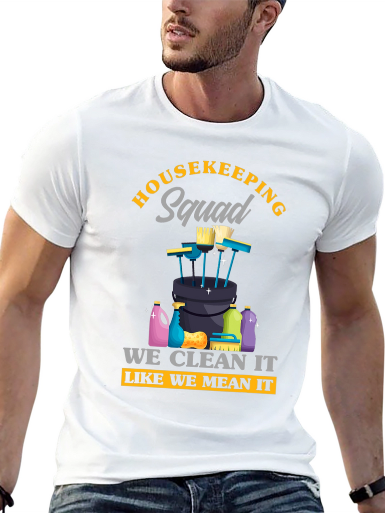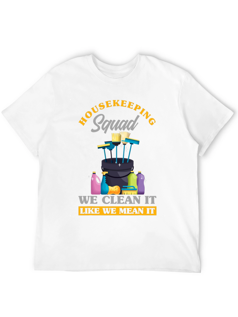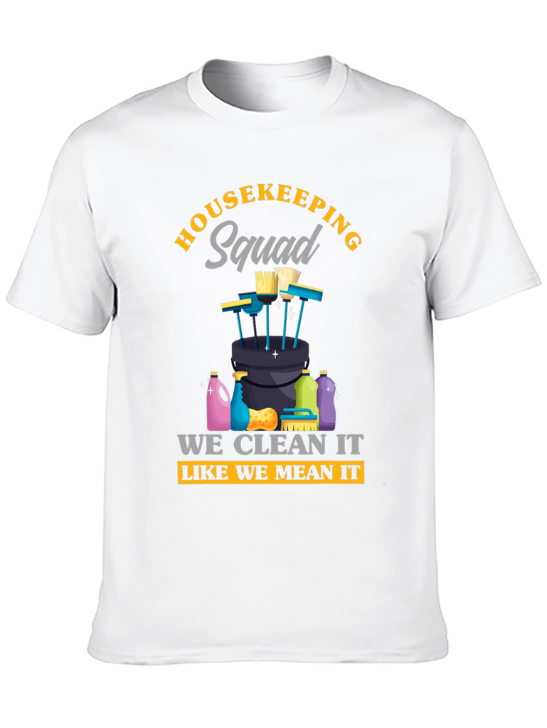 Show off your dedication to cleanliness with this fun graphic t-shirt! The black tee features a colorful design including cleaning supplies, a bucket, and the phrase 'Housekeeping Squad WE CLEAN IT LIKE WE MEAN IT.' Ideal for professional cleaners or anyone who takes pride in maintaining a tidy space. This shirt is comfortable, stylish, and perfect for wearing on the job or for casual outings. Let everyone know you're part of the Housekeeping Squad!