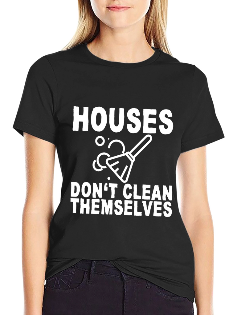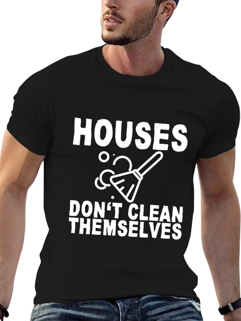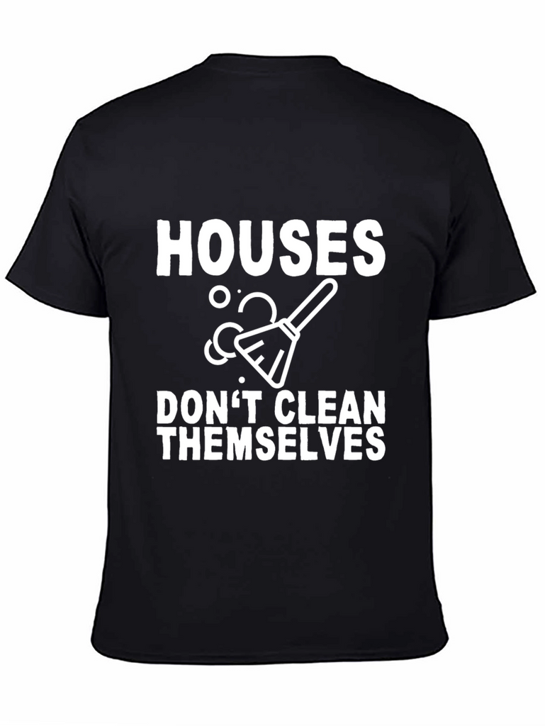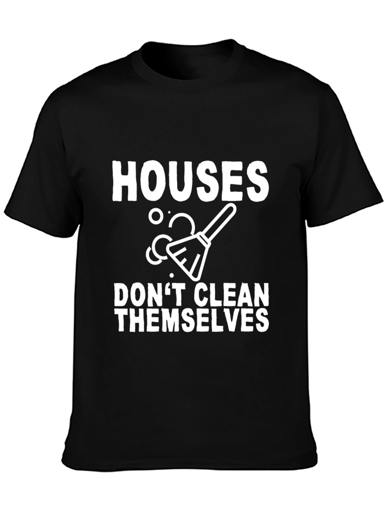 Show off your sense of humor with this eye-catching black tee! The bold white graphic features the phrase 'HOUSES DON'T CLEAN THEMSELVES' alongside a fun illustration of a cleaning brush. Crafted from a comfortable material, this t-shirt offers both style and wearability. Its classic fit makes it a versatile addition to any casual wardrobe. Perfect for cleaners, busy homeowners, or anyone who appreciates a witty statement piece. Add a touch of personality to your everyday look with this standout t-shirt!