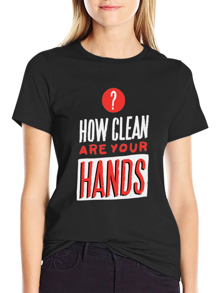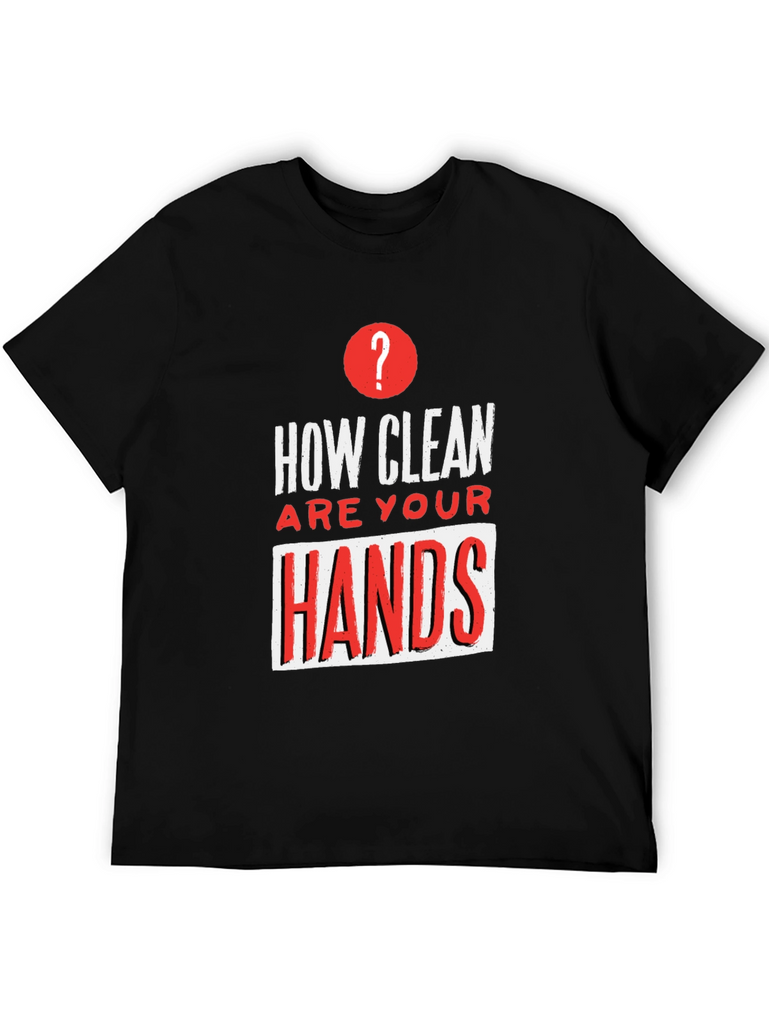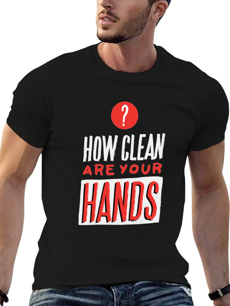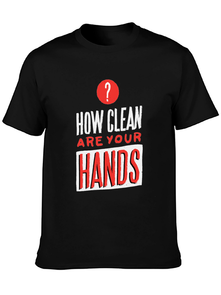 This black t-shirt features a bold graphic print. The design includes a question mark and the text "How Clean Are Your Hands" in contrasting white and red lettering. The material looks like a soft and breathable cotton blend, ensuring comfortable wear. Ideal for casual outings, awareness campaigns, or as a statement piece, this t-shirt combines style and message. It’s a great conversation starter and a fun way to promote hygiene awareness. The classic fit makes it versatile for various body types. The print is eye-catching and durable, designed to withstand multiple washes. Add this unique tee to your wardrobe for a blend of comfort and impactful design.