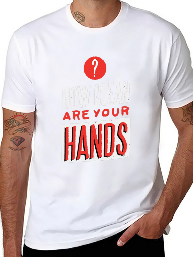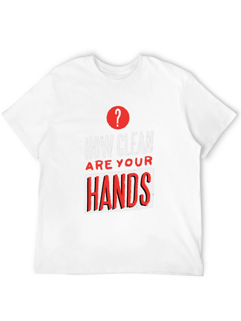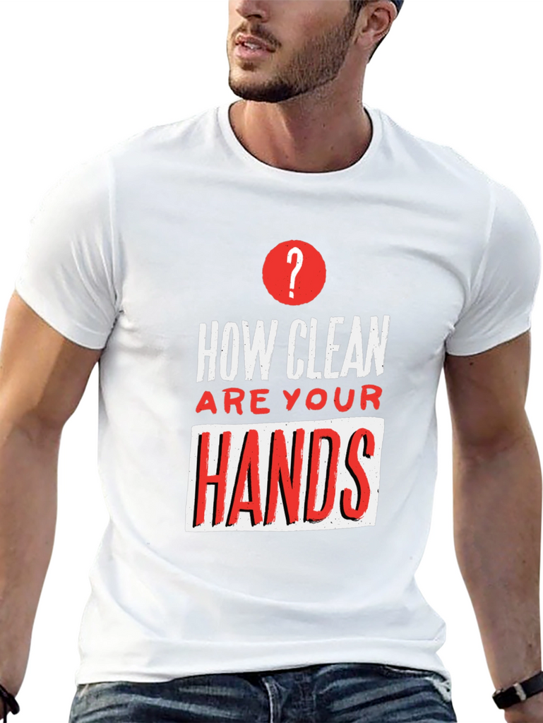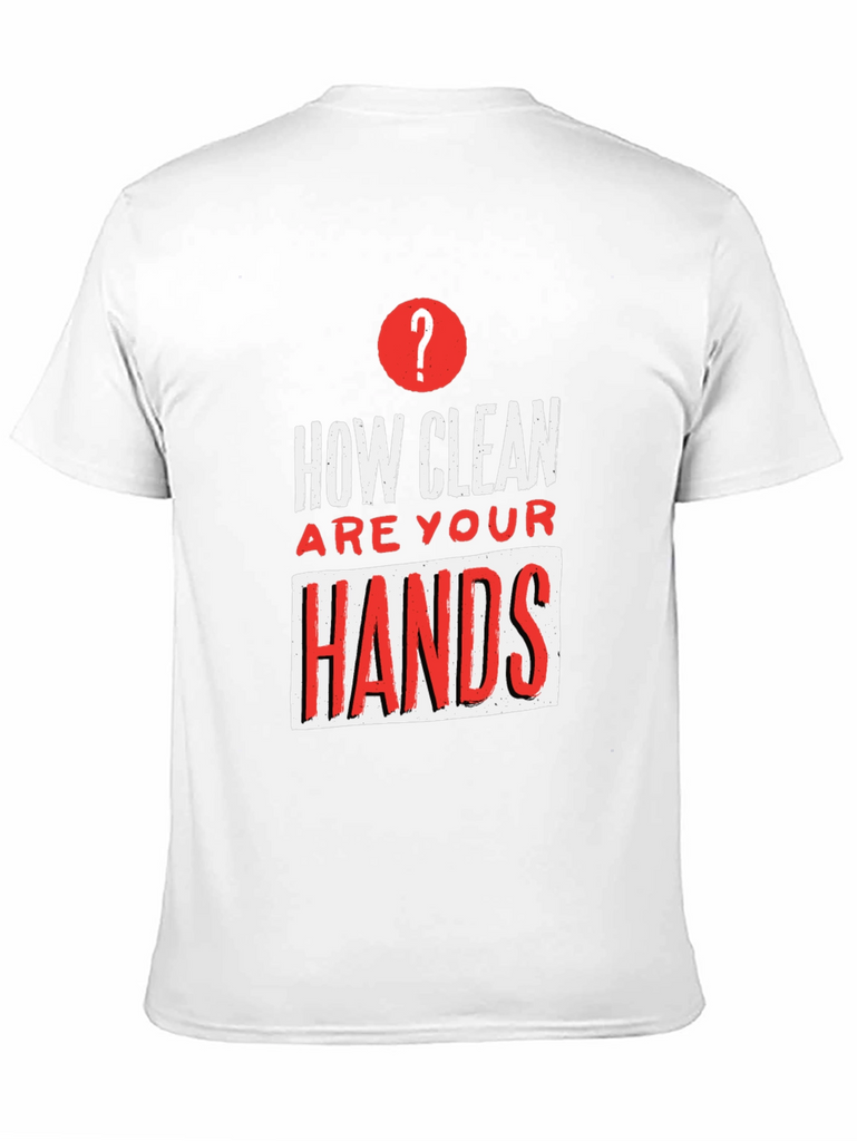 This black t-shirt features a bold graphic print. The design includes a question mark and the text "How Clean Are Your Hands" in contrasting white and red lettering. The material looks like a soft and breathable cotton blend, ensuring comfortable wear. Ideal for casual outings, awareness campaigns, or as a statement piece, this t-shirt combines style and message. It’s a great conversation starter and a fun way to promote hygiene awareness. The classic fit makes it versatile for various body types. The print is eye-catching and durable, designed to withstand multiple washes. Add this unique tee to your wardrobe for a blend of comfort and impactful design.