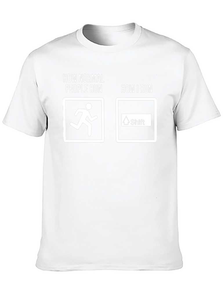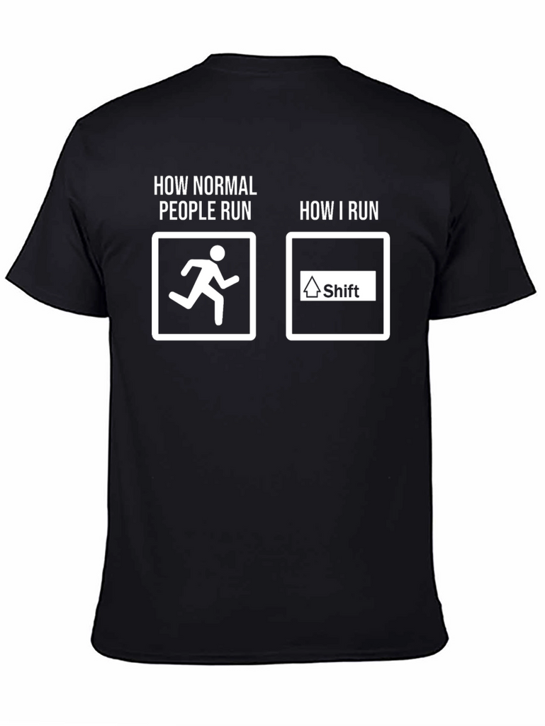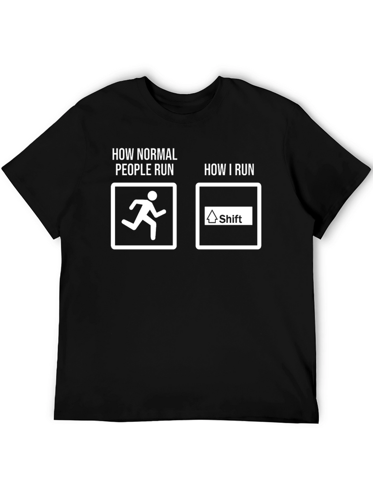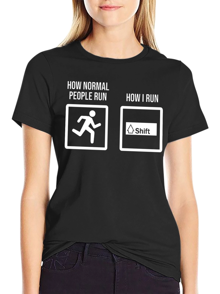 Show off your programmer humor with this unique black t-shirt. Featuring a playful design, it contrasts a 'How Normal People Run' graphic with a computer 'Shift' key, humorously illustrating the coder's version of running. Made from a comfortable material, this tee is perfect for casual wear, coding sessions, or tech meetups. A great conversation starter and an ideal gift for programmers, developers, and tech enthusiasts with a sense of humor. Get yours and let the world know how you 'run'!
