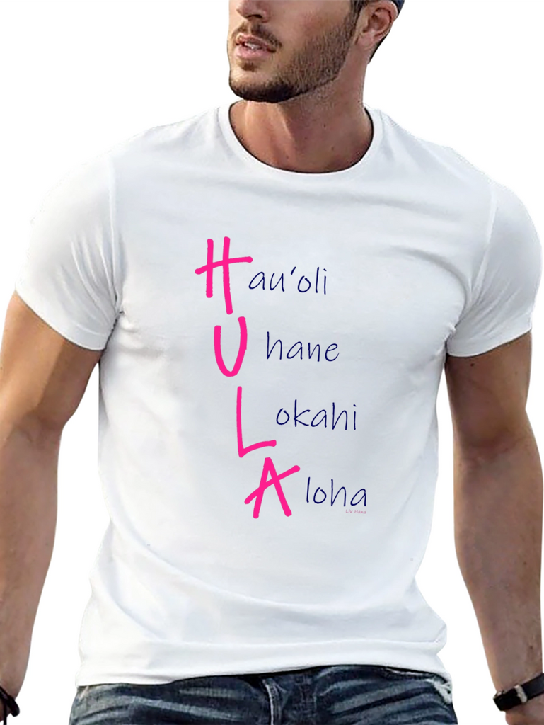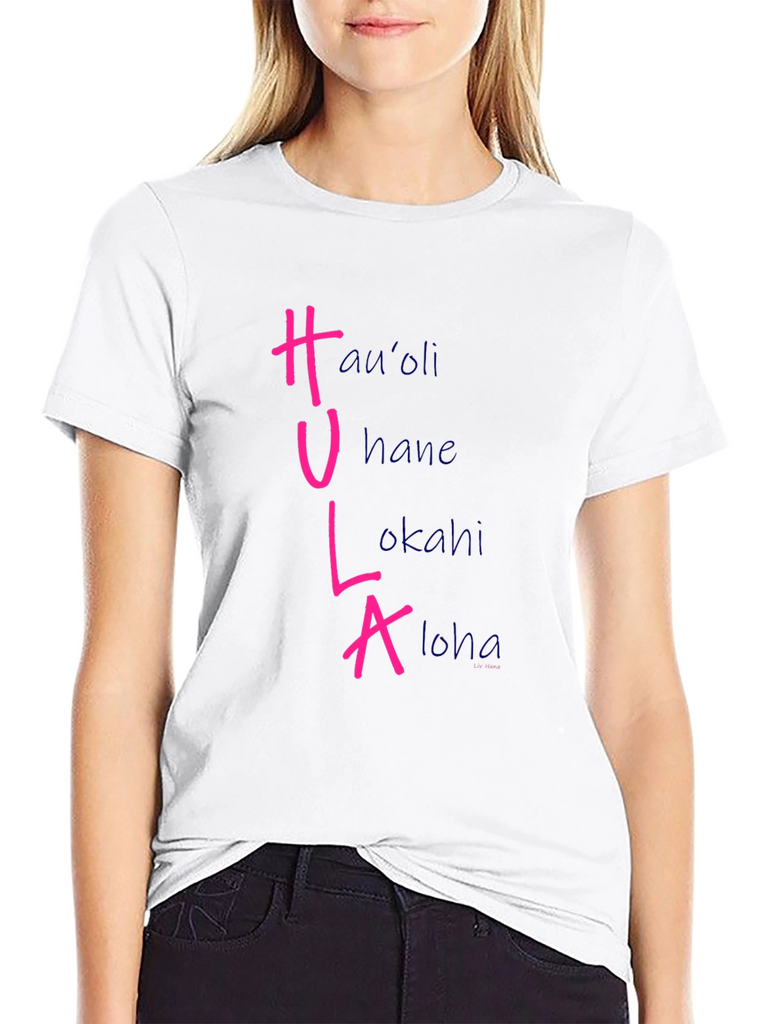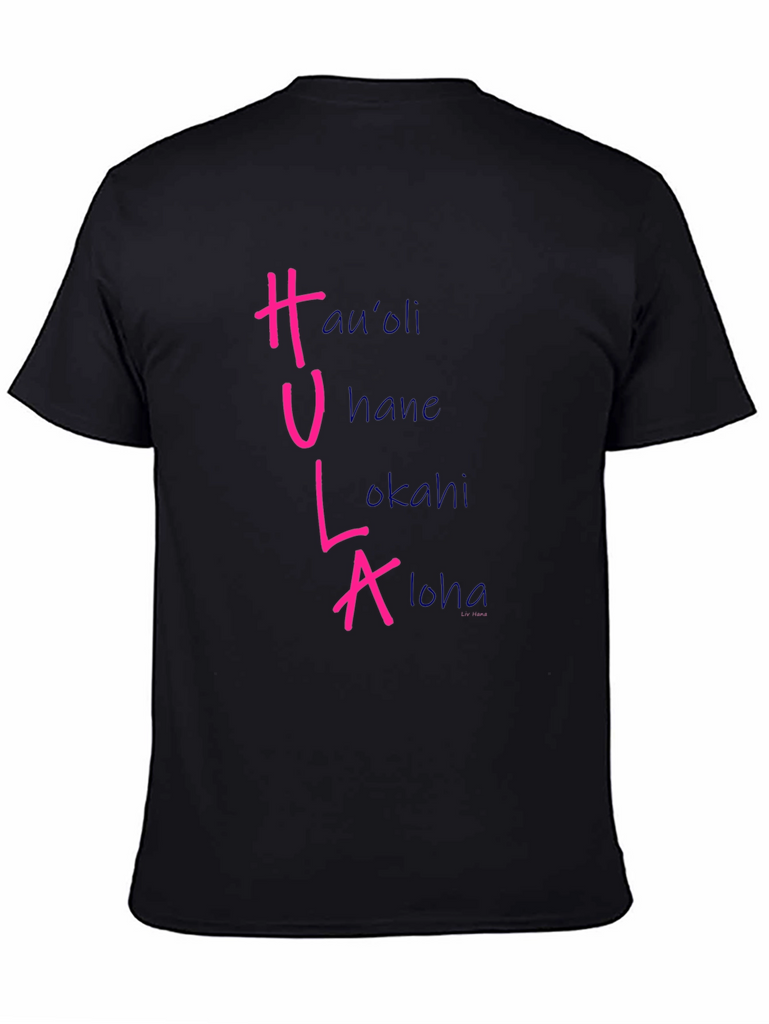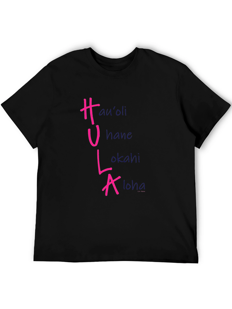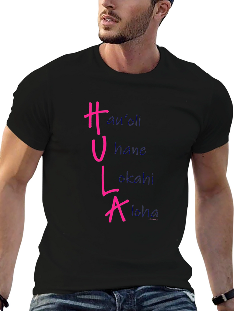 Show off your love for Hawaiian culture with this stylish black t-shirt. The shirt features the word "HULA" vertically, with each letter corresponding to a different Hawaiian word: Hau'oli, Hane, Lokahi, and Aloha. The HULA letters are in a vibrant pink color, while the corresponding words are in a soft blue. Made from a comfortable fabric, this tee is perfect for casual wear, luau parties, or as a unique souvenir. Add a touch of the islands to your wardrobe with this eye-catching and meaningful design.