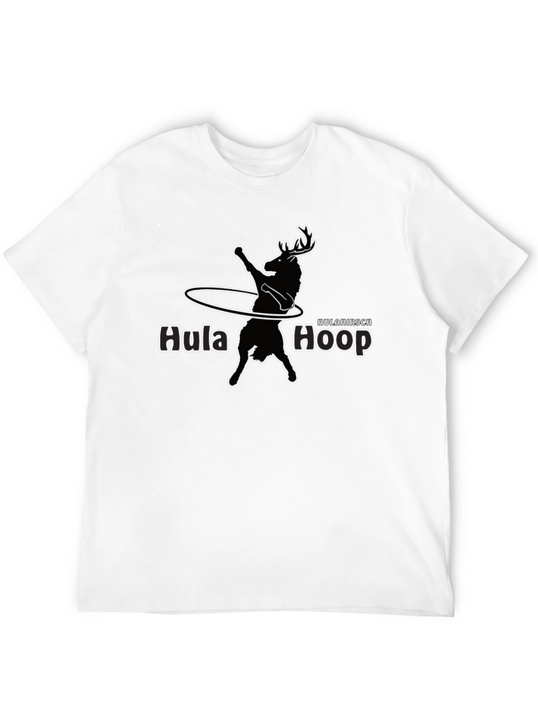 Show off your quirky side with this black graphic tee featuring a deer gracefully hula hooping. The design includes the words "Hula Hirsch Hoop" in a playful font. Made from a comfortable-looking material, this t-shirt is perfect for casual wear, workouts, or as a conversation starter. This unique tee is sure to add a touch of whimsy to your wardrobe. Dress it up with jeans or dress it down with your favorite pair of leggings.