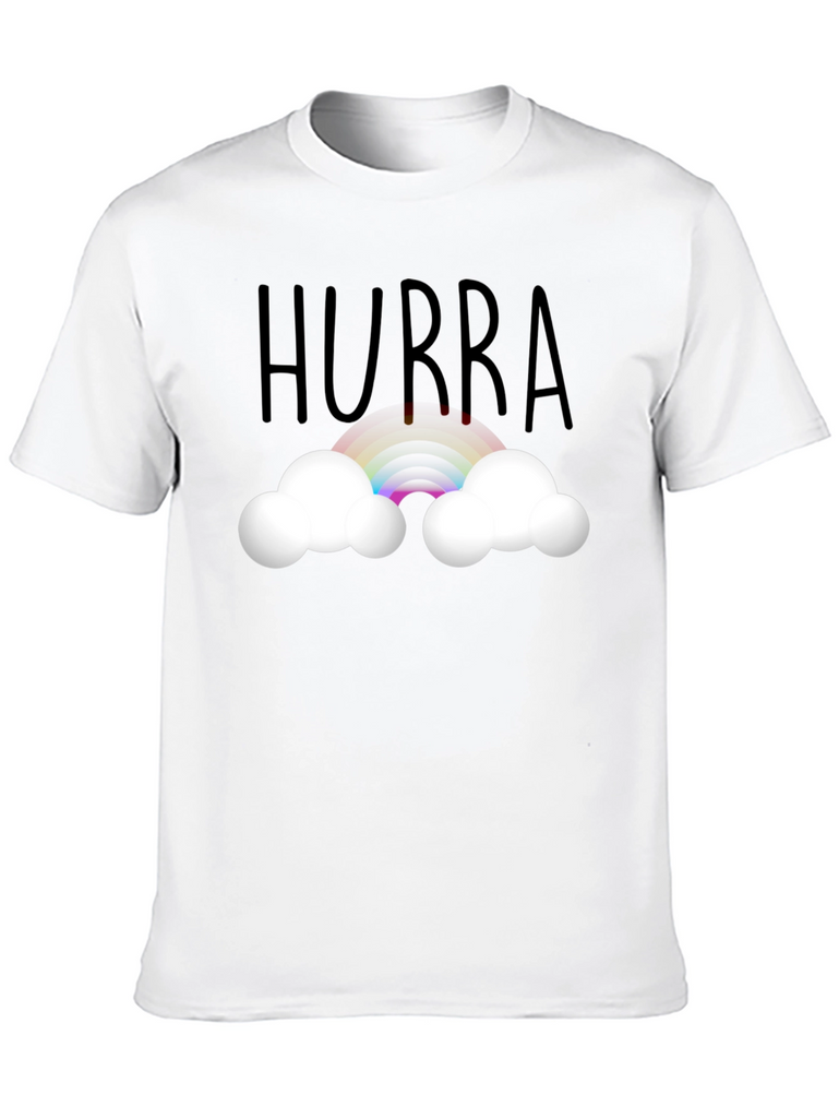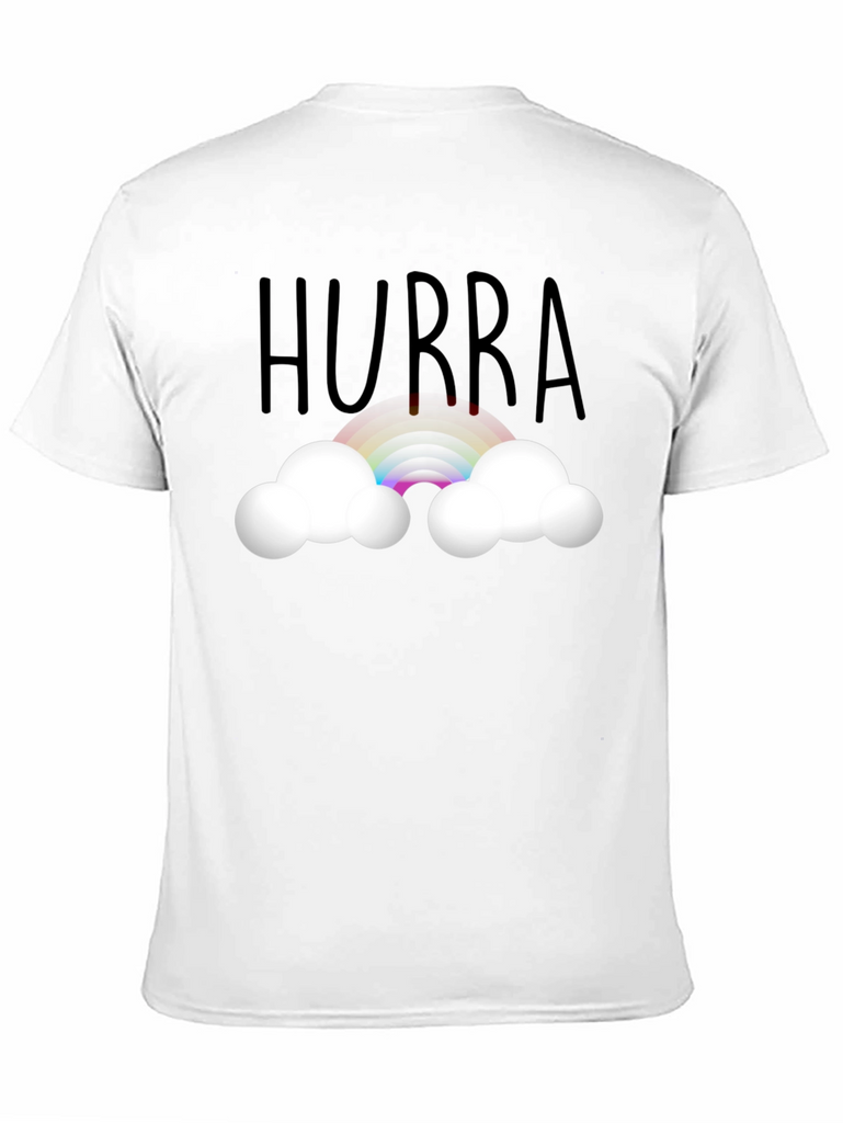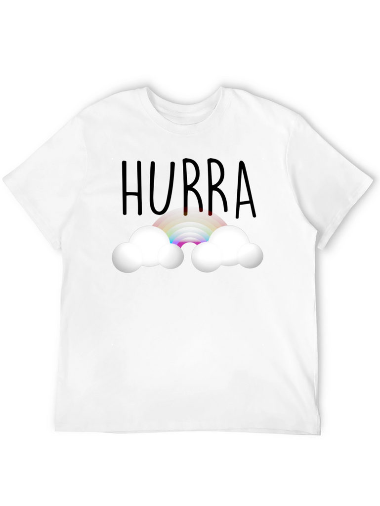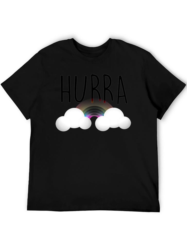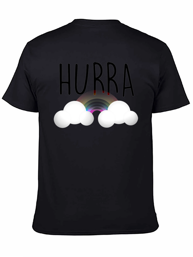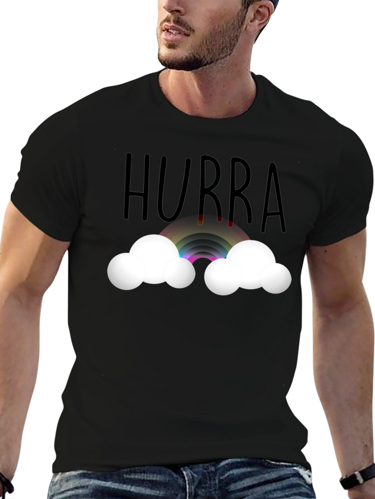 Celebrate any occasion with this cheerful black t-shirt. Featuring the word "Hurra" above a vibrant rainbow nestled between fluffy white clouds, this shirt is perfect for adding a touch of whimsy to your wardrobe. The design is printed on a comfortable, presumably soft, tee, making it ideal for everyday wear. Wear it to parties, casual outings, or simply when you want to spread a little joy. This unique design is sure to bring a smile to anyone's face and brighten up any day.