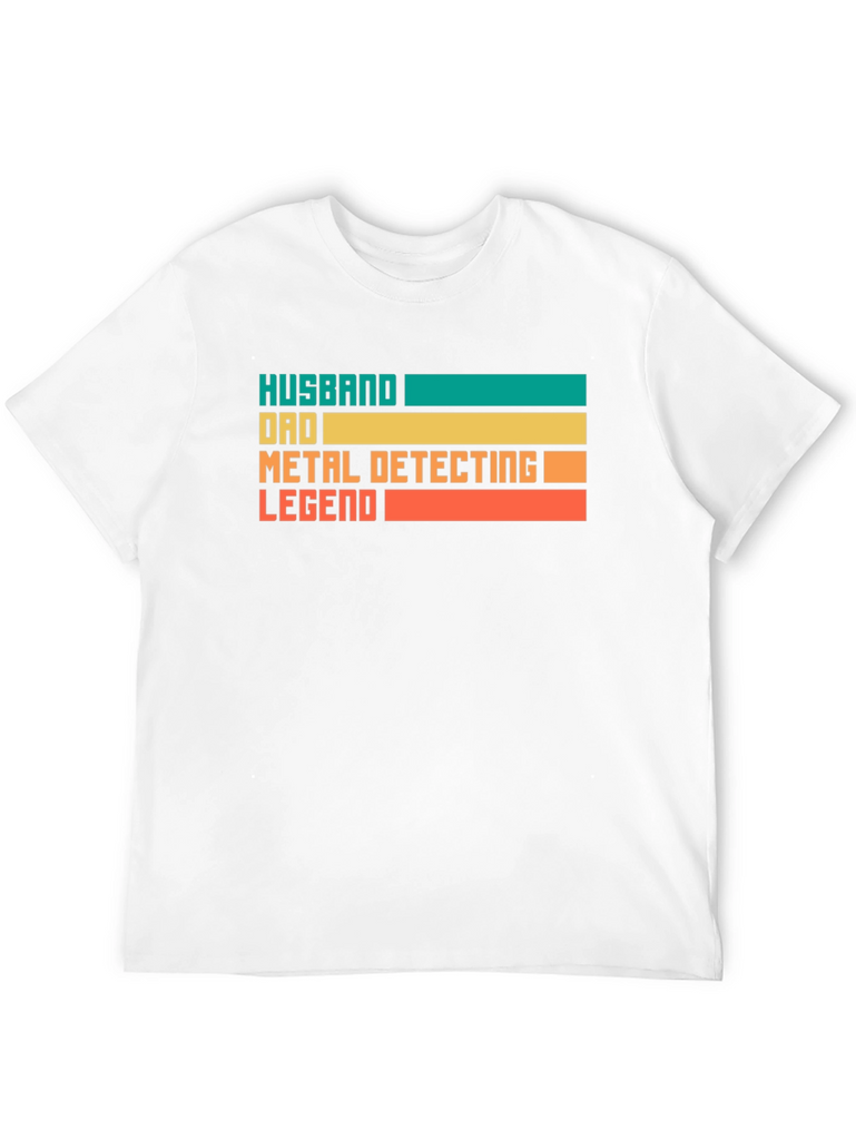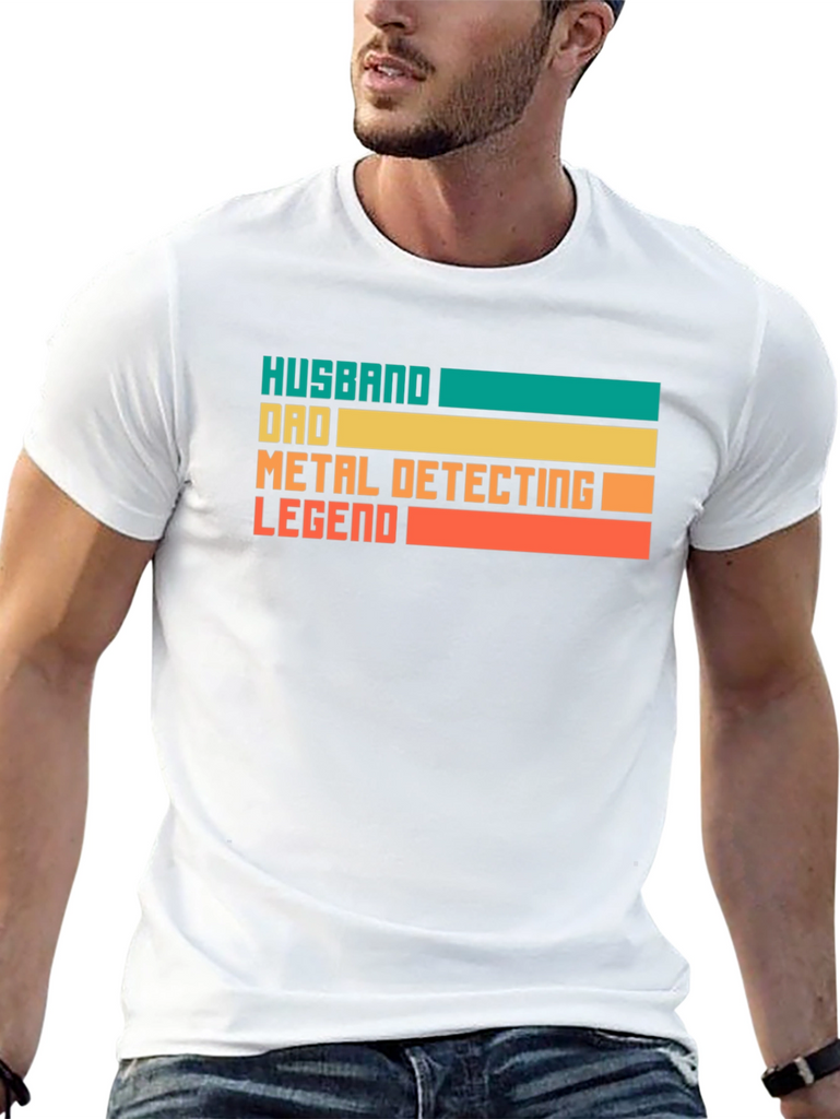 This stylish black t-shirt features a bold, layered design perfect for the metal detecting enthusiast. The text "Husband," "Dad," "Metal Detecting," and "Legend" are stacked in vibrant teal, yellow, orange, and red-orange hues, respectively. Each word is framed by a corresponding stripe of the same color, adding a retro touch to the modern design. Made from a comfortable-looking fabric, this tee is ideal for casual wear or for showcasing your passion for treasure hunting. It's a great gift for the metal detecting dad or husband in your life who deserves to be celebrated as a legend.
