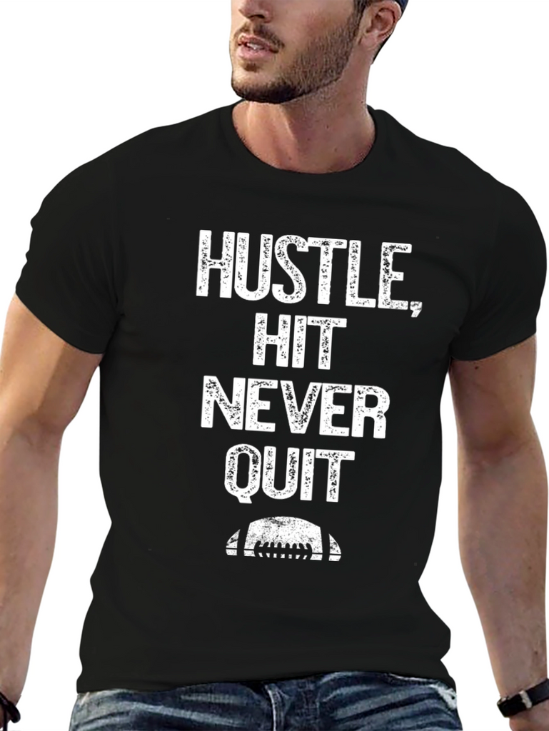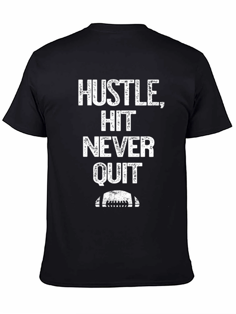 Show your determination with this striking black graphic tee. Bold white text reads "Hustle, Hit, Never Quit" above a stylized football graphic, making a powerful statement. Crafted from soft, breathable fabric, this tee offers all-day comfort and durability. The classic crew neck and short sleeves provide a versatile fit for any casual occasion. Whether you're hitting the gym, cheering from the sidelines, or just running errands, this shirt is sure to inspire and motivate. A must-have for athletes and anyone who embraces a winning mindset.