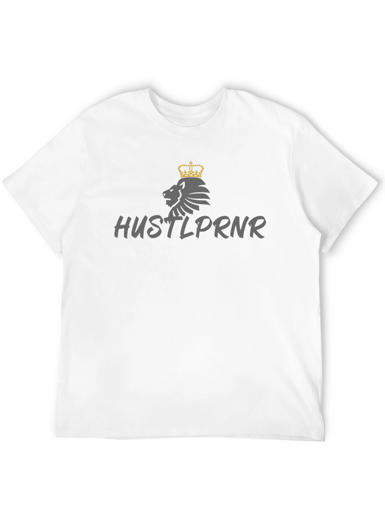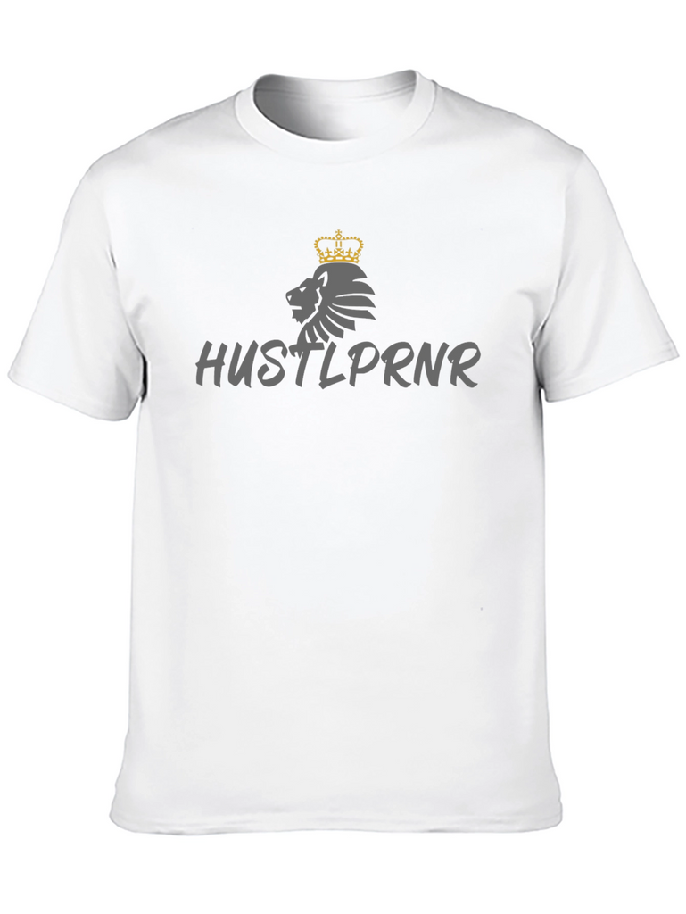 Elevate your street style with this sleek black t-shirt. Featuring a bold "HUSTLPRNR" graphic beneath a regal lion head wearing a crown, this tee makes a statement. The design is printed in a stylish gray tone that contrasts well against the black background. Made from a comfortable-looking fabric, this tee is perfect for casual wear, hitting the gym, or just hanging out. Pair it with jeans or shorts for a confident, urban look that showcases your entrepreneurial spirit.