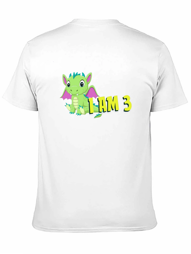 Celebrate a special 3rd birthday with this adorable dragon themed t-shirt! The black tee features a cute, cartoon-style green dragon graphic with pink wings and the playful text "I AM 3" in bold yellow. Made from comfortable fabric, this shirt is perfect for a birthday party, everyday wear, or as a memorable keepsake. The eye-catching design is sure to bring a smile to everyone's face and make the birthday boy or girl feel extra special. Order now and make their third birthday one to remember!