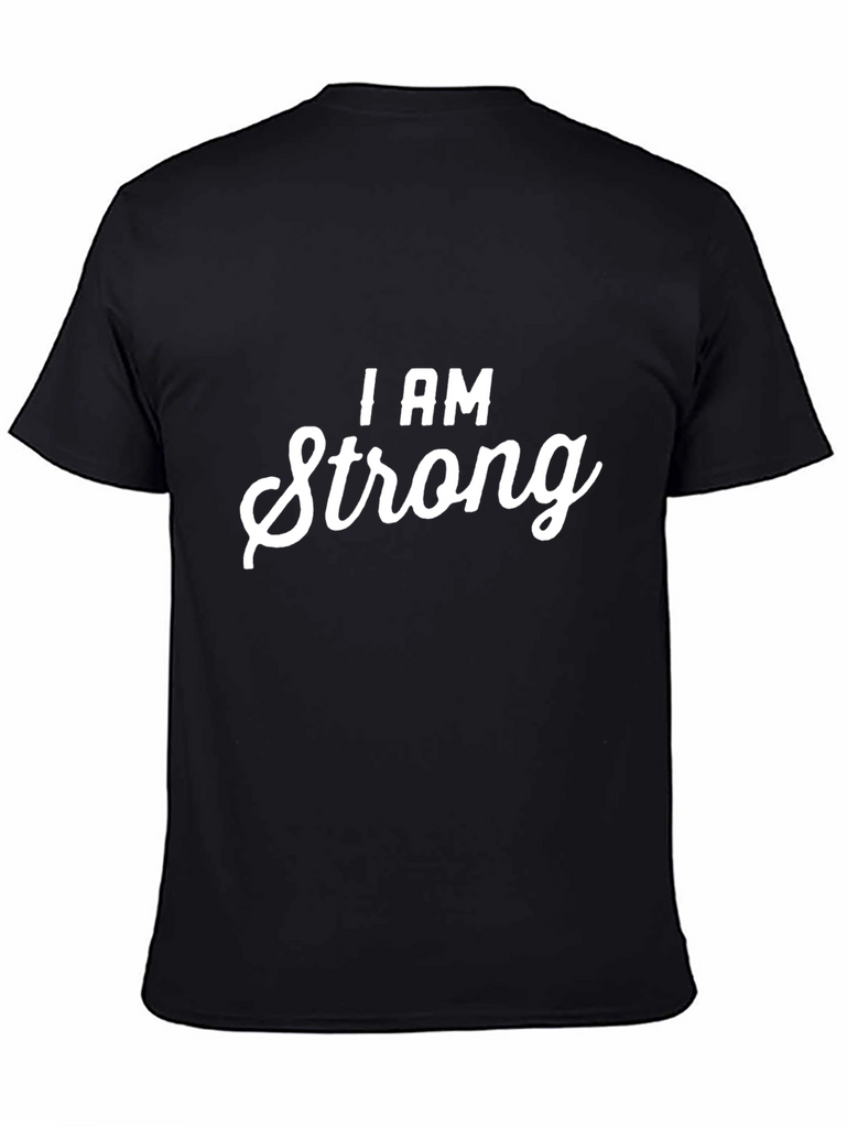 This classic black t-shirt features a bold, white graphic print that reads "I AM Strong." The simple yet powerful message is perfect for everyday wear, workouts, or casual outings. The t-shirt appears to be made from a comfortable cotton blend fabric with a classic crew neck and short sleeves. Its versatile design makes it easy to pair with jeans, shorts, or athletic wear. Show off your inner strength and make a statement with this stylish and comfortable graphic tee.