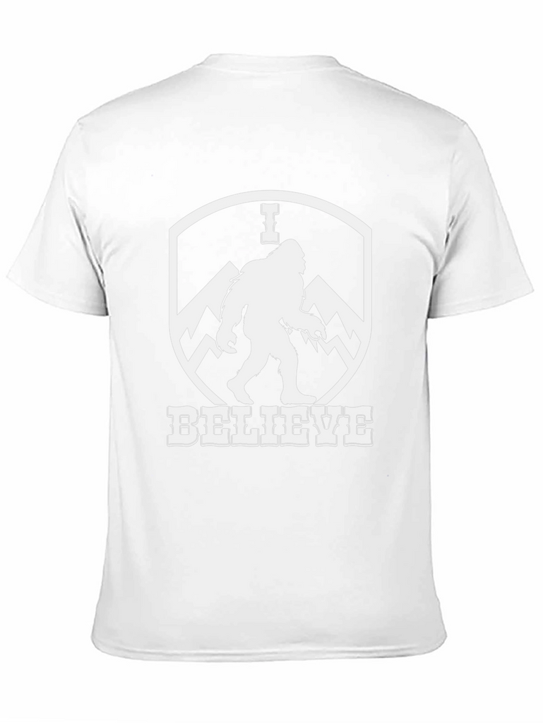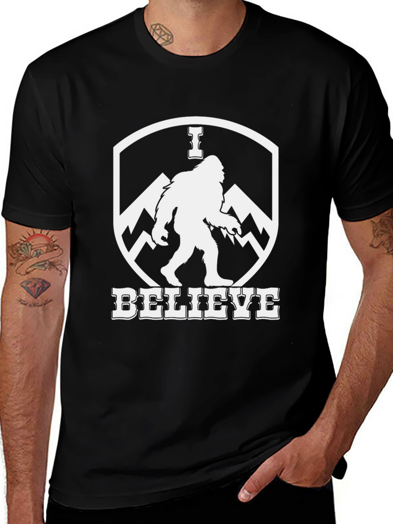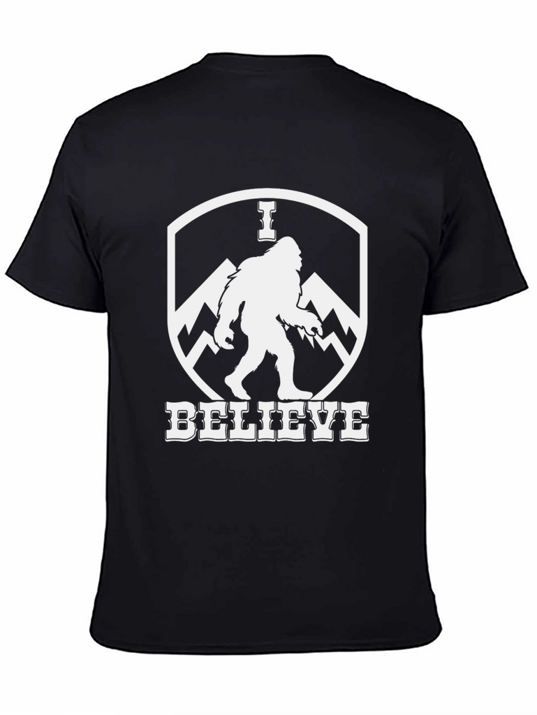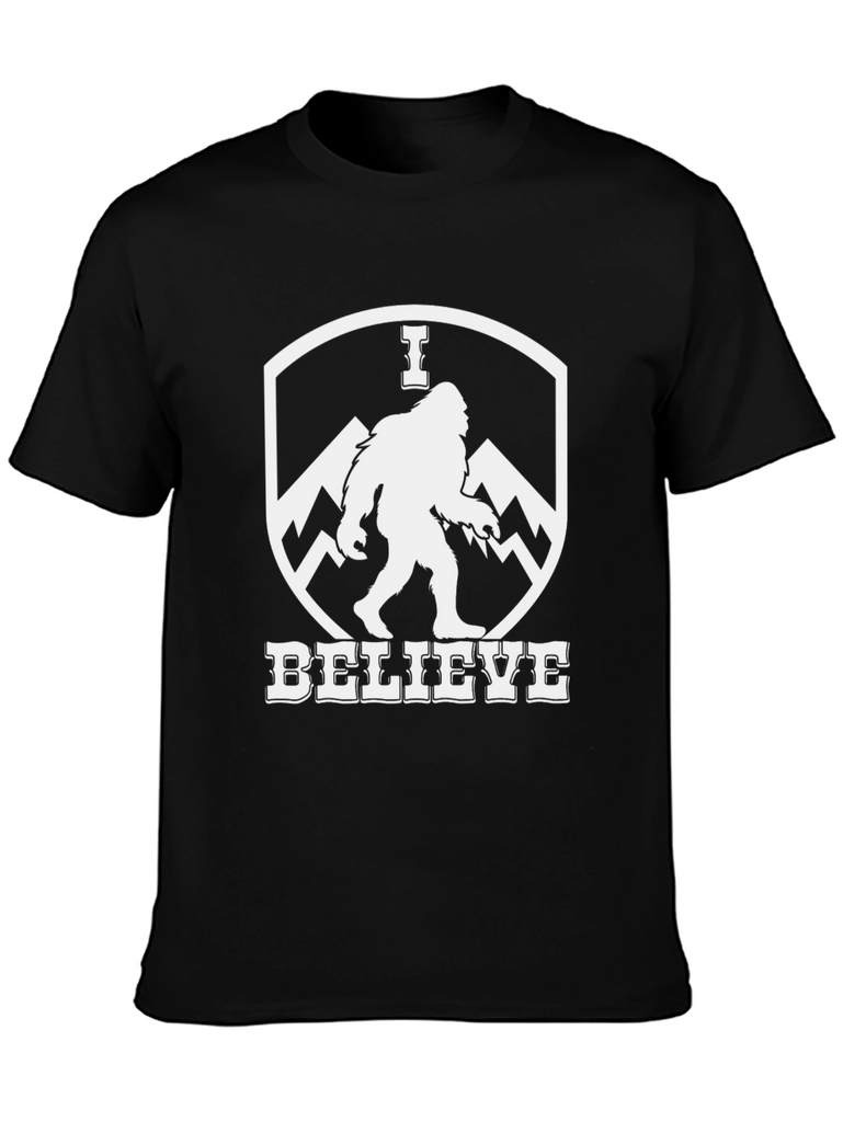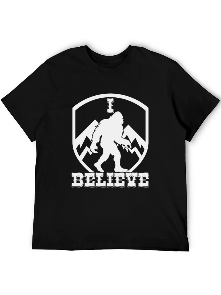 Embrace the mystery with this bold black t-shirt featuring a unique Bigfoot design. Showcasing a silhouette of the legendary creature set against a mountain backdrop within a shield-like emblem, the design includes the phrase "I BELIEVE" in a vintage-inspired font. Made from a comfortable, breathable fabric, this shirt is perfect for casual wear, outdoor adventures, or simply expressing your fascination with cryptozoology. It's a must-have for Bigfoot enthusiasts and anyone who appreciates a touch of mythical charm in their wardrobe. Let everyone know that you believe!