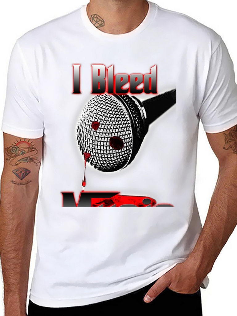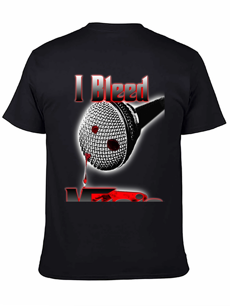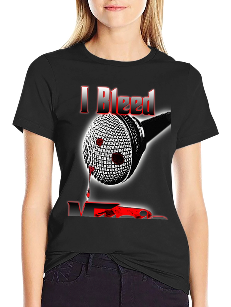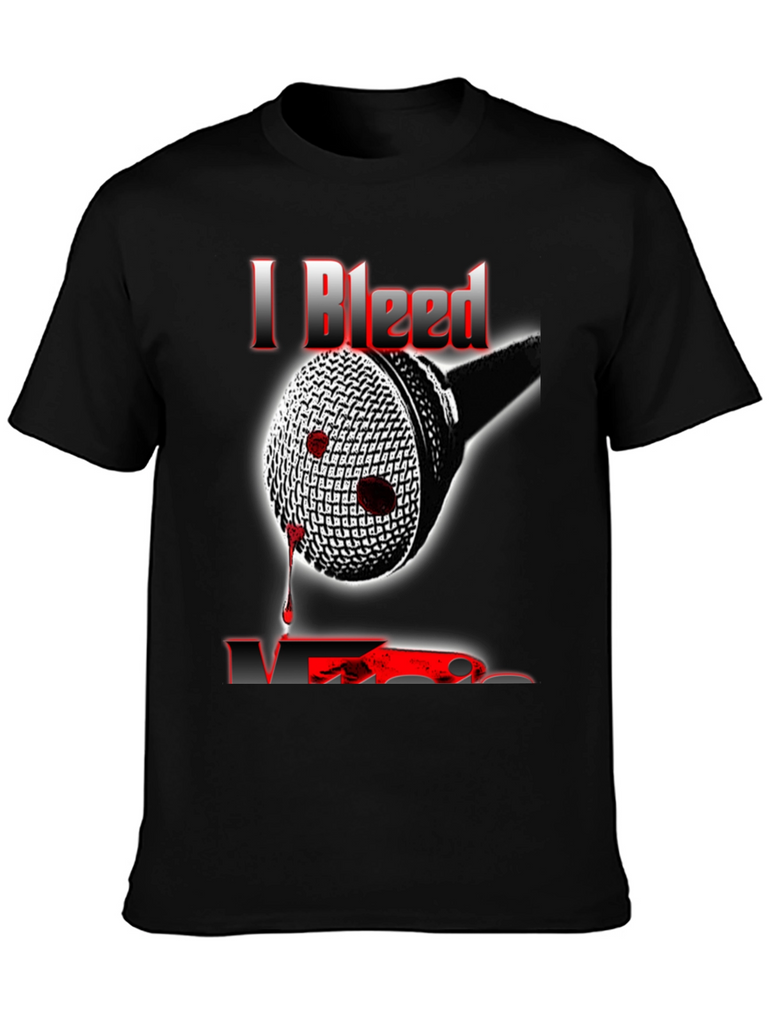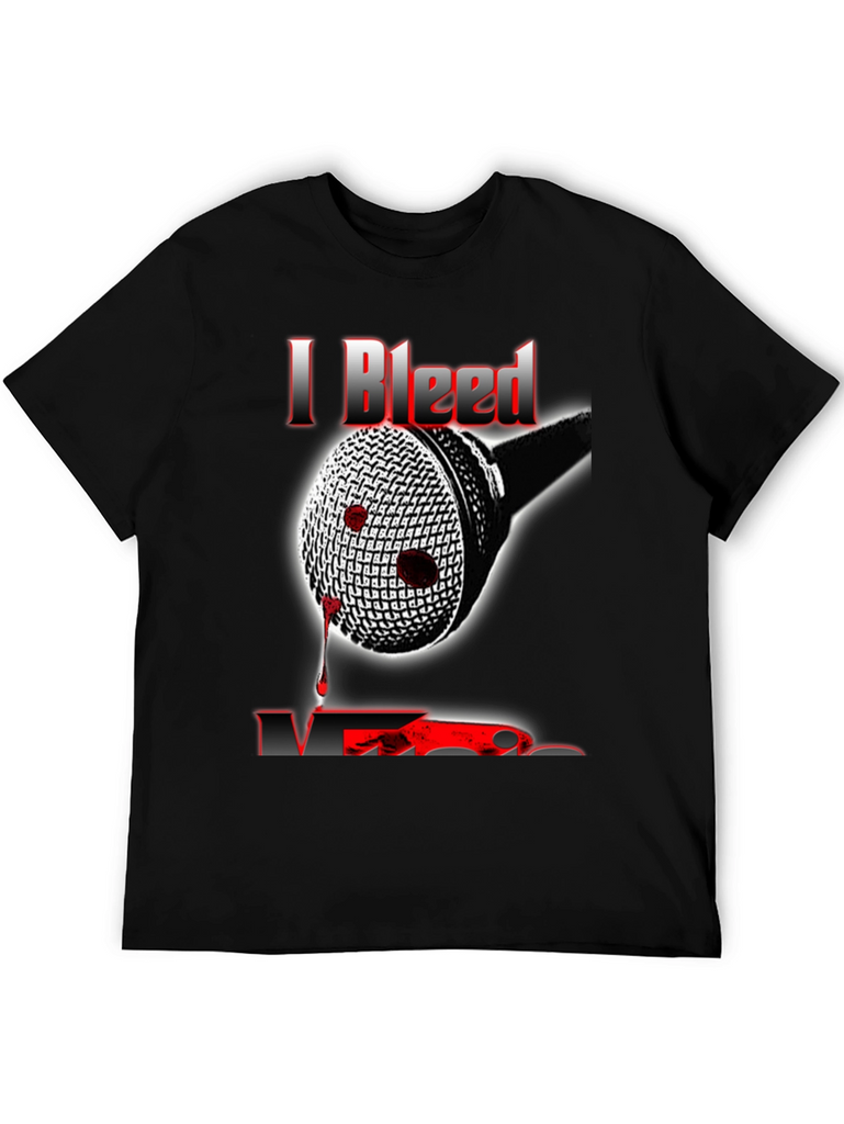 Rock your passion with this bold black graphic tee. Featuring a high-quality print of a microphone with blood accents and the phrase "I Bleed Music," this shirt makes a statement. Made from a comfortable, breathable fabric, it's ideal for concerts, band practice, or casual wear. The striking design is sure to turn heads and spark conversations. Show off your love for music with this unique and eye-catching t-shirt. A must-have for music lovers and performers!