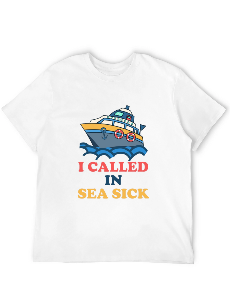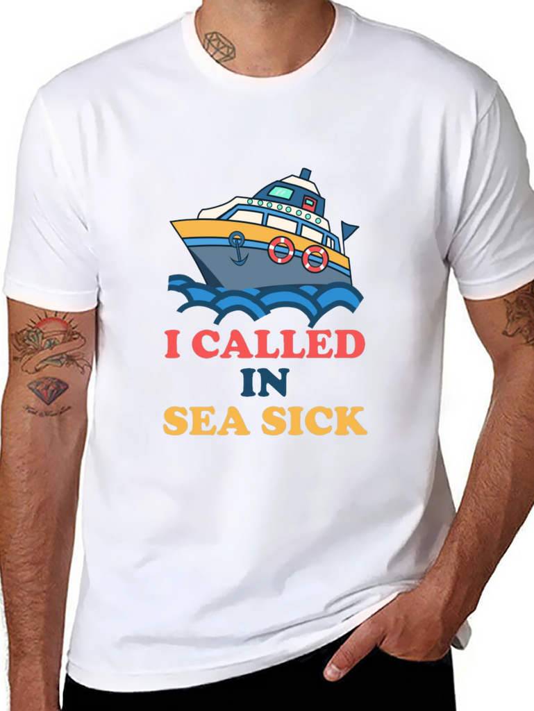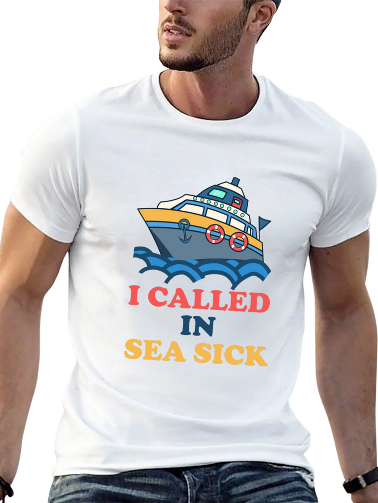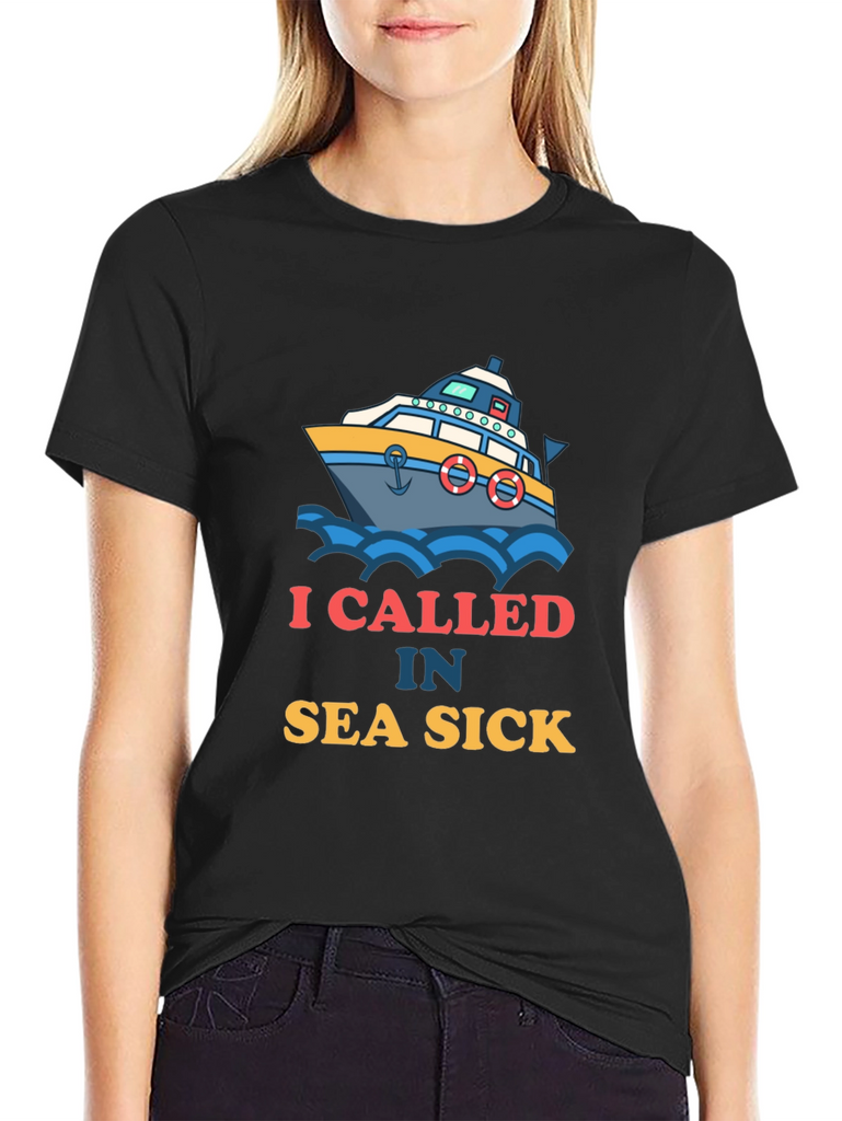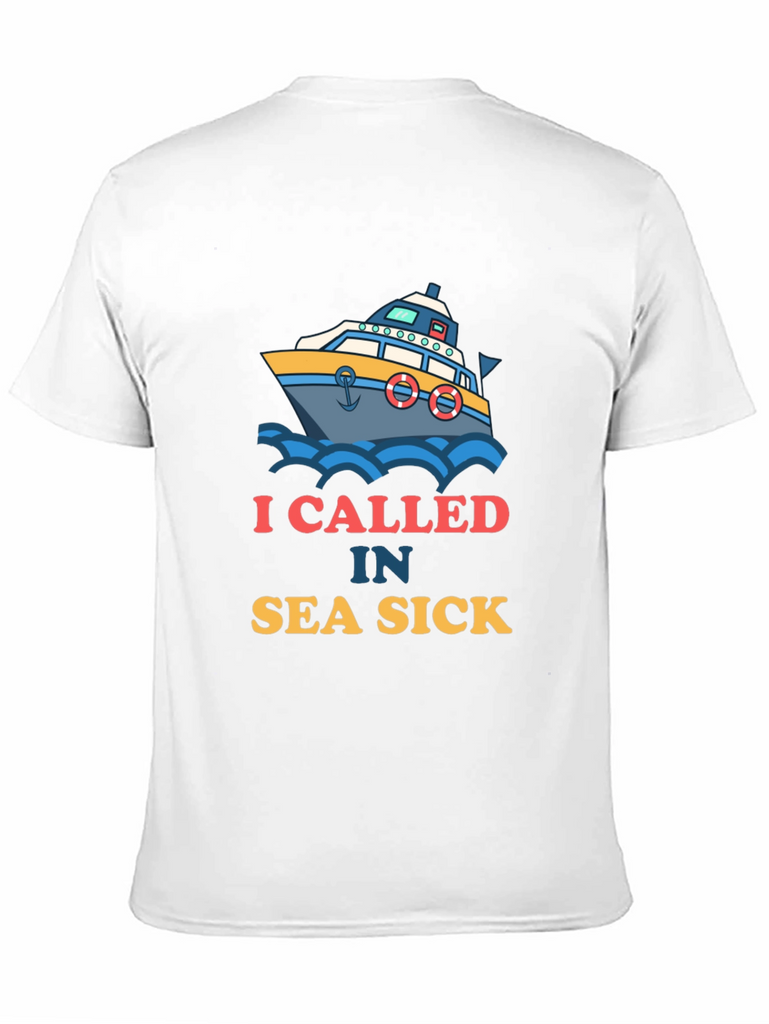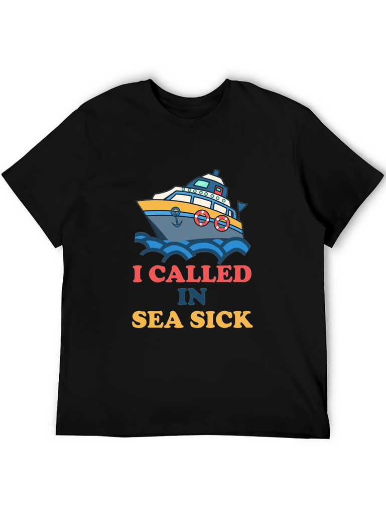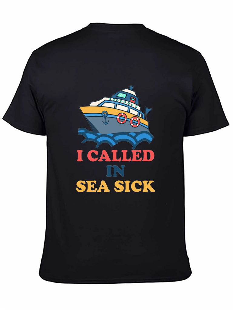 Ahoy there! This black t-shirt features a playful design of a boat amidst blue waves. Accompanying the graphic is the witty text "I CALLED IN SEA SICK". The design offers a fun take on maritime adventures and humor. Made from what appears to be soft, breathable fabric, this shirt ensures both comfort and style. It's ideal for casual outings, beach trips, or simply lounging around. Show off your love for the sea with this eye-catching tee, perfect for those who appreciate a good laugh and a nautical theme. A great conversation starter and a must-have addition to any wardrobe!