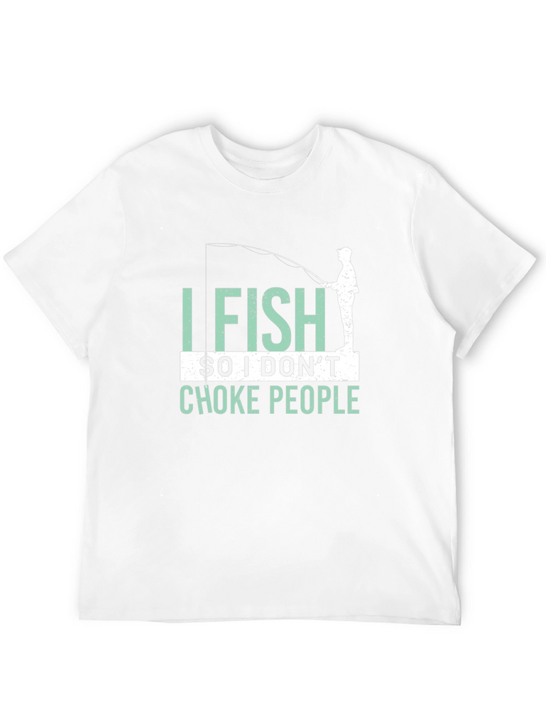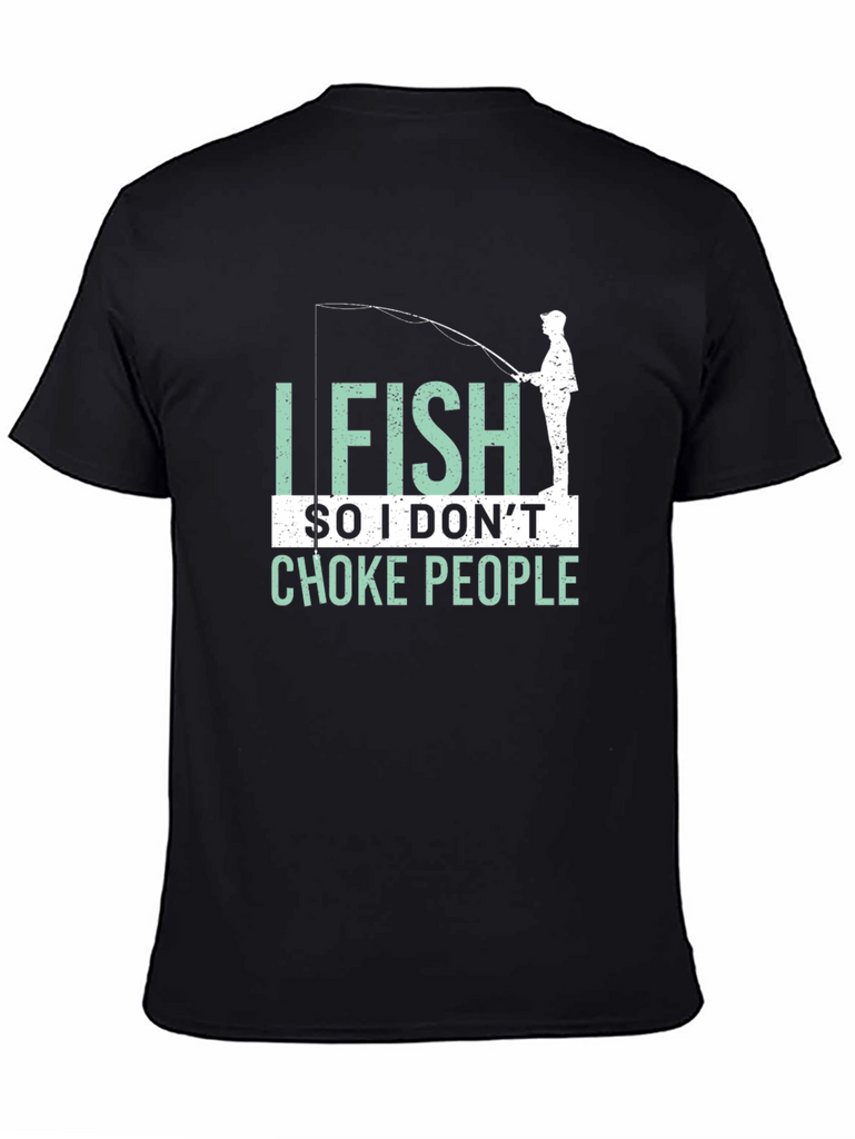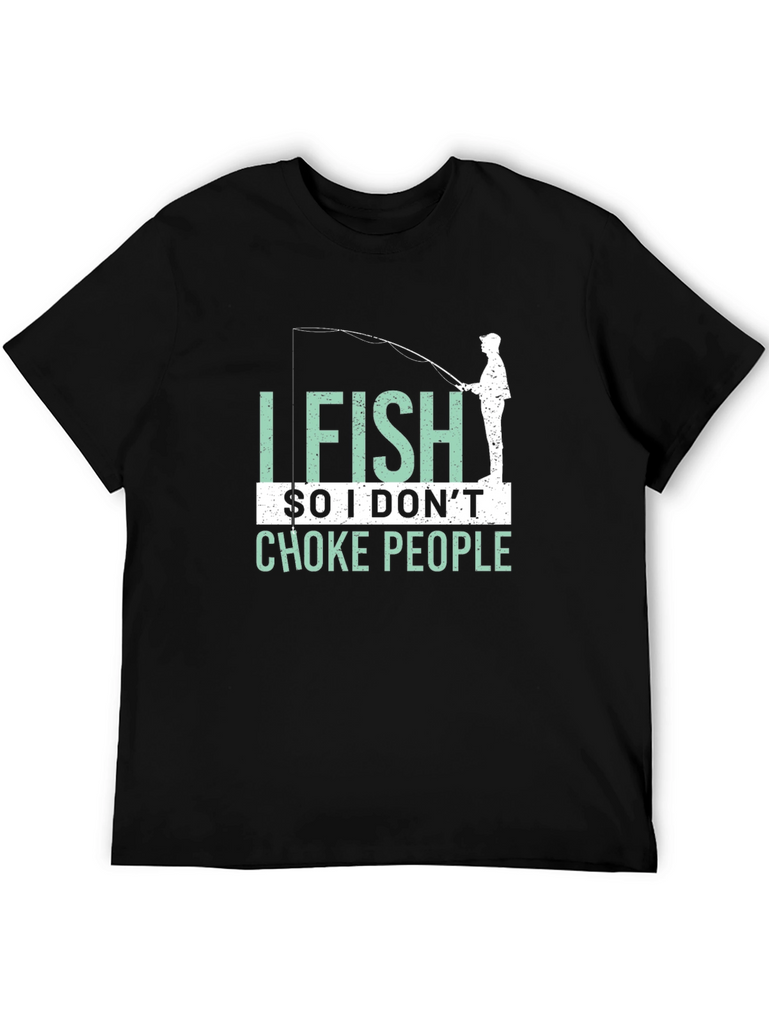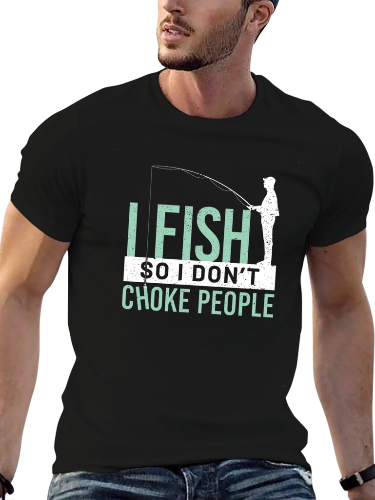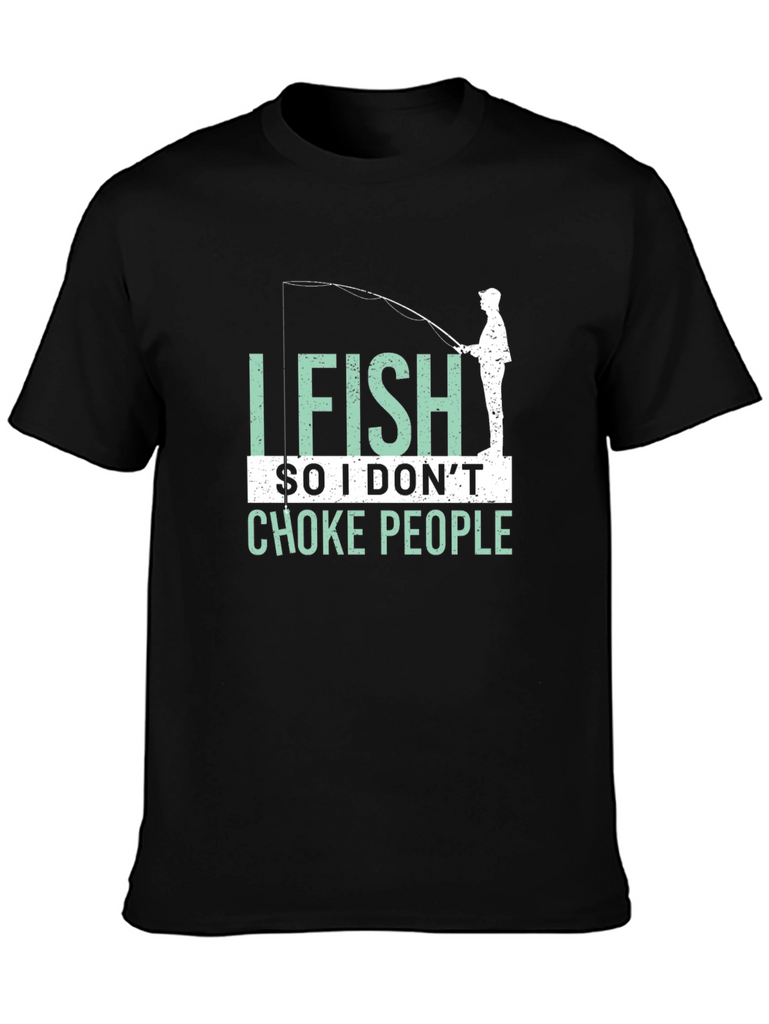Show off your love for fishing with this humorous graphic t-shirt! The black tee features a bold print with the phrase "I FISH SO I DON'T CHOKE PEOPLE" in a stylish, distressed font. The design also incorporates a silhouette of a fisherman casting his line, adding to the playful theme. Made from a comfortable fabric, this tee is perfect for casual wear, fishing trips, or as a fun gift for the angler in your life. Express your passion for fishing with a touch of humor!