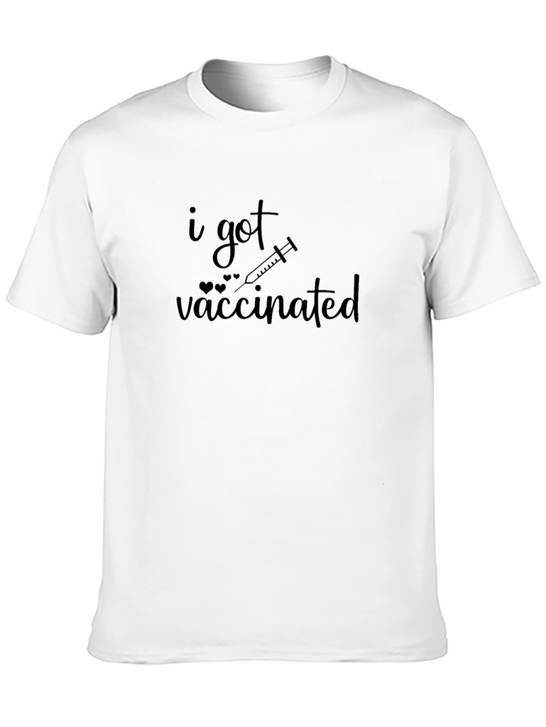 Show your support for vaccinations with this stylish black graphic tee. The shirt features the phrase "I got vaccinated" in a playful script font, accompanied by a syringe icon and heart embellishments. This short-sleeve tee is crafted from a soft, comfortable material, making it perfect for everyday wear. Express your health consciousness and encourage others to get vaccinated with this unique statement piece. Wear it proudly to doctor appointments, social gatherings, or casual outings. A meaningful and fashionable way to promote public health!