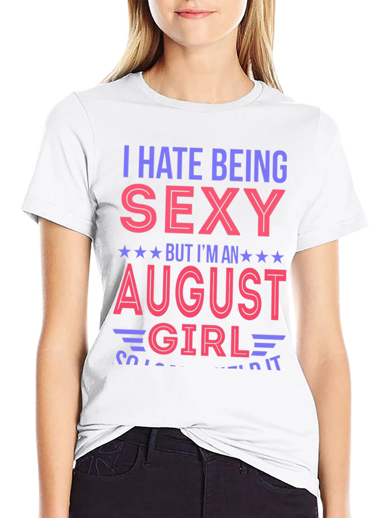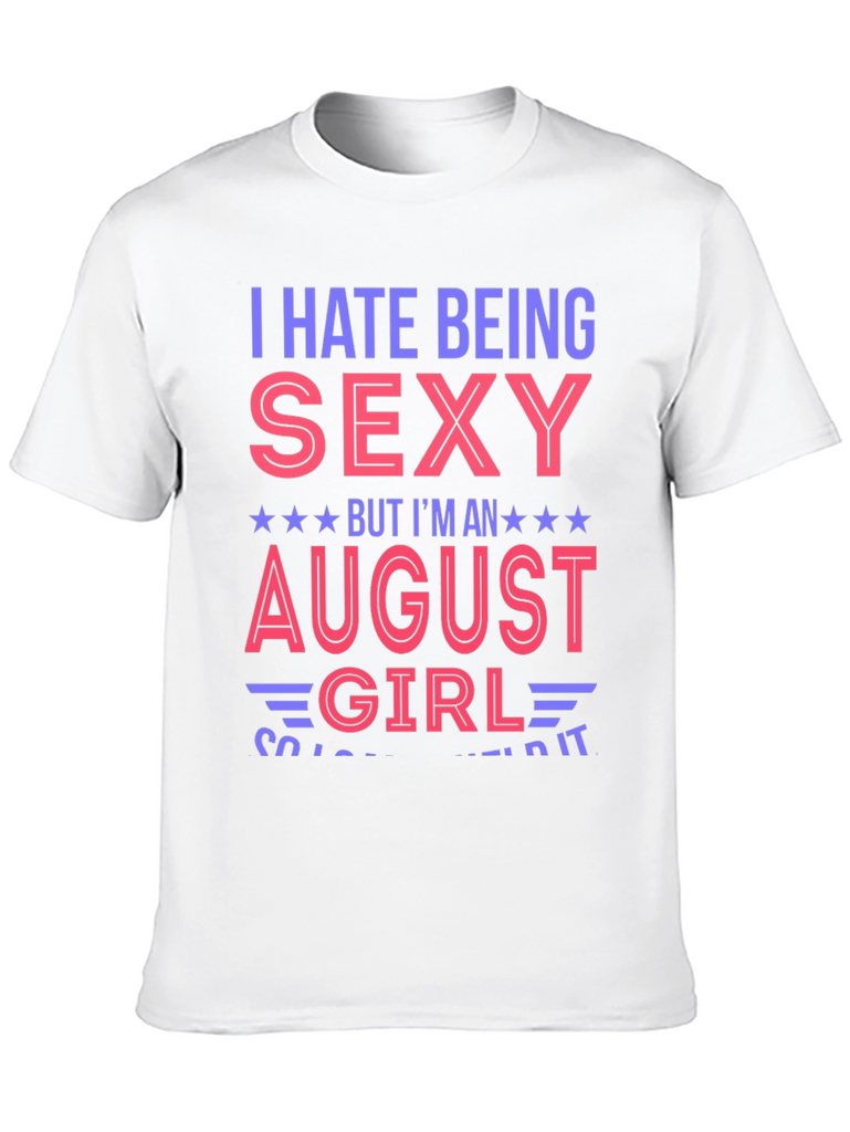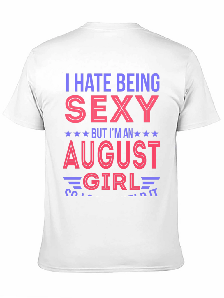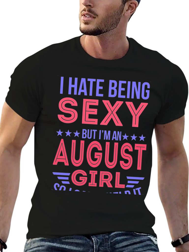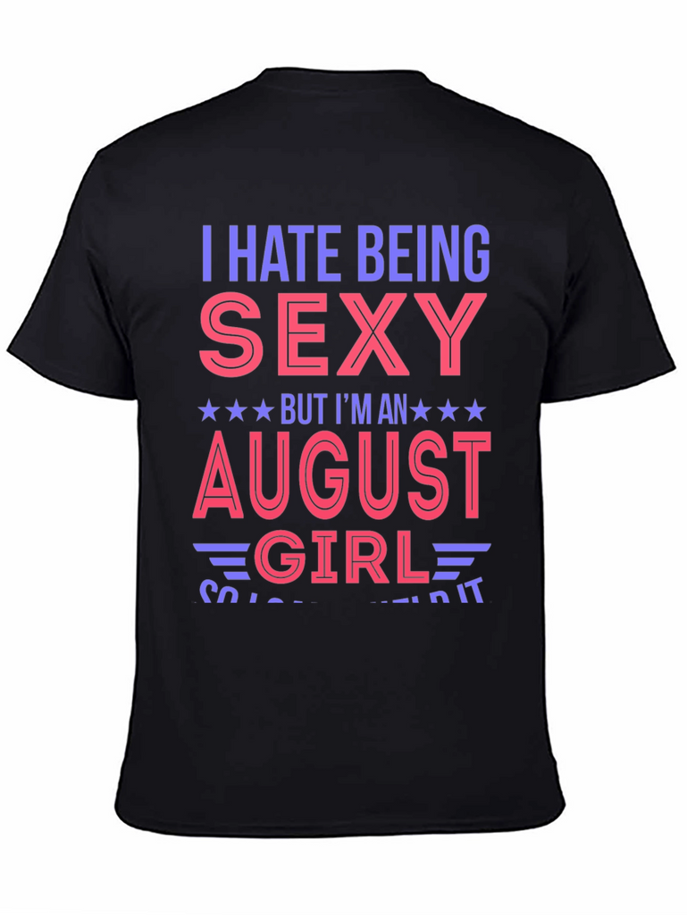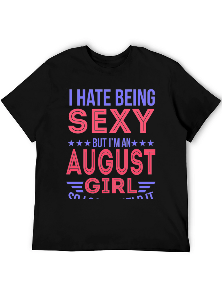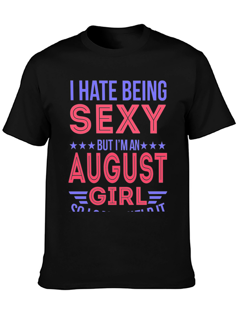 This stylish black t-shirt features a bold and playful design perfect for August-born individuals. The text "I HATE BEING SEXY" is prominently displayed in eye-catching pink and blue lettering, followed by "BUT I'M AN AUGUST GIRL" accompanied by decorative stars and lines. Made from a comfortable-looking fabric, this shirt is ideal for casual wear, birthday celebrations, or as a fun gift. Show off your August pride with this unique and attention-grabbing tee!