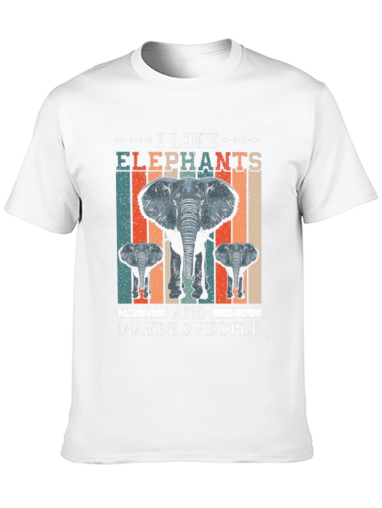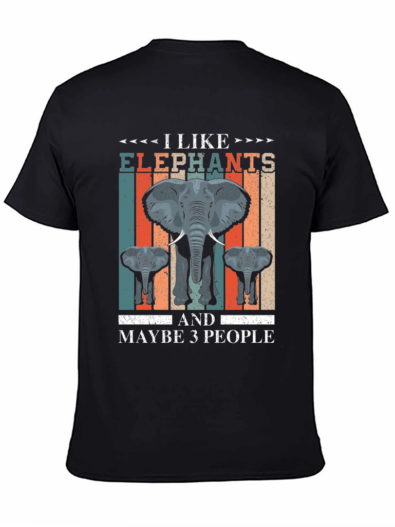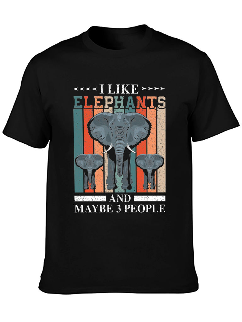 Show off your love for elephants with this unique and eye-catching t-shirt! Featuring a bold graphic with a large elephant and two smaller ones, set against a retro-inspired striped backdrop, this shirt is sure to make a statement. The phrase "I Like Elephants and Maybe 3 People" adds a touch of humor to this comfortable and stylish tee. Made from a soft, breathable fabric, this shirt is perfect for casual wear. Great for elephant enthusiasts or anyone who appreciates witty graphic tees. Wear it to the zoo, animal sanctuaries, or simply as a fun everyday outfit. Express your personality and love for these majestic creatures with this conversation-starting t-shirt.