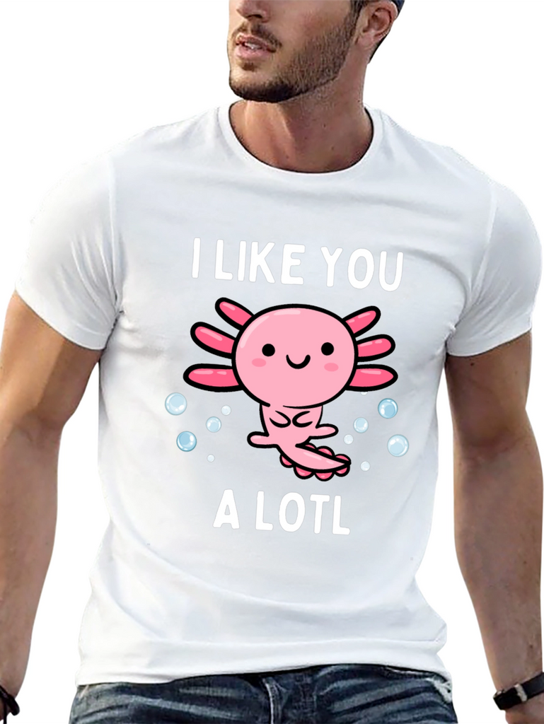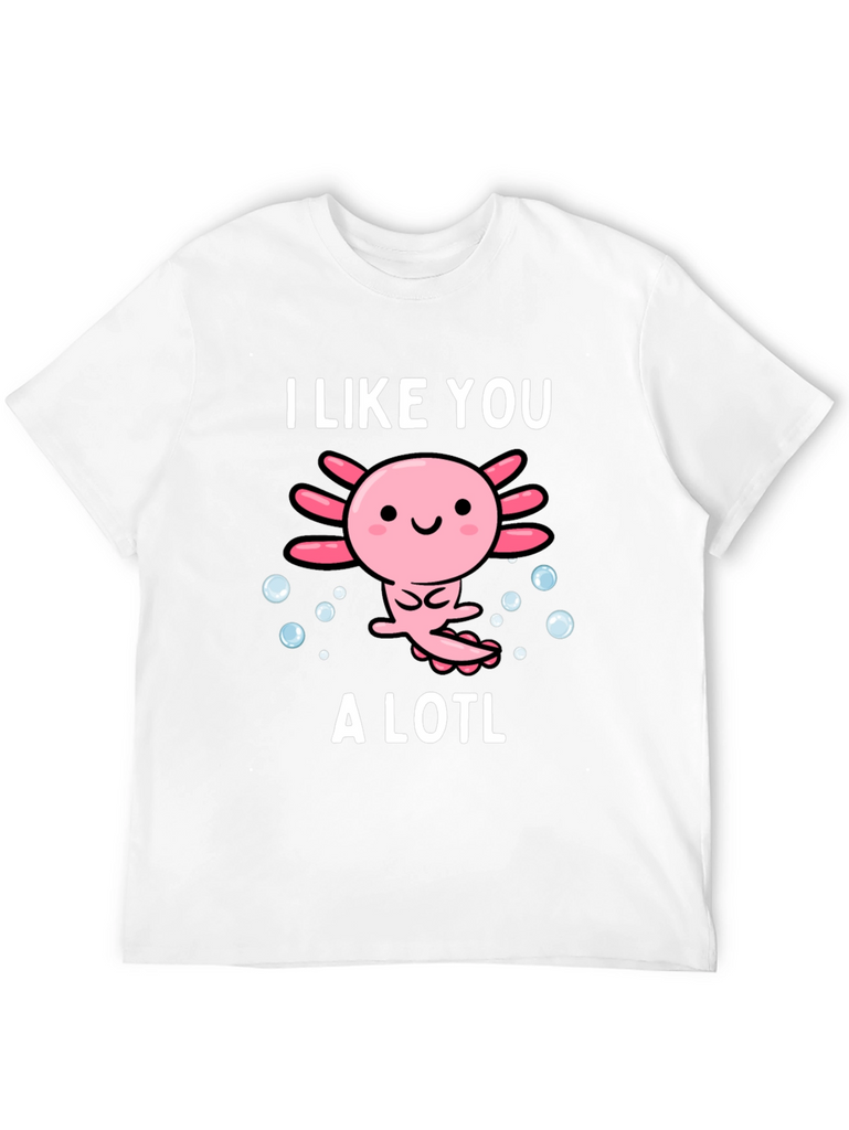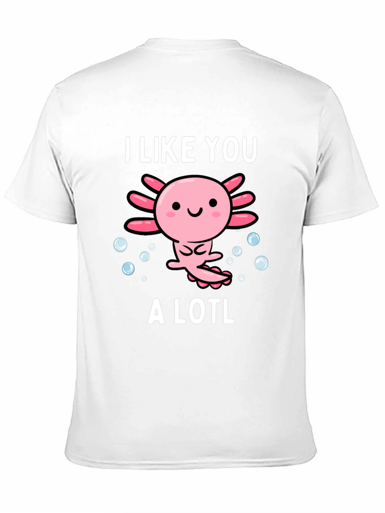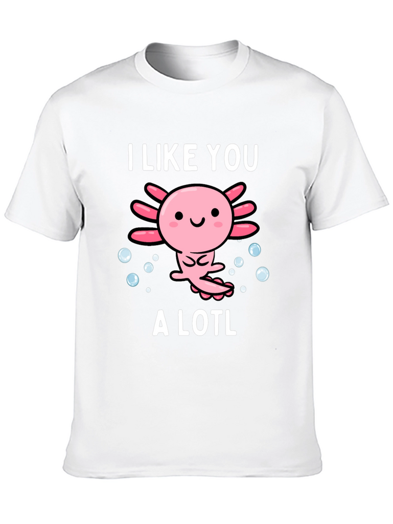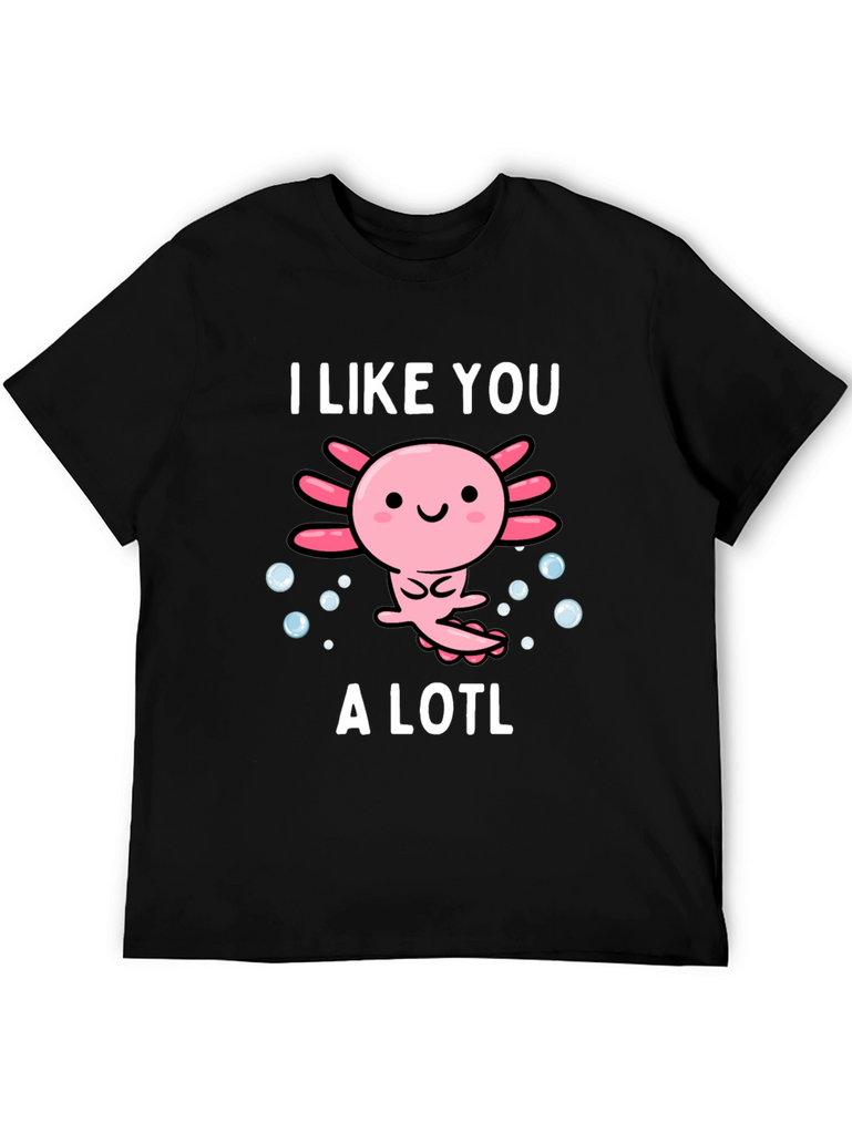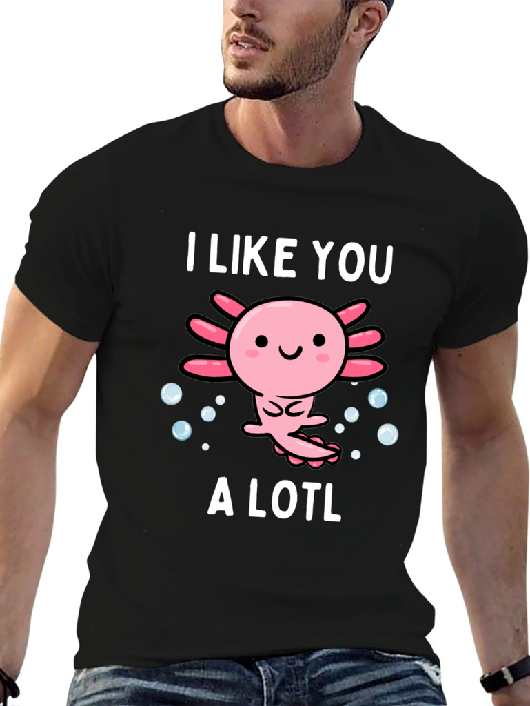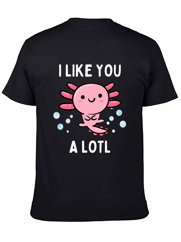 Show off your love for axolotls with this adorable graphic tee. The design features a cute cartoon axolotl surrounded by bubbles, accompanied by the text "I Like You A Lotl". This playful twist on words makes it a fun and unique piece. Made from soft, breathable material, this shirt is comfortable for everyday wear. Perfect for casual outings, lounging at home, or as a gift for the axolotl enthusiast in your life. The design is printed with high-quality ink to ensure vibrant colors that last. Add this charming tee to your wardrobe and spread some axolotl love!