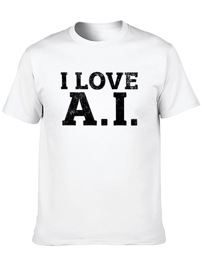 Show your love for artificial intelligence with this classic black t-shirt. The shirt features a bold "I LOVE A.I." print, making it a perfect conversation starter for tech enthusiasts. Made from comfortable, breathable cotton, this t-shirt is ideal for casual wear, tech conferences, or simply expressing your passion for A.I. The timeless design ensures it pairs well with jeans, shorts, or any casual bottoms. Grab yours today and let everyone know where your interests lie! Perfect for coders, engineers, or anyone fascinated by the future of technology.