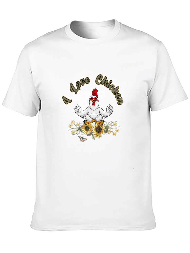 Embrace your love for chickens with this unique black t-shirt! Featuring a whimsical design of a chicken in a meditative pose, surrounded by sunflowers and the phrase "I Love Chicken", this tee is sure to turn heads. The design is printed on a comfortable, casual fit tee, perfect for everyday wear. Made from a soft, breathable fabric, this shirt ensures both style and comfort. Show off your fun personality and love for feathered friends with this eye-catching t-shirt! Ideal for casual outings, chicken enthusiasts, or anyone with a quirky sense of humor.