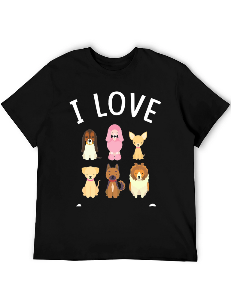 Show your love for dogs with this cute and stylish black t-shirt. Featuring a variety of adorable dog breeds in a cartoon style, this tee is perfect for any dog lover. The shirt is made from a comfortable fabric, perfect for everyday wear. This fun design will certainly be a conversation starter, whether you're at the park, running errands, or just relaxing at home with your furry friends. It's a great way to express your passion for animals and add a touch of playful charm to your wardrobe. Order yours today and wear your love for dogs with pride!
