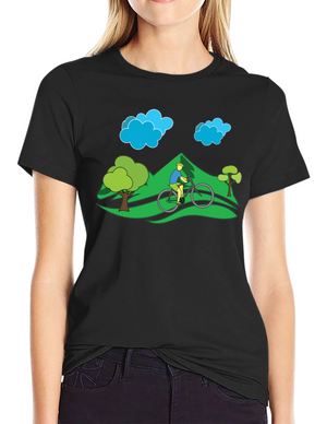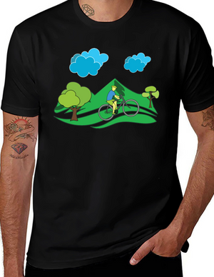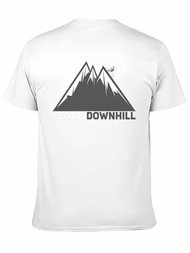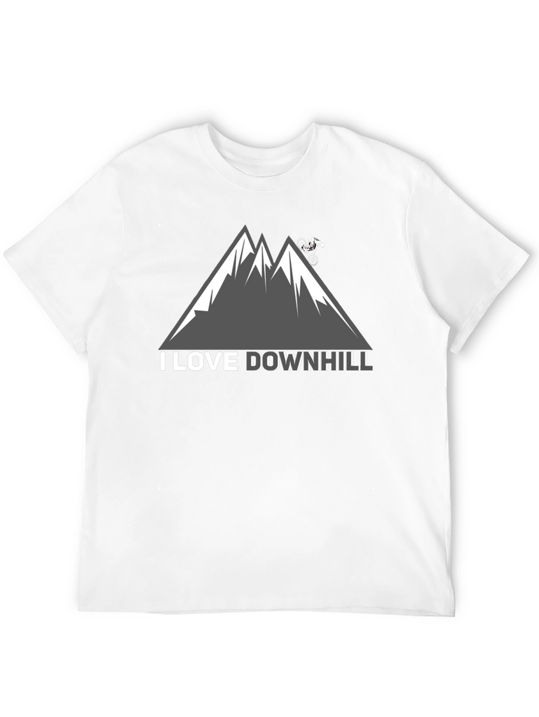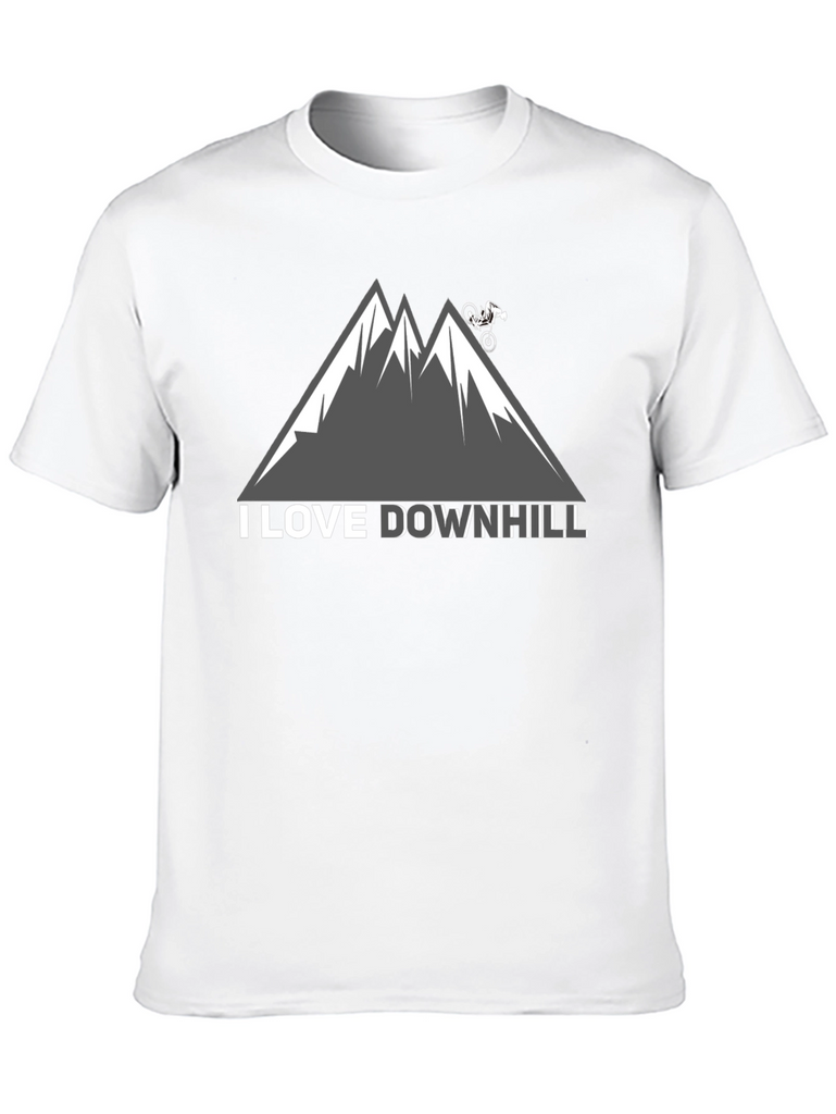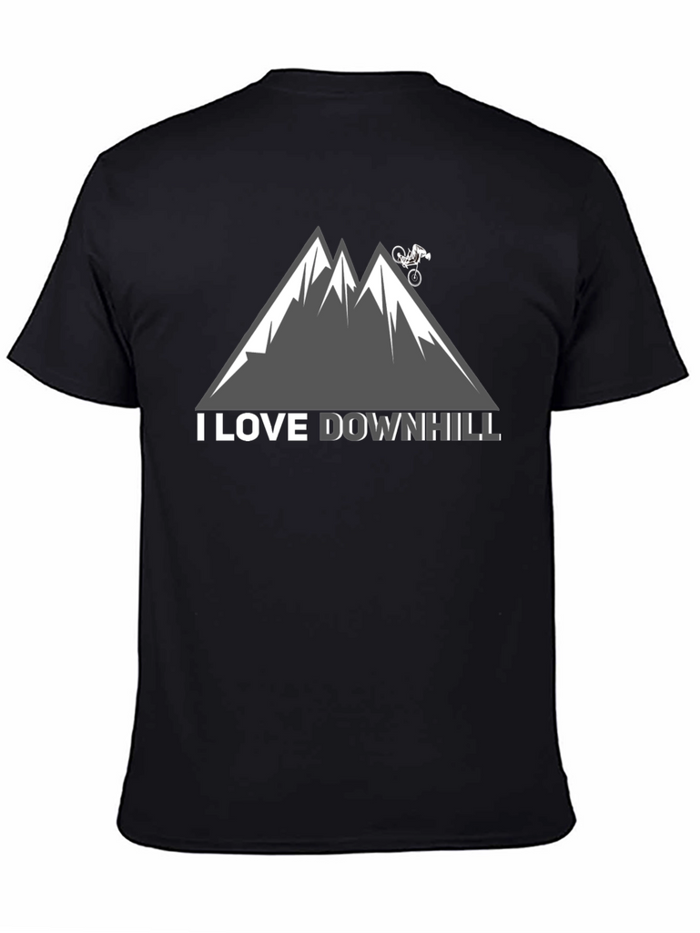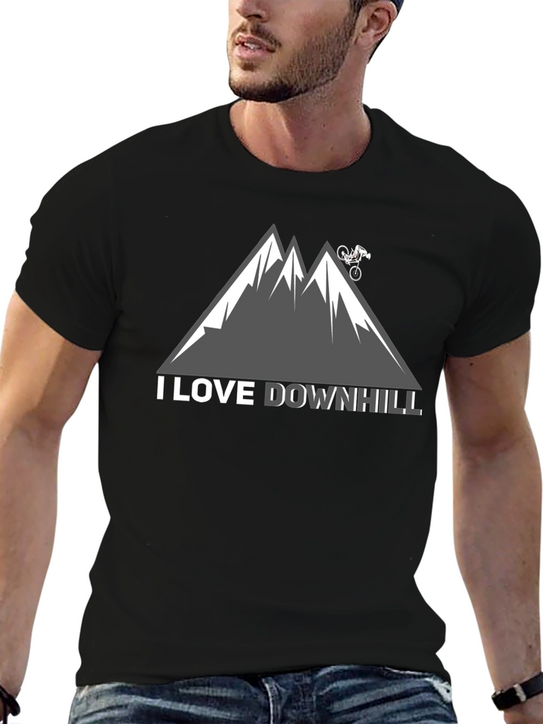 Show your passion for downhill mountain biking with this stylish black t-shirt. The design features a bold graphic of snow-capped mountains with a biker catching air at the summit. Below the mountain artwork is the phrase "I LOVE DOWNHILL", expressing your love for this extreme sport. The t-shirt is made of a soft fabric that appears comfortable to wear, making it perfect for casual outings, bike rides, or just relaxing at home. It would make a great gift for any mountain biking enthusiast. This shirt lets you display your love for the sport with a distinctive and eye-catching design. Get yours today and hit the trails in style!