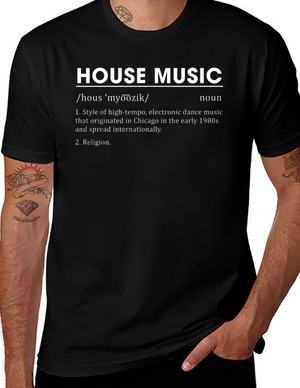 Show your love for house music with this stylish black t-shirt! The design features a bold "I" graphic, a gradient blue heart, a house icon, and musical notes, all printed in high-quality white on a comfortable black tee. Perfect for music lovers, DJs, or anyone who appreciates the house music scene. This unique t-shirt is sure to turn heads and start conversations. Made from soft, breathable fabric, it's ideal for everyday wear, concerts, or club nights. Get yours today and let the world know where your heart belongs!