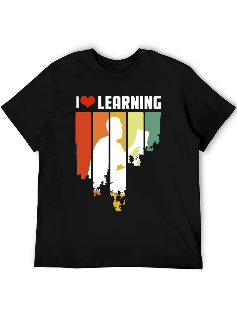 Show your passion for knowledge with this eye-catching black graphic T-shirt. The design features the phrase "I Love Learning" with a heart symbol, over a retro-inspired multi-color block graphic. The graphic shows a silhouette of a person reading a book. The design has a distressed, puzzle-piece look at the bottom of the image. Made from comfortable fabric, this T-shirt is perfect for casual wear, studying, or making a statement. Ideal for students, educators, and lifelong learners. Get yours today!