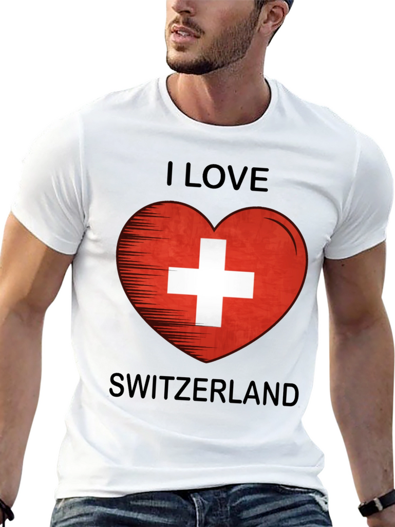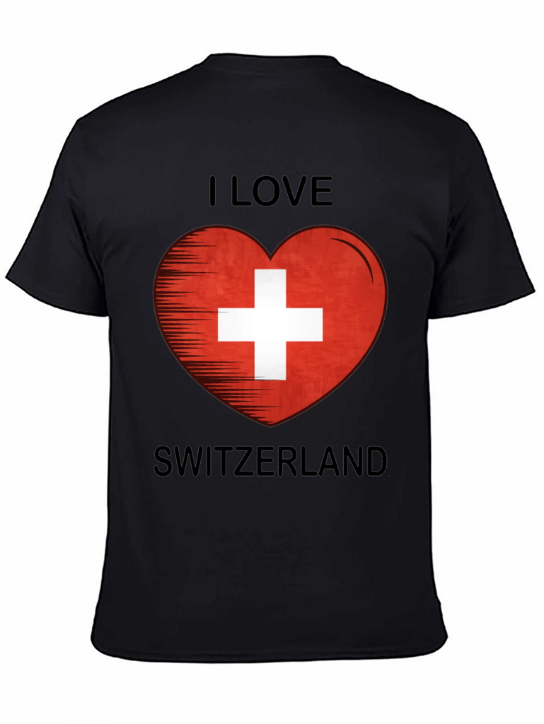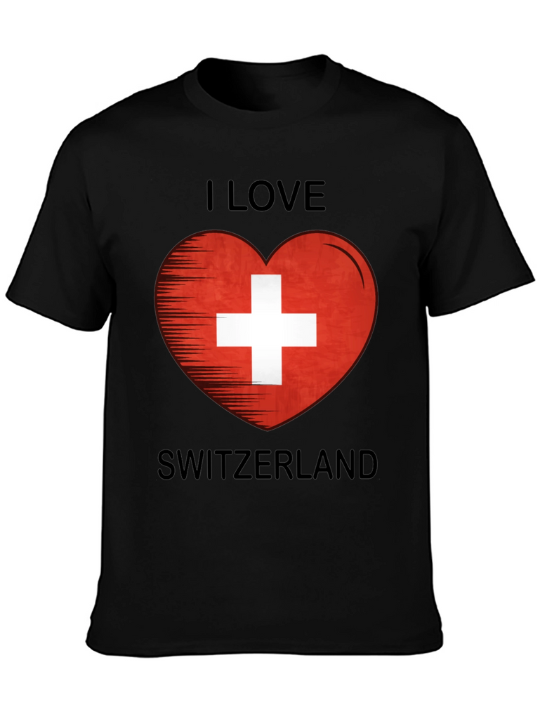 Show your love for Switzerland with this stylish graphic t-shirt. The design features a heart filled with the Swiss flag's red and white cross emblem, accompanied by 'I LOVE SWITZERLAND' text. Made from a comfortable, dark-colored fabric, this tee is perfect for casual wear, travel, or as a souvenir. The heart graphic features a distressed look that adds character. Stand out with this unique, patriotic statement piece!