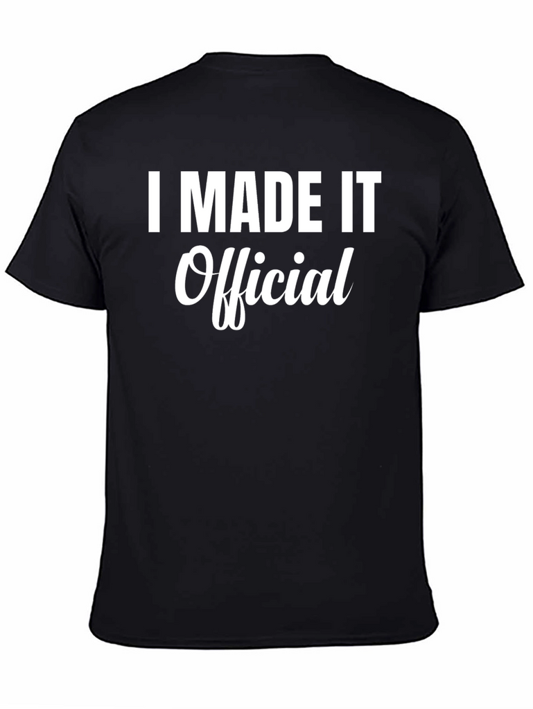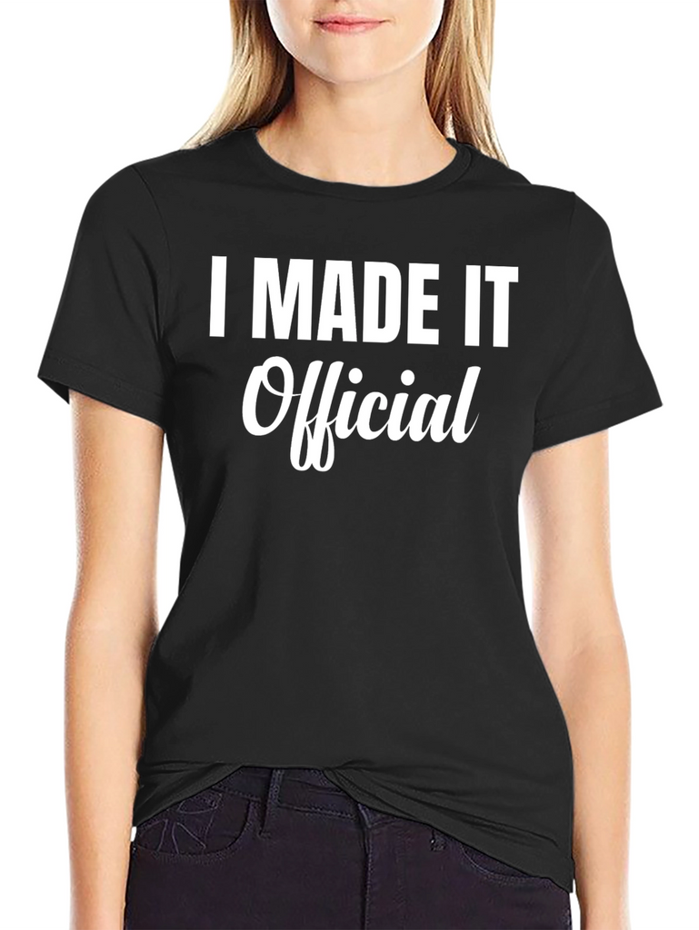 Celebrate your achievement with this bold, black t-shirt featuring the witty phrase 'I Made It Official' in crisp, white lettering. The classic fit and comfortable fabric (likely cotton or a cotton blend) make it ideal for everyday wear. The playful slogan is perfect for announcing a graduation, new job, or any other milestone. Dress it up with jeans or dress it down with comfy shorts for an easy, versatile style.