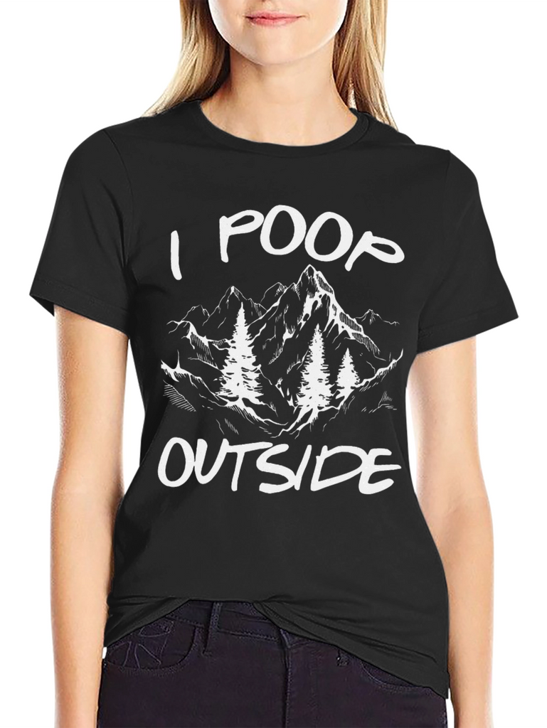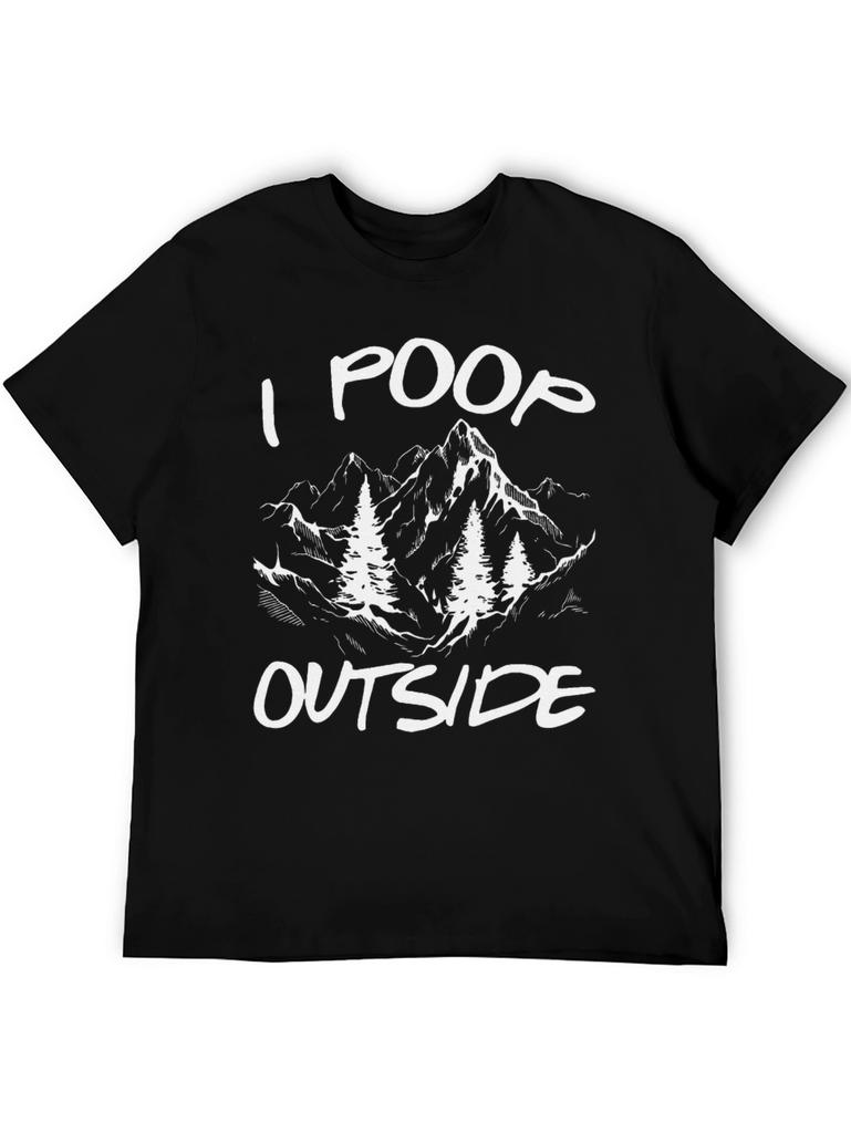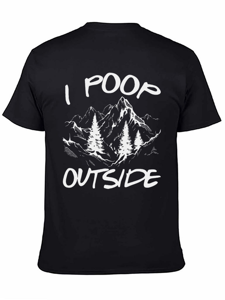 This black t-shirt features a humorous message paired with a nature-inspired design. The words "I POOP OUTSIDE" are prominently displayed above and below a graphic of mountains and trees. Made from a comfortable-looking fabric, this shirt is ideal for hikers, campers, or anyone who enjoys spending time in the great outdoors with a sense of humor. It's a fun and unique way to express your love for nature. The print is in white ink and contrasts against the black color of the garment. This tee is a good conversation starter and is sure to bring some laughs to any occasion. Its casual style makes it suitable for everyday wear.